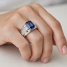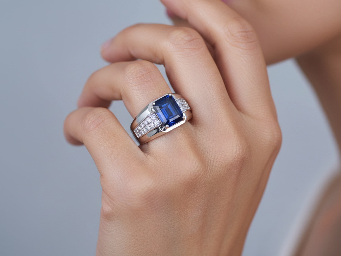 The diamonds, graded D–F color (Exceptional White) and VS clarity, highlight the sapphire’s deep blue tone with radiant brilliance and sophistication.