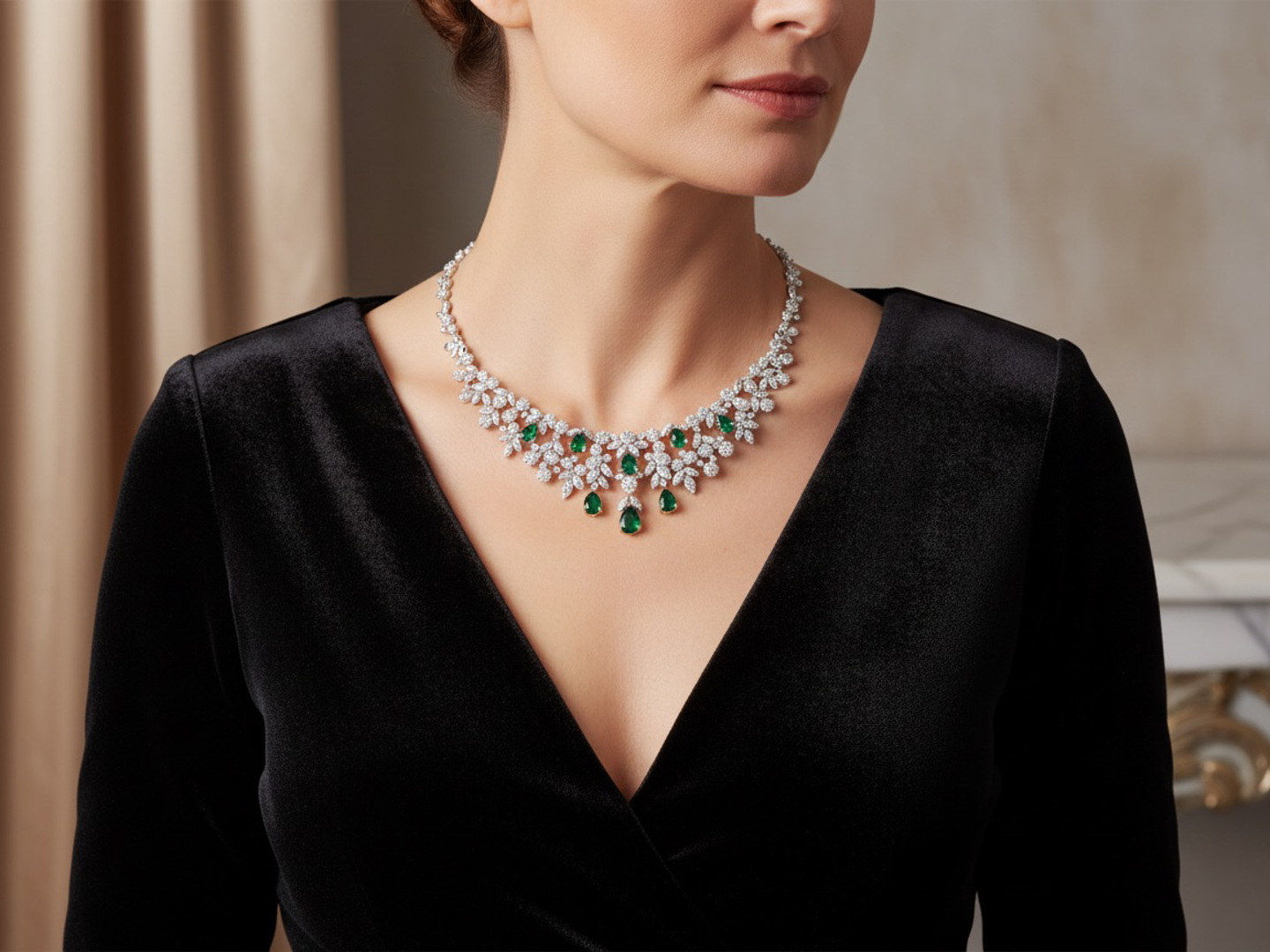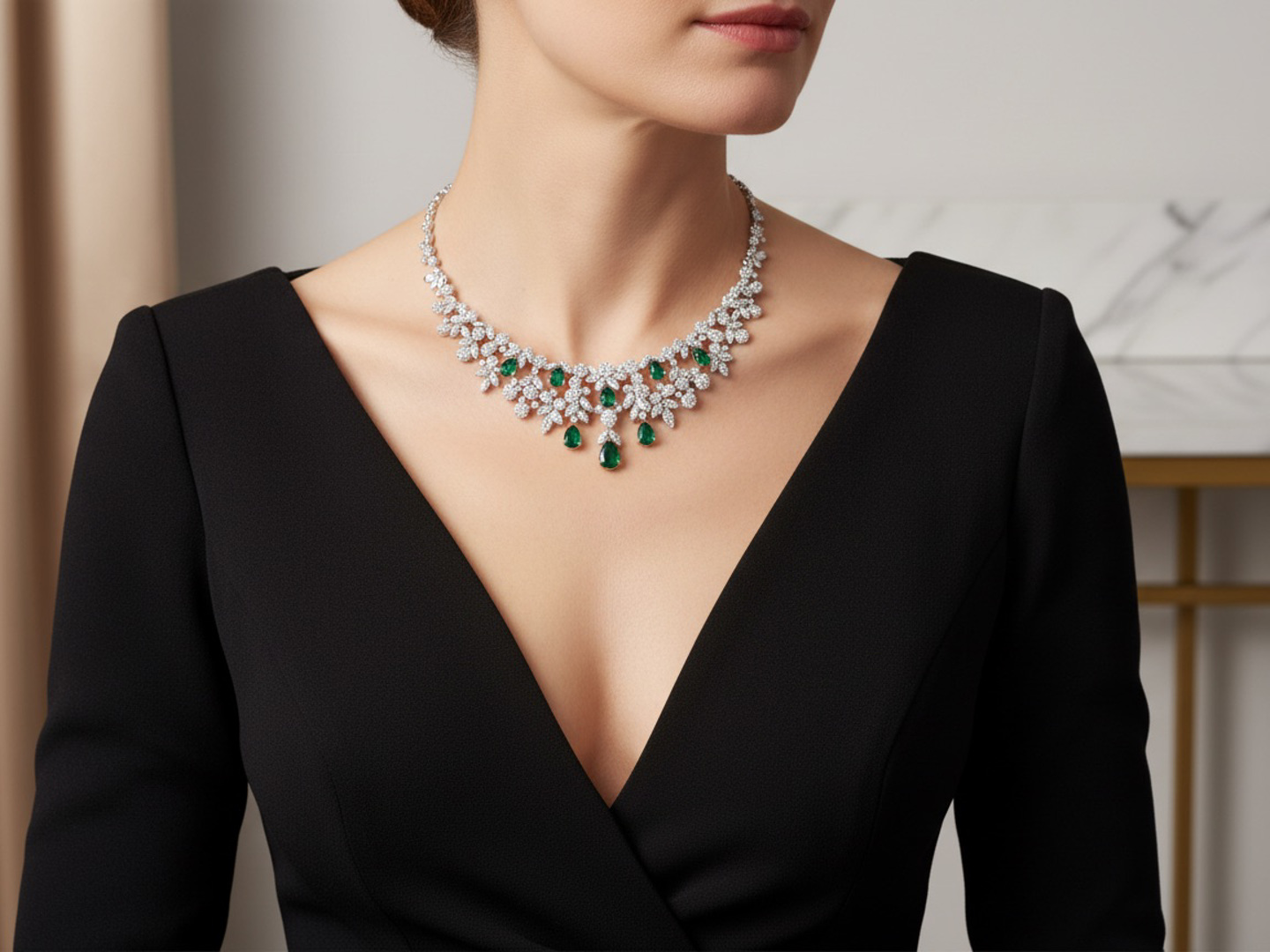 The diamonds, graded F–G color and VS clarity, highlight the emeralds’ vibrant hue with breathtaking brilliance.
