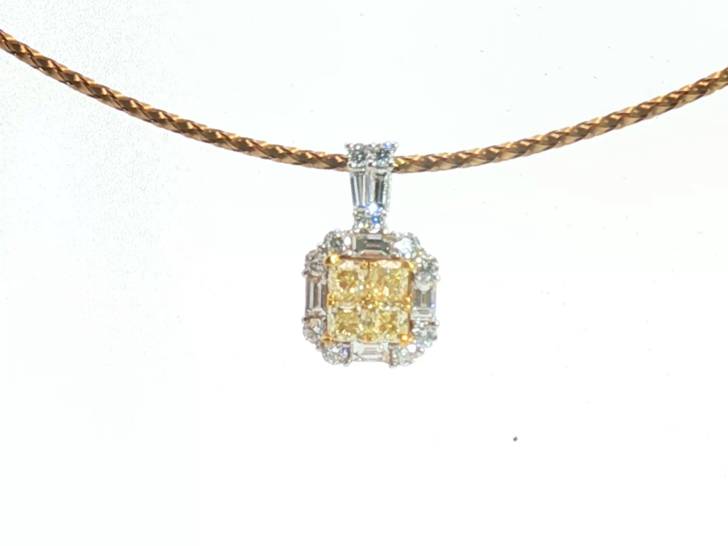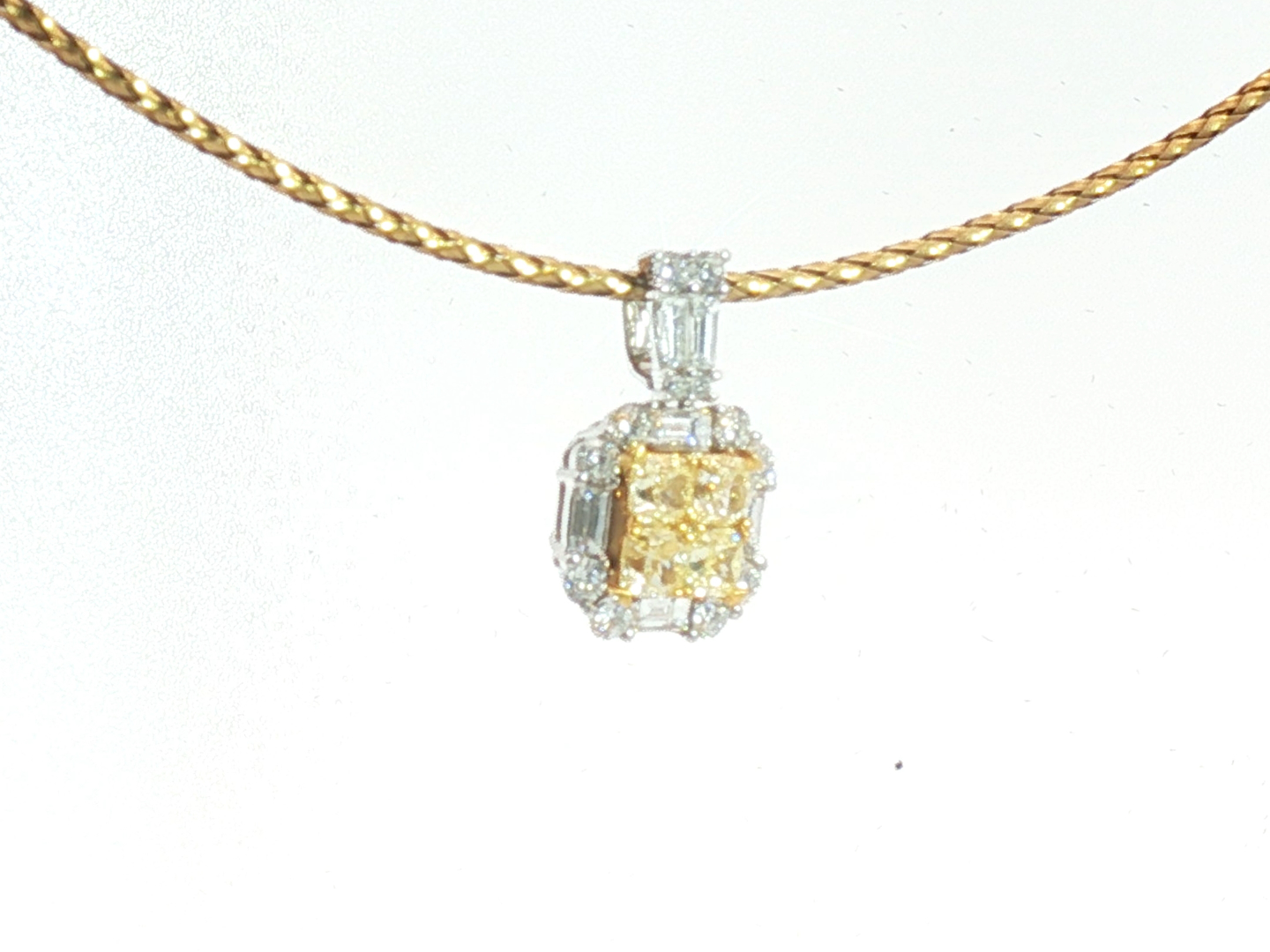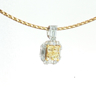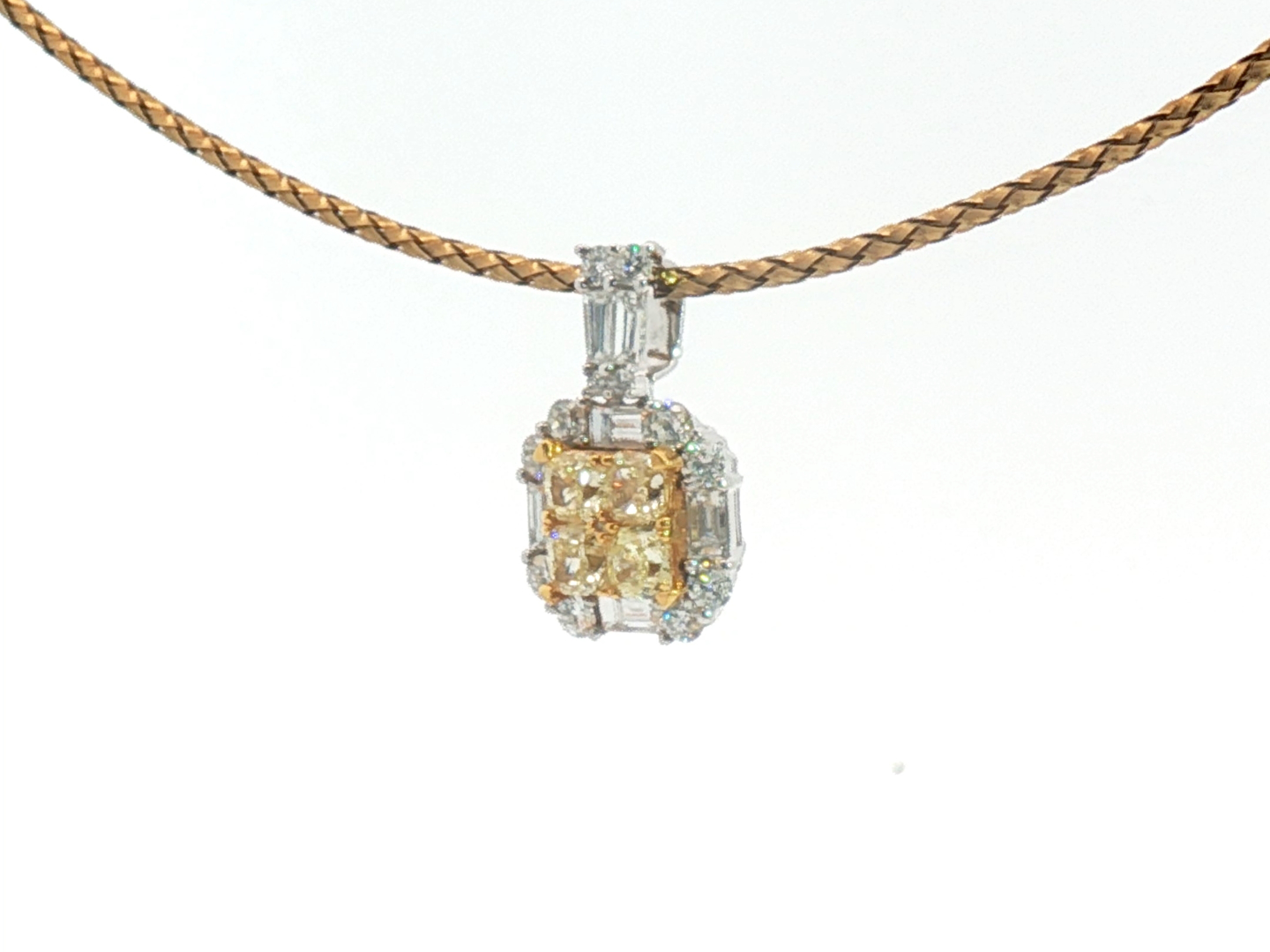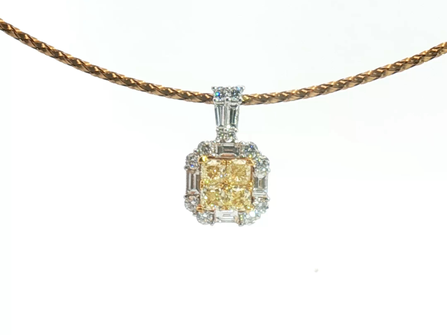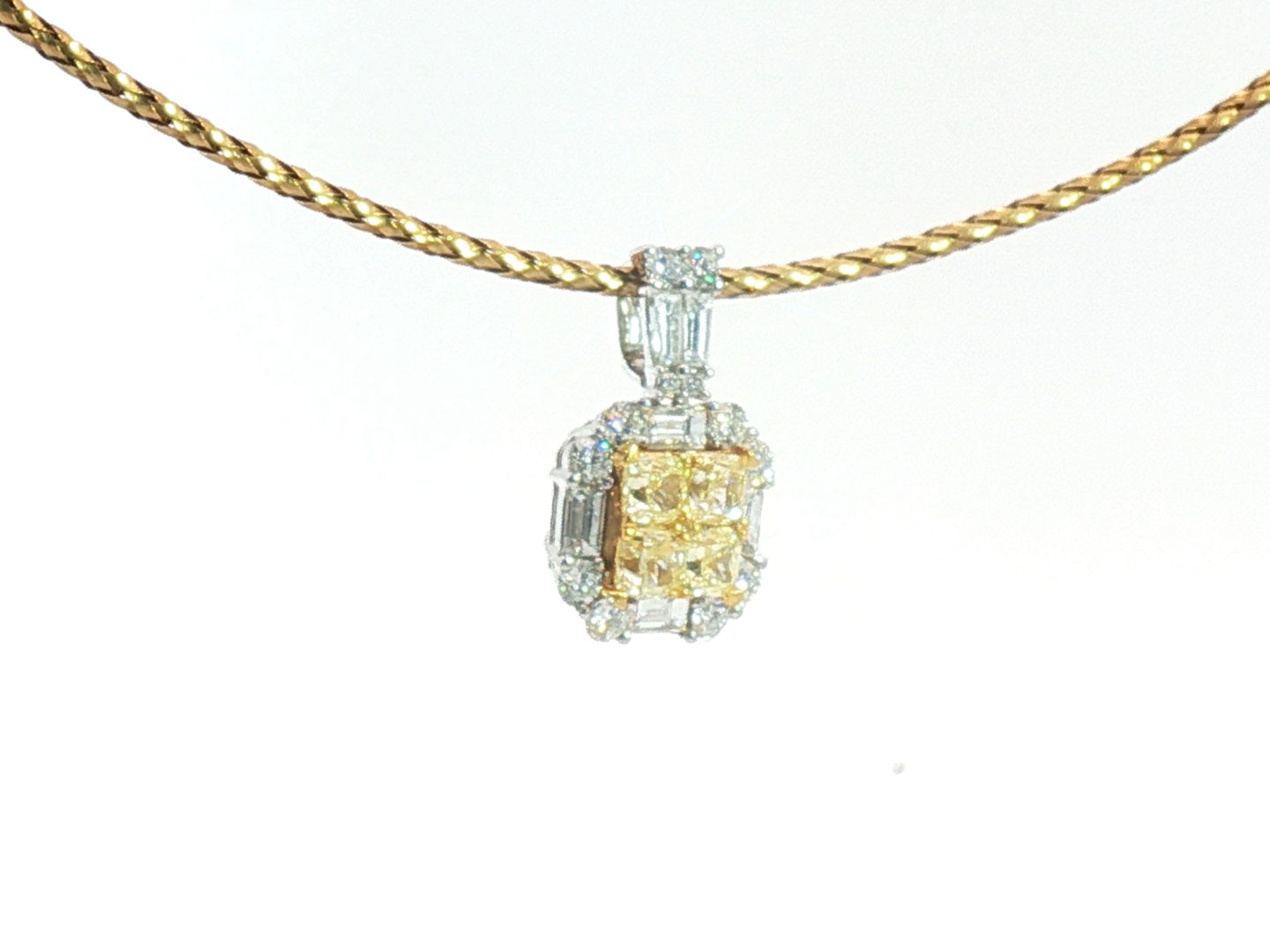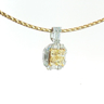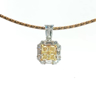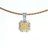 Exquisite necklace with pendant featuring four princess-cut Fancy Light Yellow diamonds totaling approximately 1 carat, radiating a gentle golden hue. The design is surrounded by 21 brilliant-cut white diamonds with a combined weight of about 0.80 carat, graded F–G color (Exceptional White) and VS clarity. The refined contrast between warm yellow tones and crisp white brilliance creates a harmonious and timeless piece of exceptional elegance. Set in 18-karat white gold (hallmarked 750).