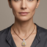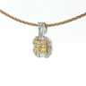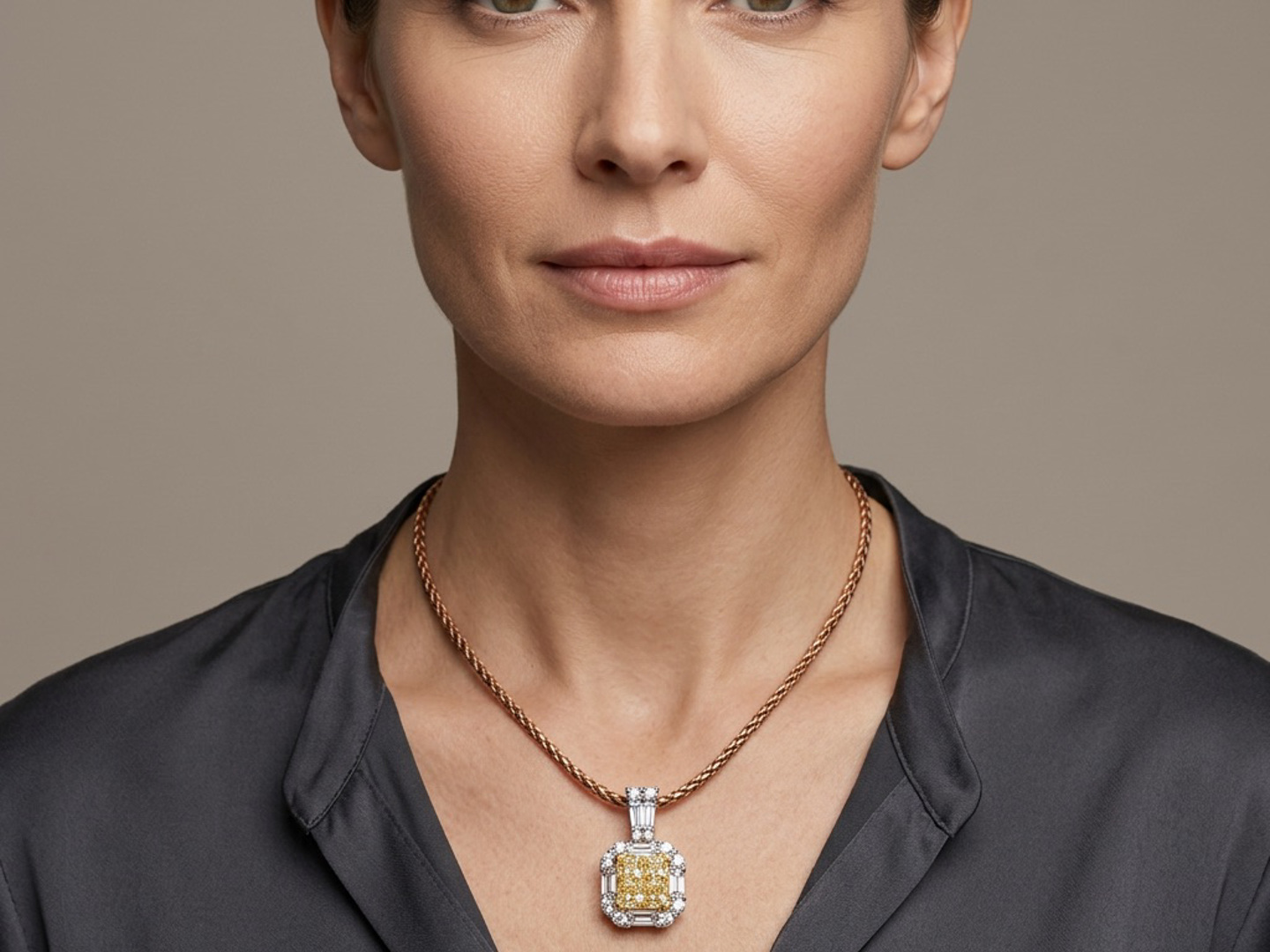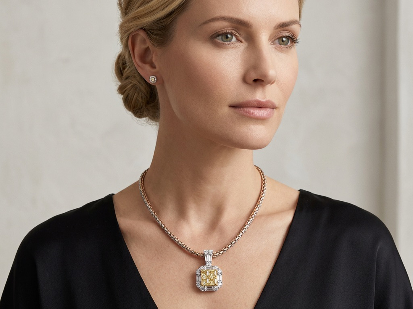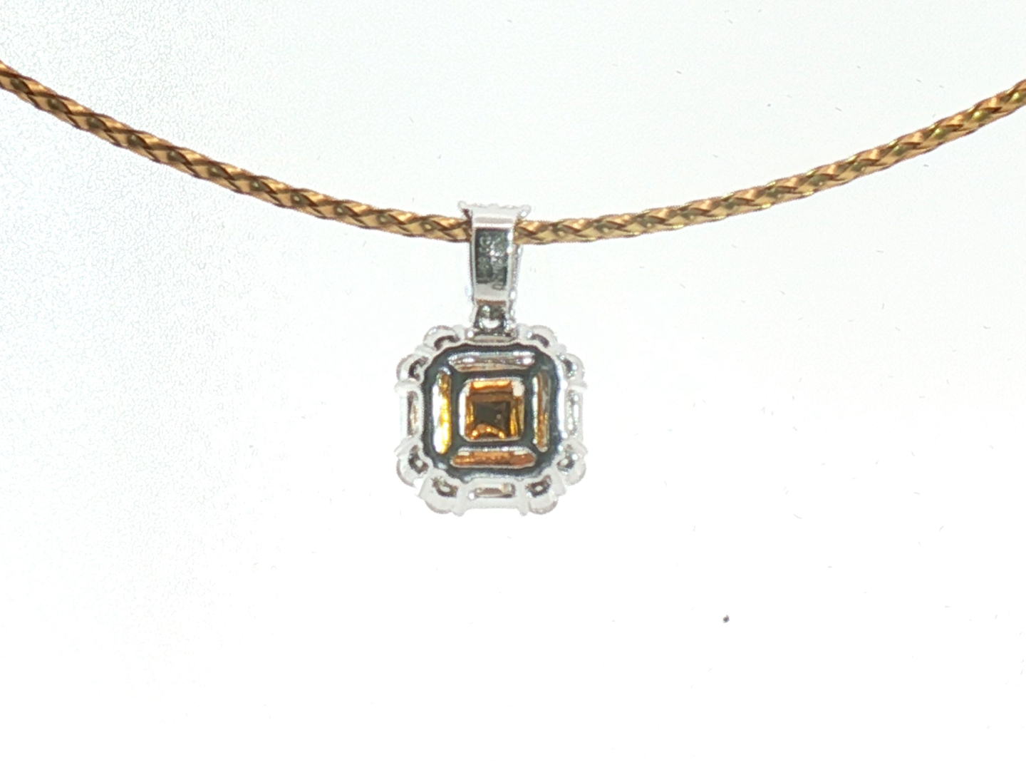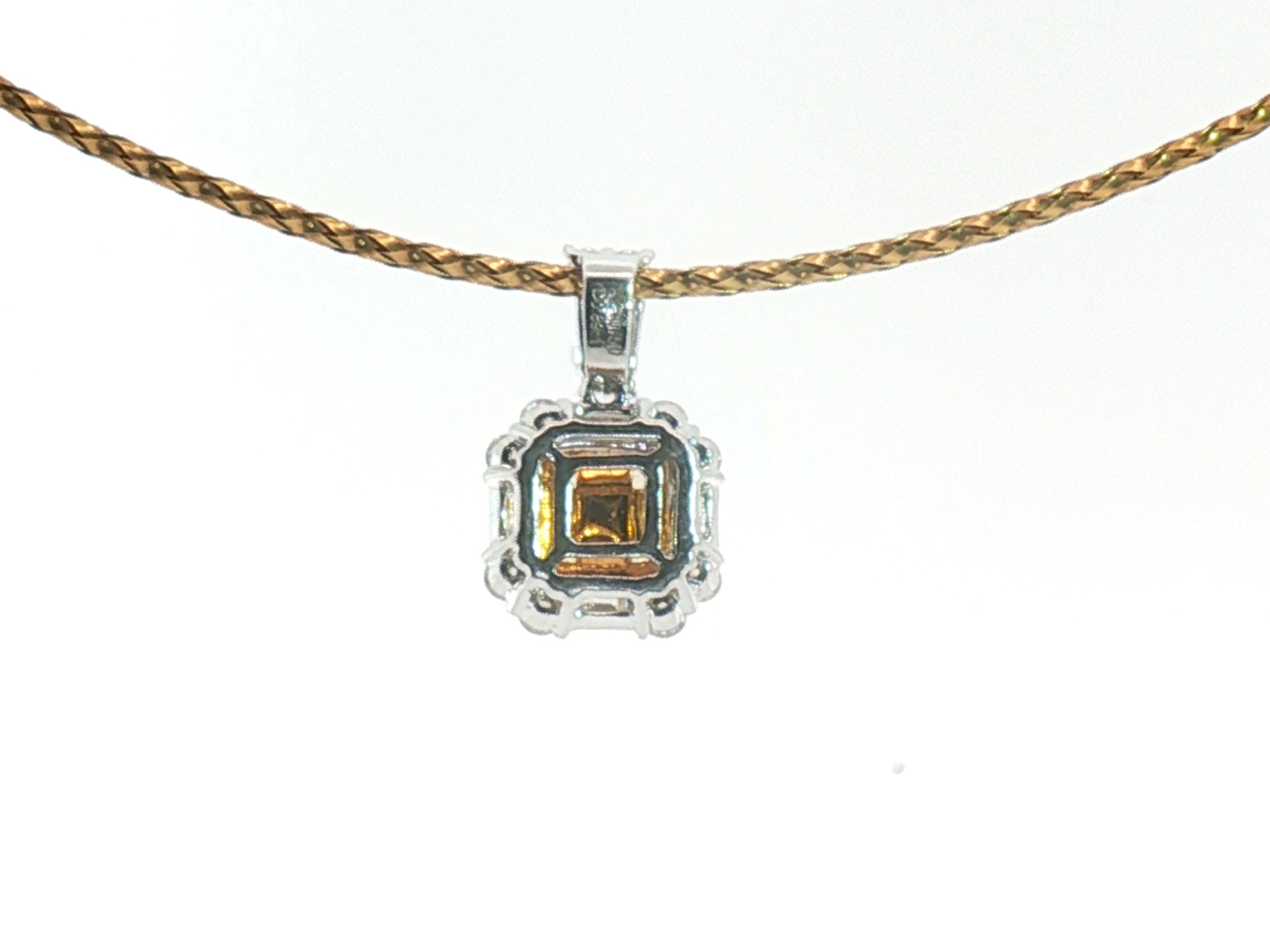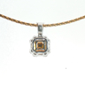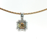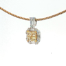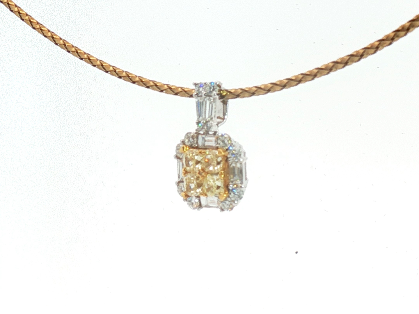 Exquisite necklace with pendant featuring four princess-cut Fancy Light Yellow diamonds totaling approximately 1 carat, radiating a gentle golden hue. The design is surrounded by 21 brilliant-cut white diamonds with a combined weight of about 0.80 carat, graded F–G color (Exceptional White) and VS clarity. The refined contrast between warm yellow tones and crisp white brilliance creates a harmonious and timeless piece of exceptional elegance. Set in 18-karat white gold (hallmarked 750).