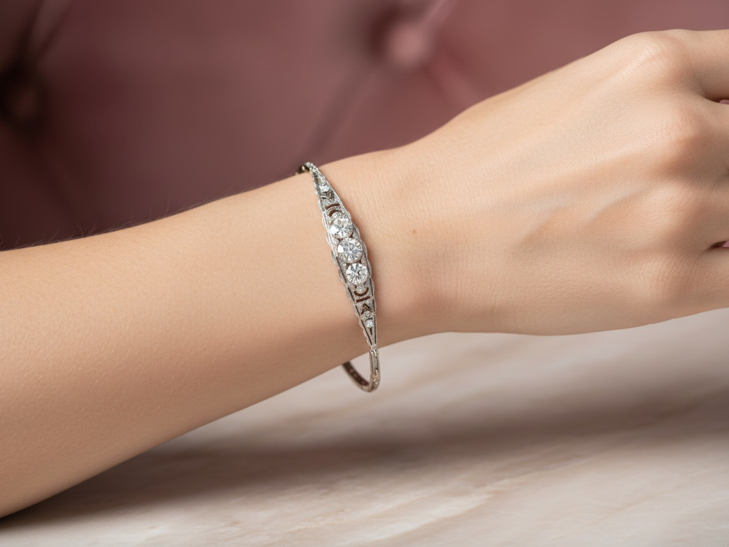 Charming Victorian-style bracelet, dating from around 1880, set with five white old-cut diamonds that radiate the soft, romantic glow characteristic of 19th-century craftsmanship.