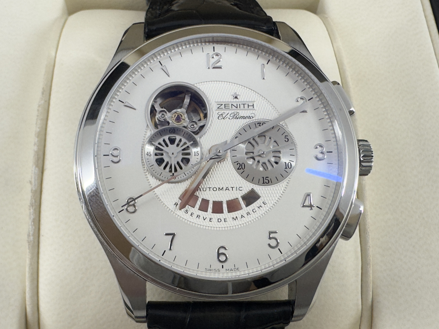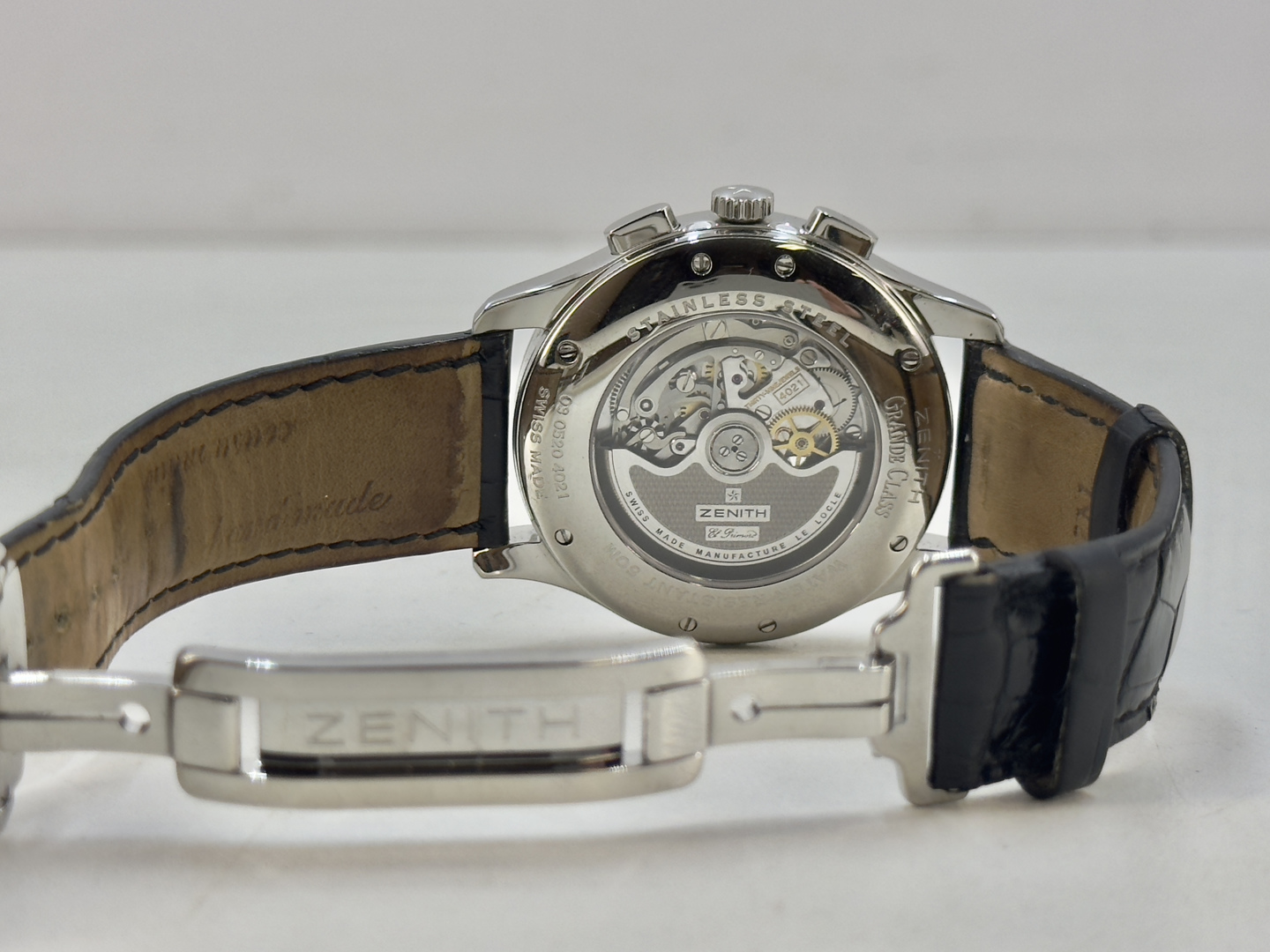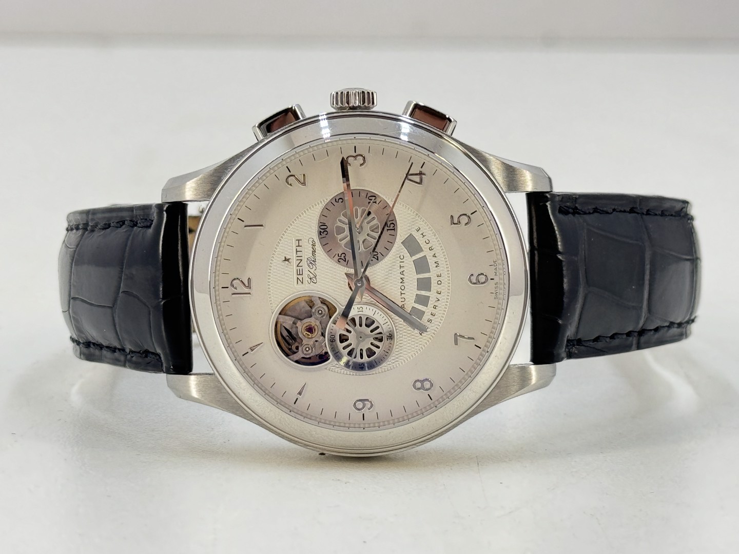 Zenith El Primero Grande Class Open Automatic wristwatch in perfect condition. Silver guilloche dial with chronograph functions, power reserve indicator, as well as an opening displaying the movement. Automatic movement; calibre 4021. 44mm case diameter. Sapphire crystal. Featured on an original black leather Zenith strap with original deployment buckle. Reference #: 03.0520.4021. Including the original box and user’s manual + service papers from 20/11/25