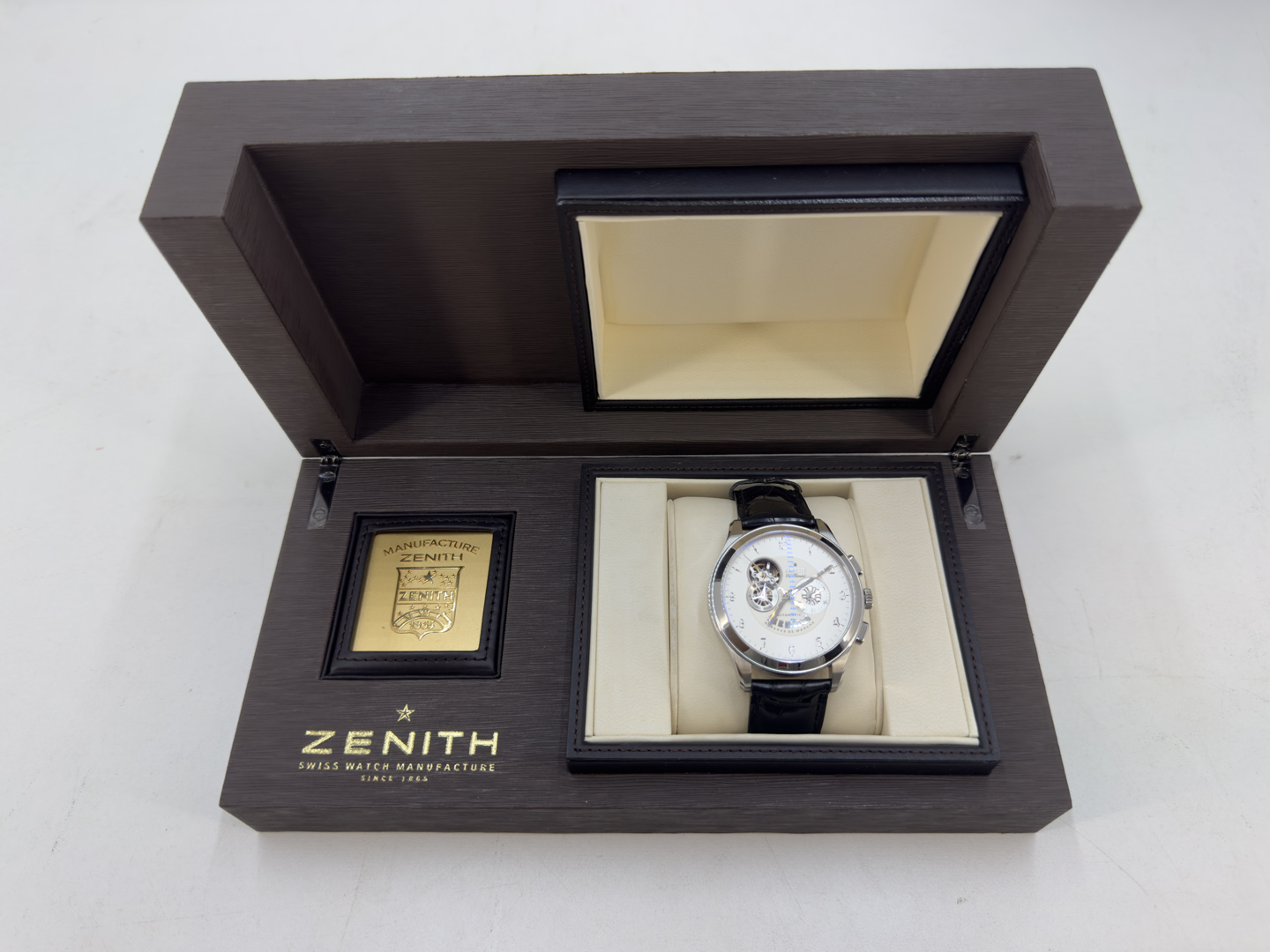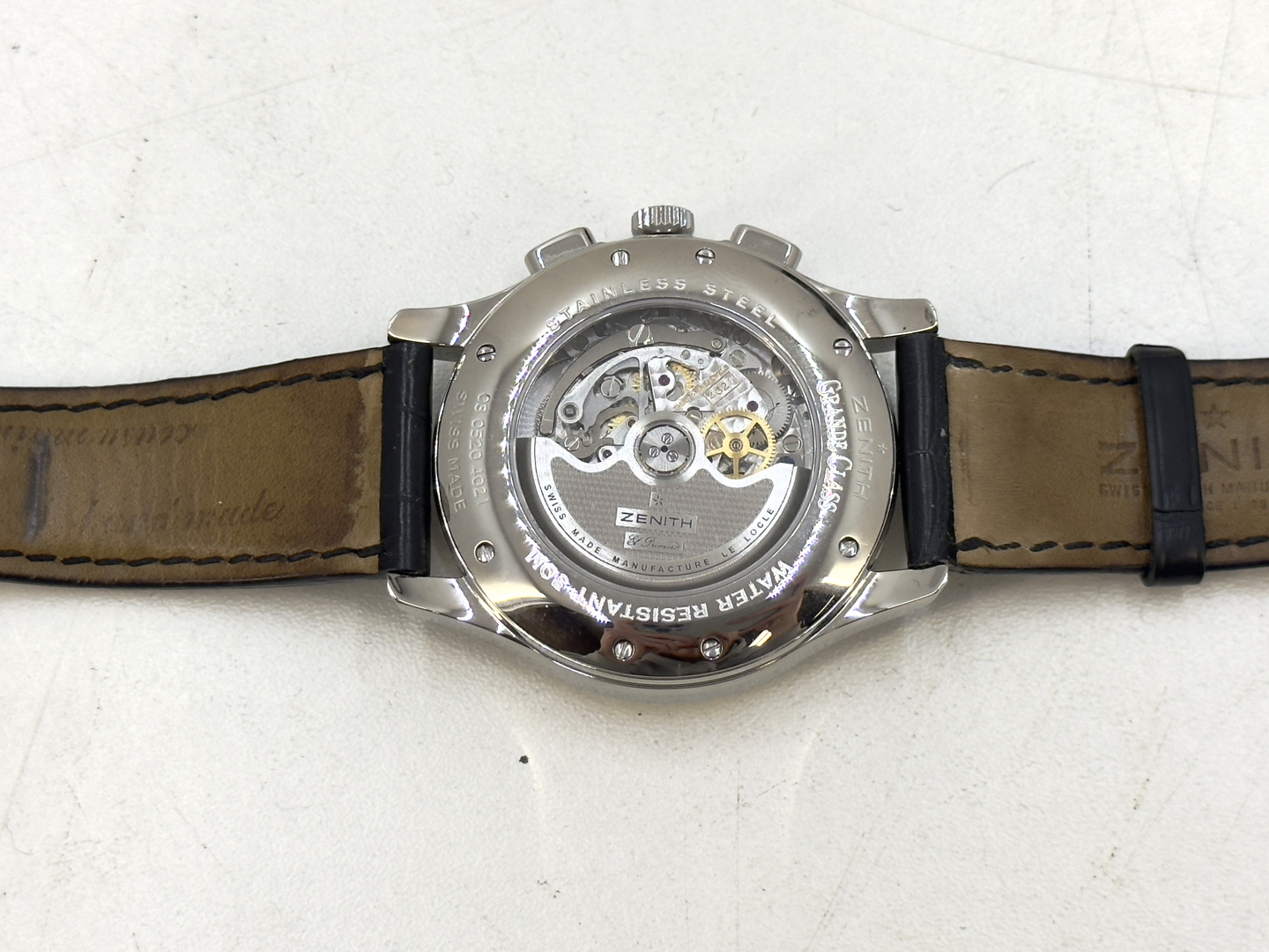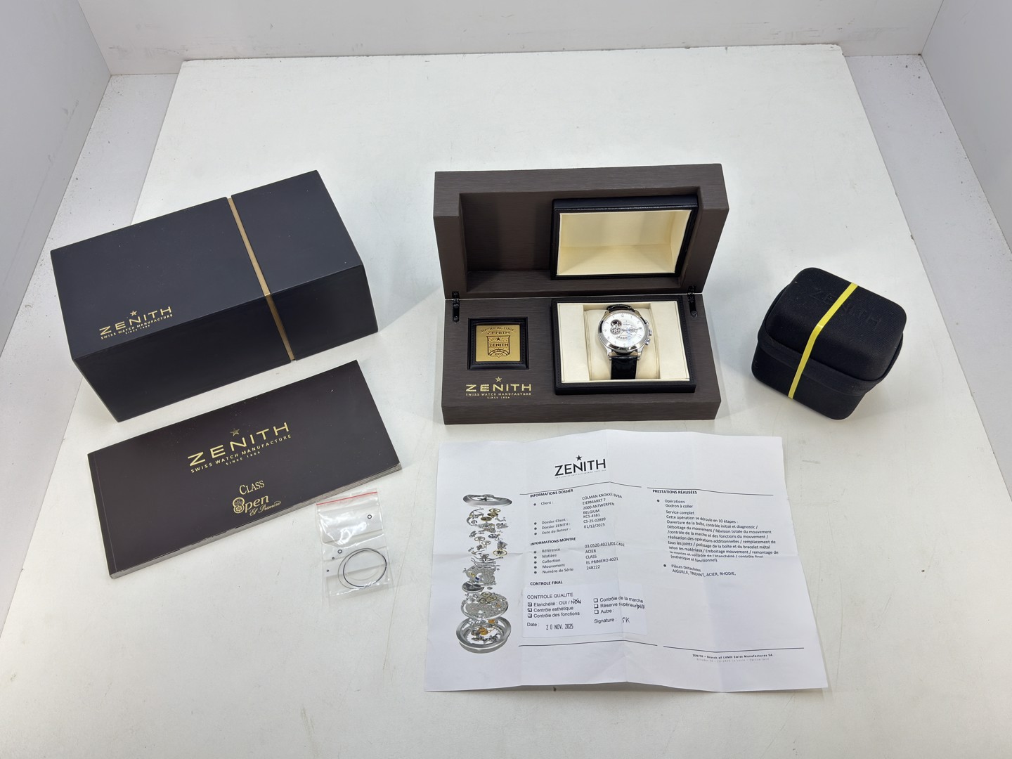 Zenith El Primero Grande Class Open Automatic wristwatch in perfect condition. Silver guilloche dial with chronograph functions, power reserve indicator, as well as an opening displaying the movement. Automatic movement; calibre 4021. 44mm case diameter. Sapphire crystal. Featured on an original black leather Zenith strap with original deployment buckle. Reference #: 03.0520.4021. Including the original box and user’s manual + service papers from 20/11/25