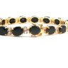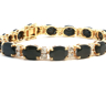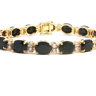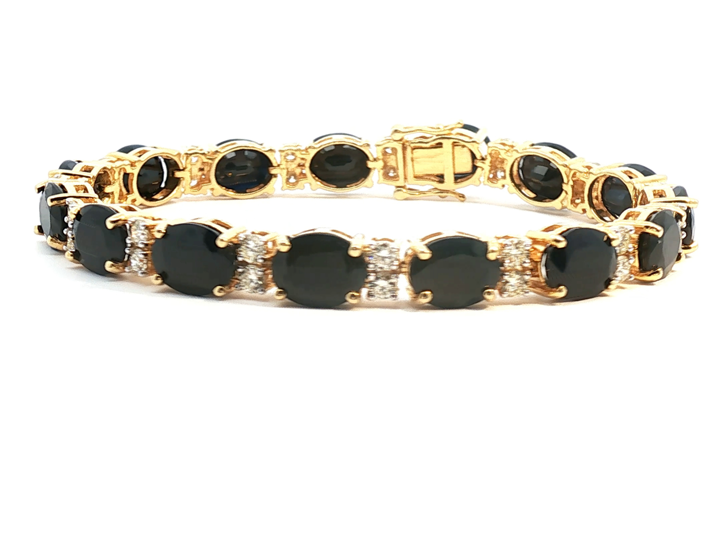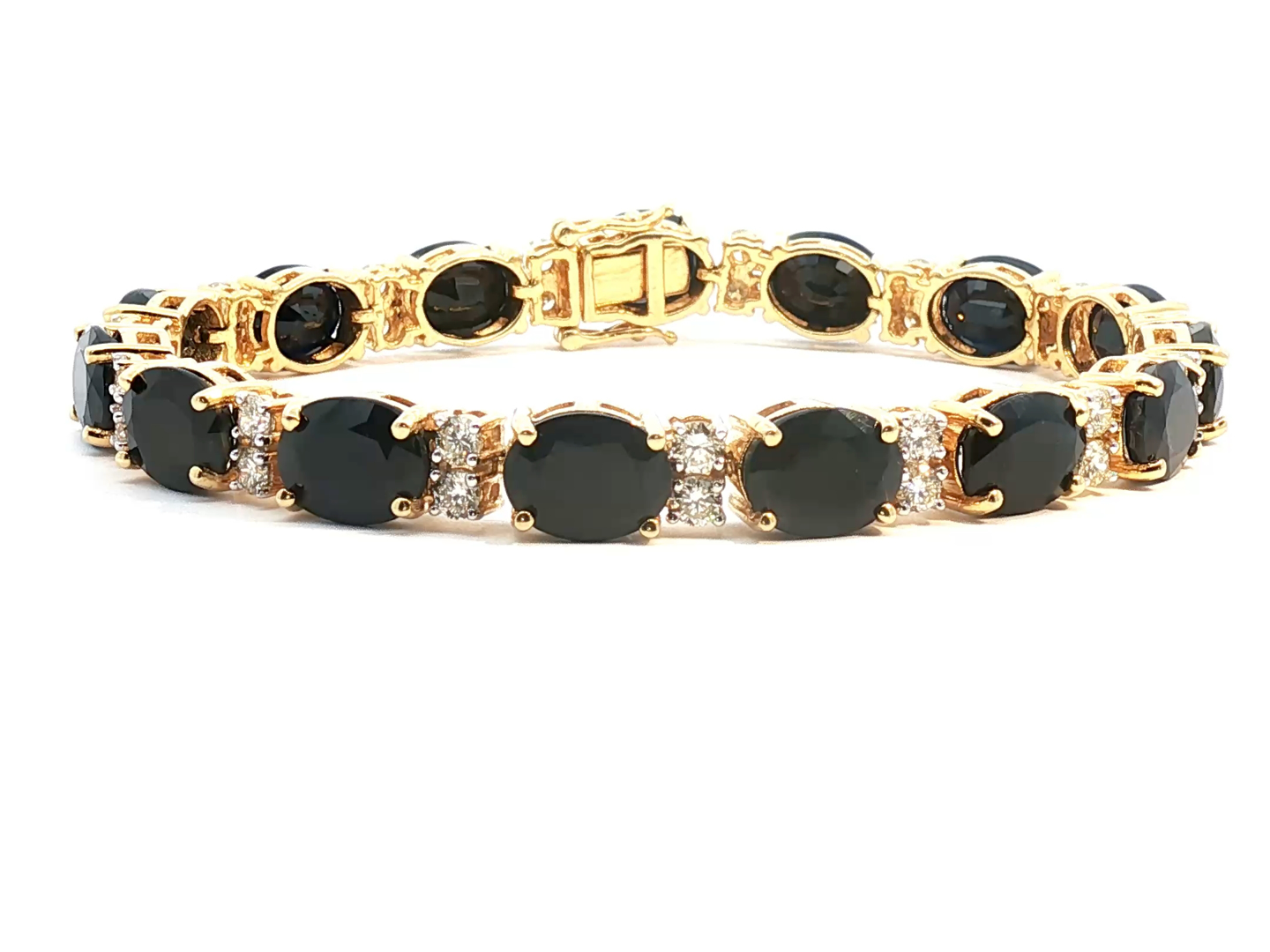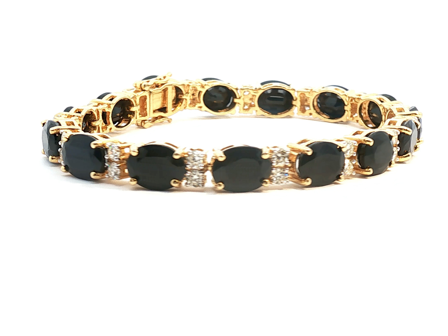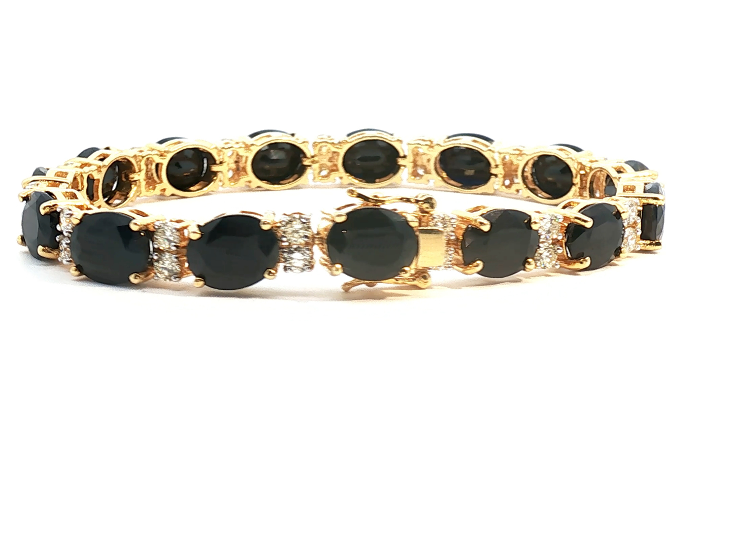 Sublime bracelet set with 15 sapphires of +- 30.00 cts. surrounded by 30 brilliant-cut white diamonds +- 2.00 cts. Color: I and clarity: VS set in 18 kt yellow gold. Length: 18 cm. x width: +- 8 mm. Weight: 26.9 grams