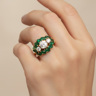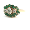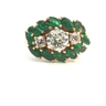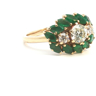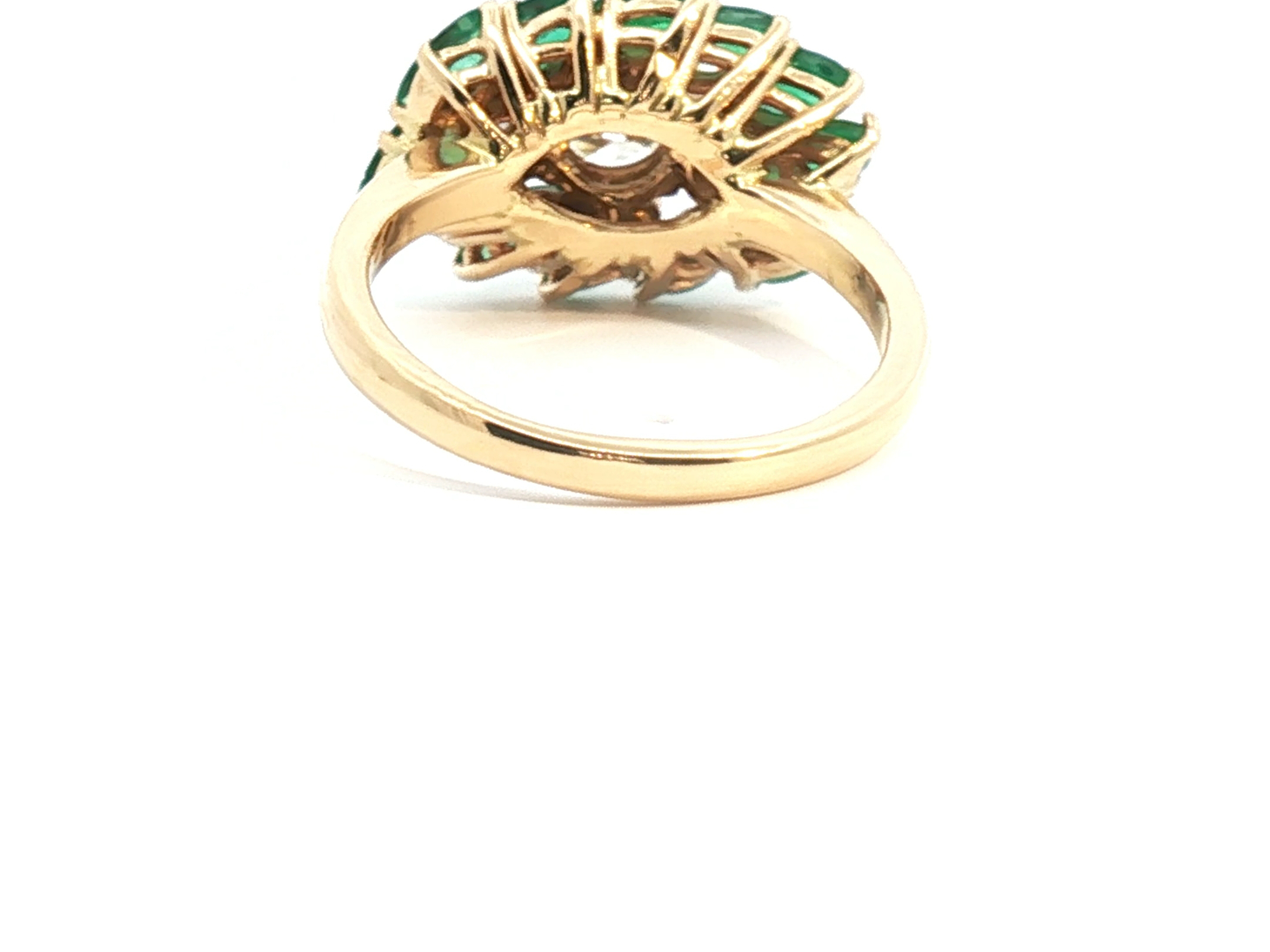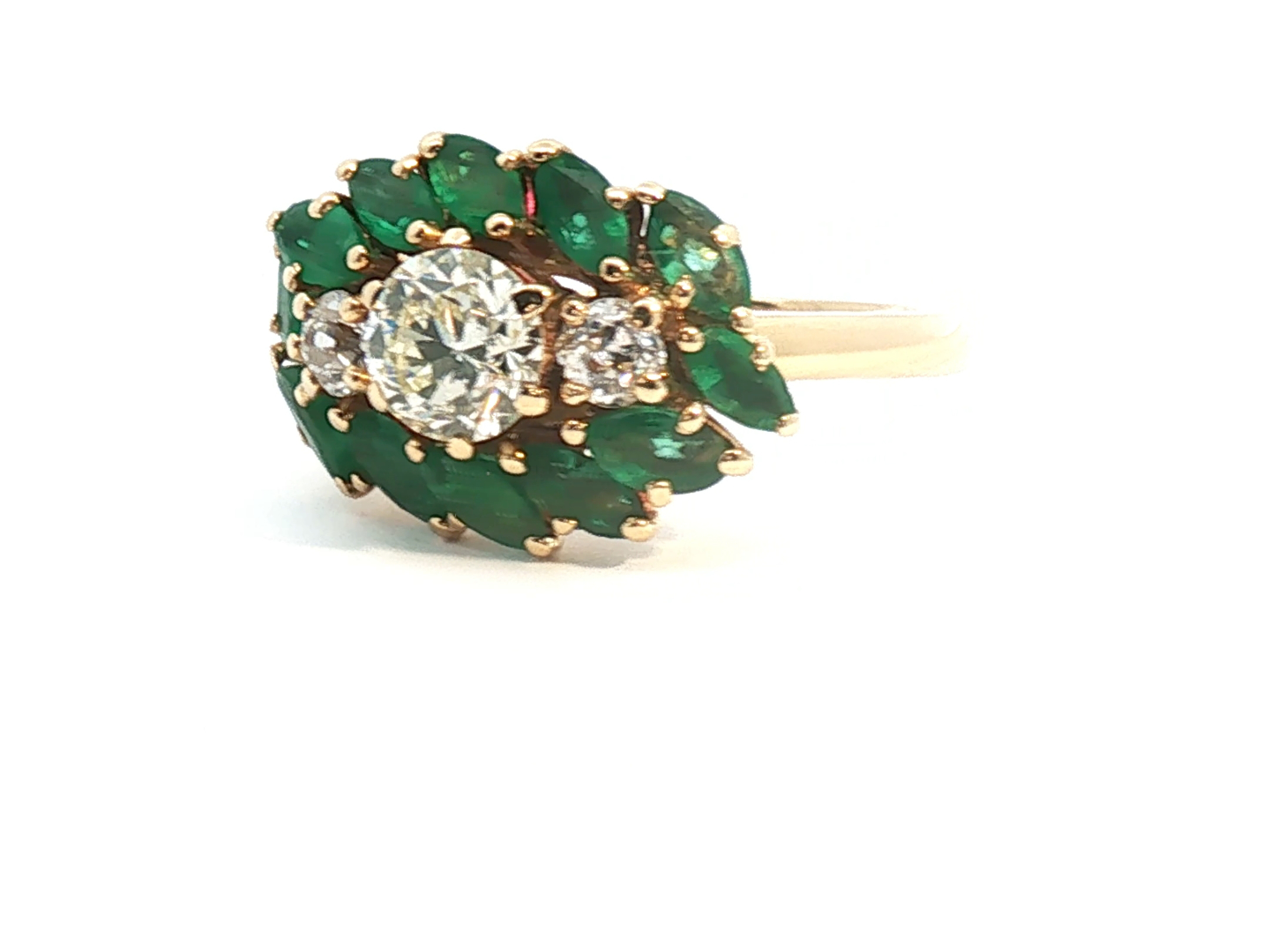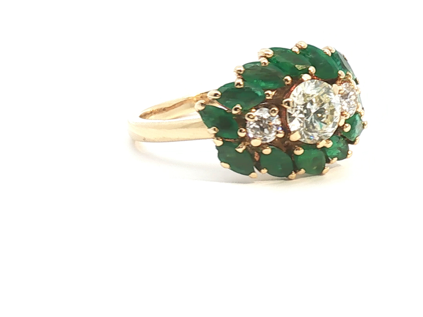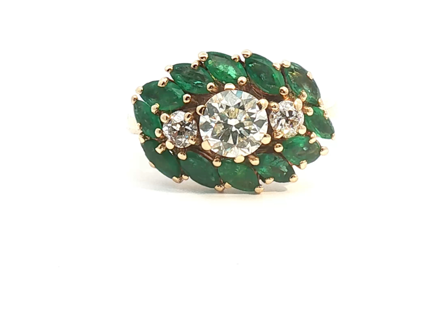 Exclusive ring set with 1 brilliant-cut white diamond of +-1.00 ct. surrounded by 2 diamonds +- 0.60 ct. Color: I and clarity: VS and 12 emerald-marquise-cut diamonds totaling approximately 2.40 ct. set in 18 kt yellow gold (marked 750) ring size: 55-57