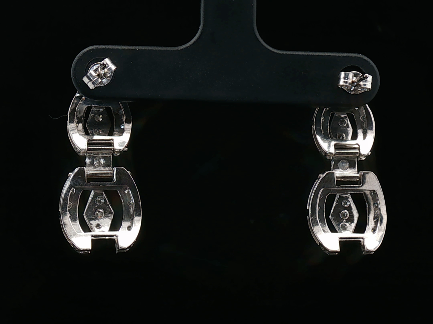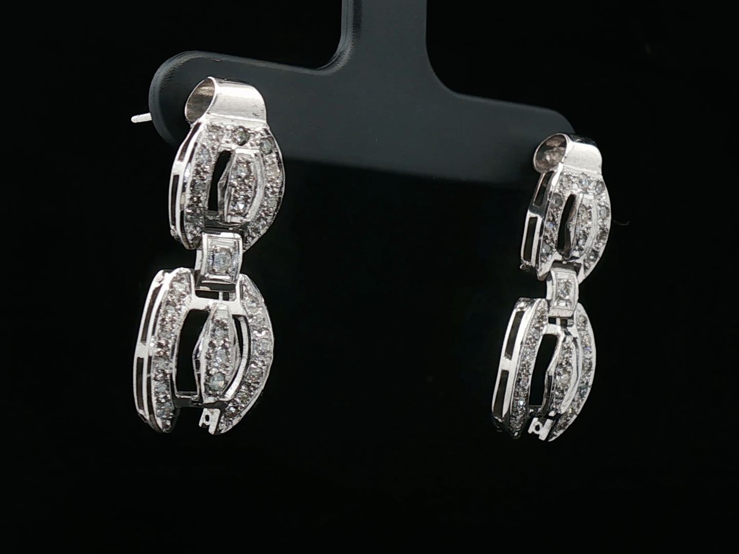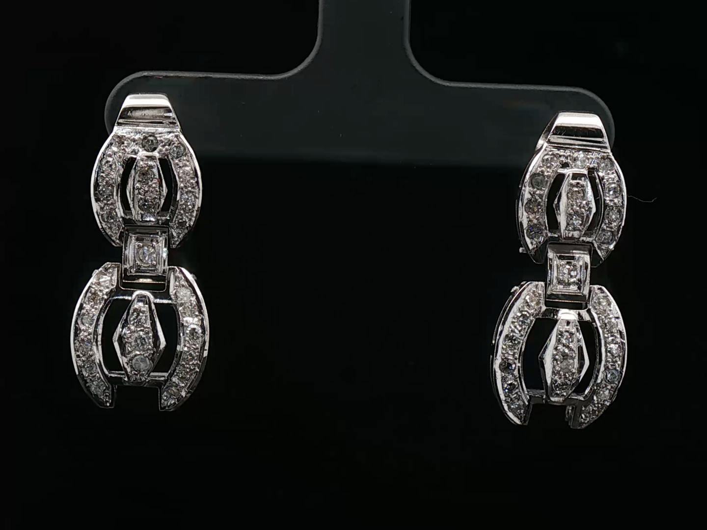 Pair of earrings circa 1930 in 18kt white gold, set with 54 white diamonds: +-1.00ct, old cut