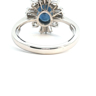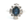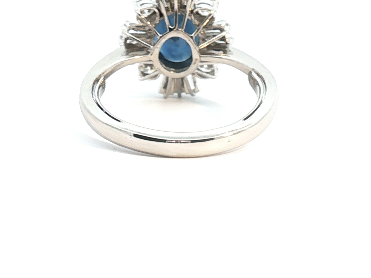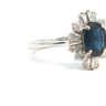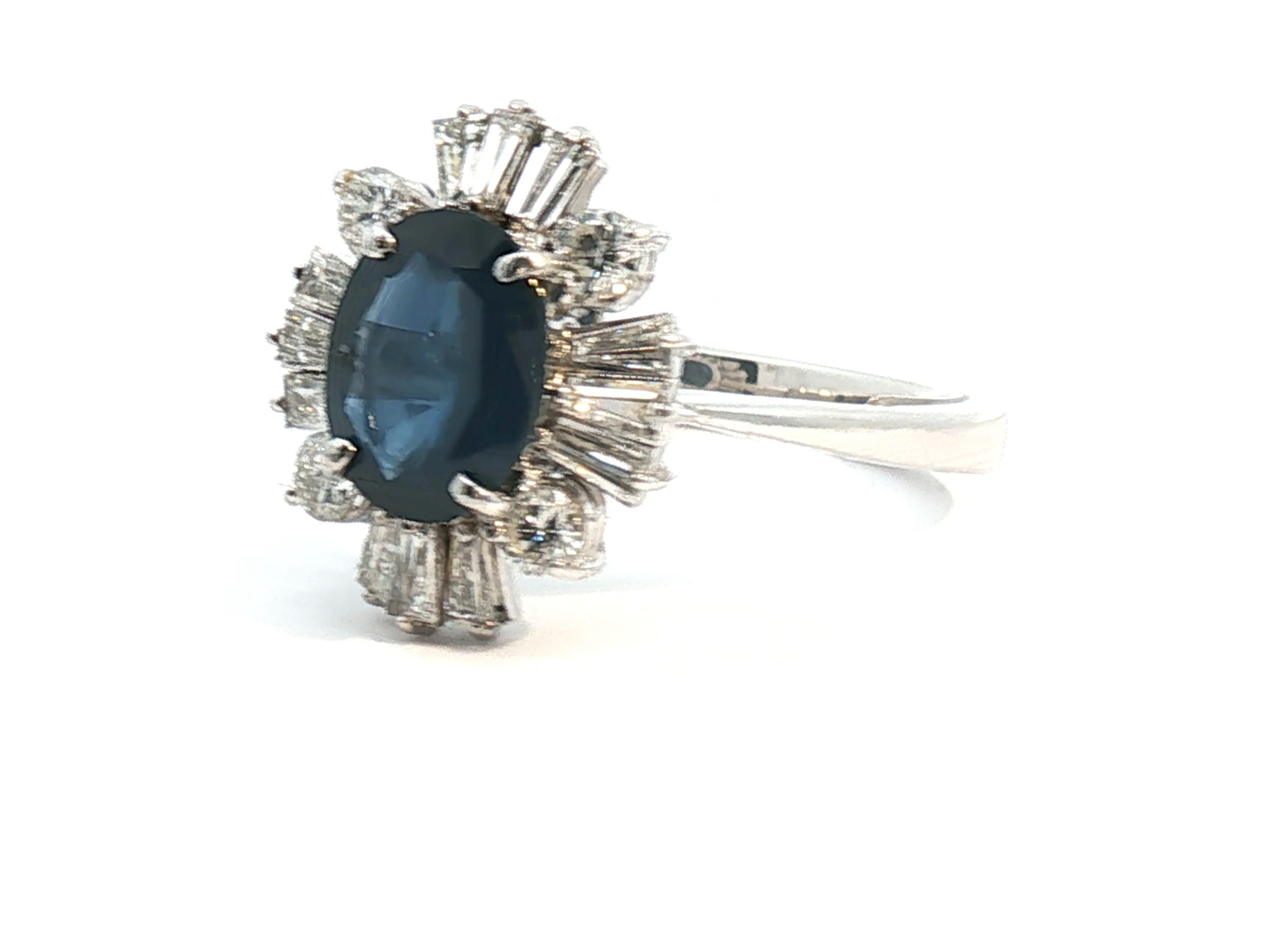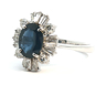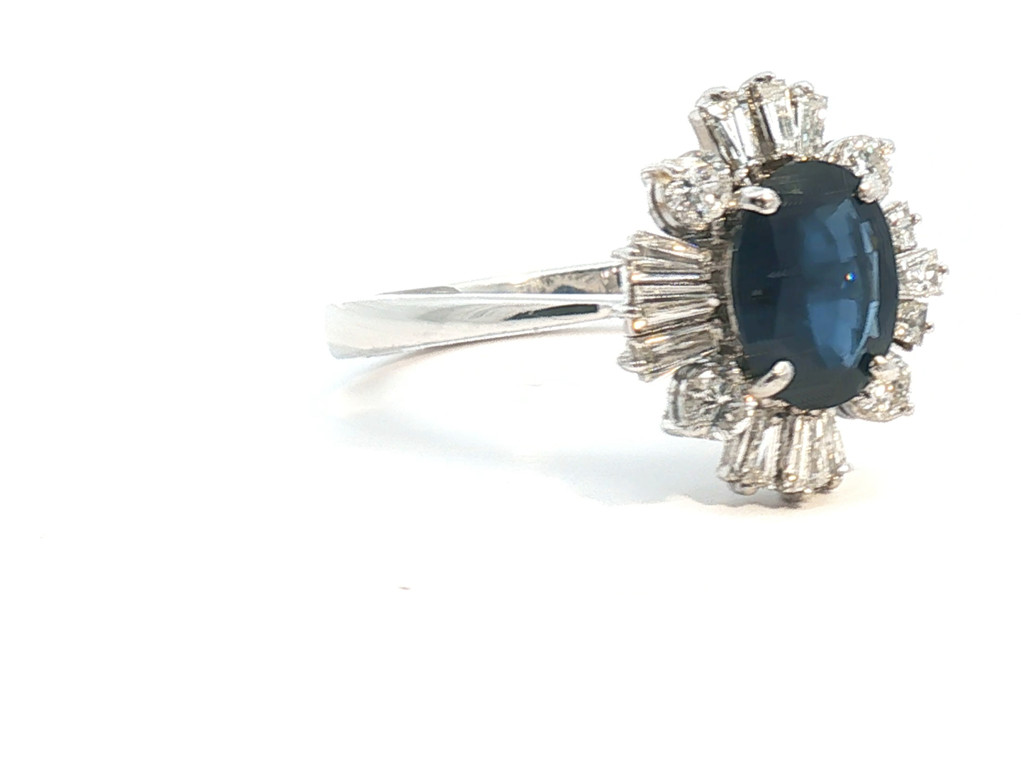 Unique ring set with a sapphire of +- 3.00ct, surrounded by 16 white diamonds - 4 brilliant cut + 12 tapered, total: +-2.00ct, color: D-E-F-exceptional white, and clarity: VS-SI. Set in 18kt white gold. Ring size: 58-61 and ring dimensions: +-18mm by 14mm