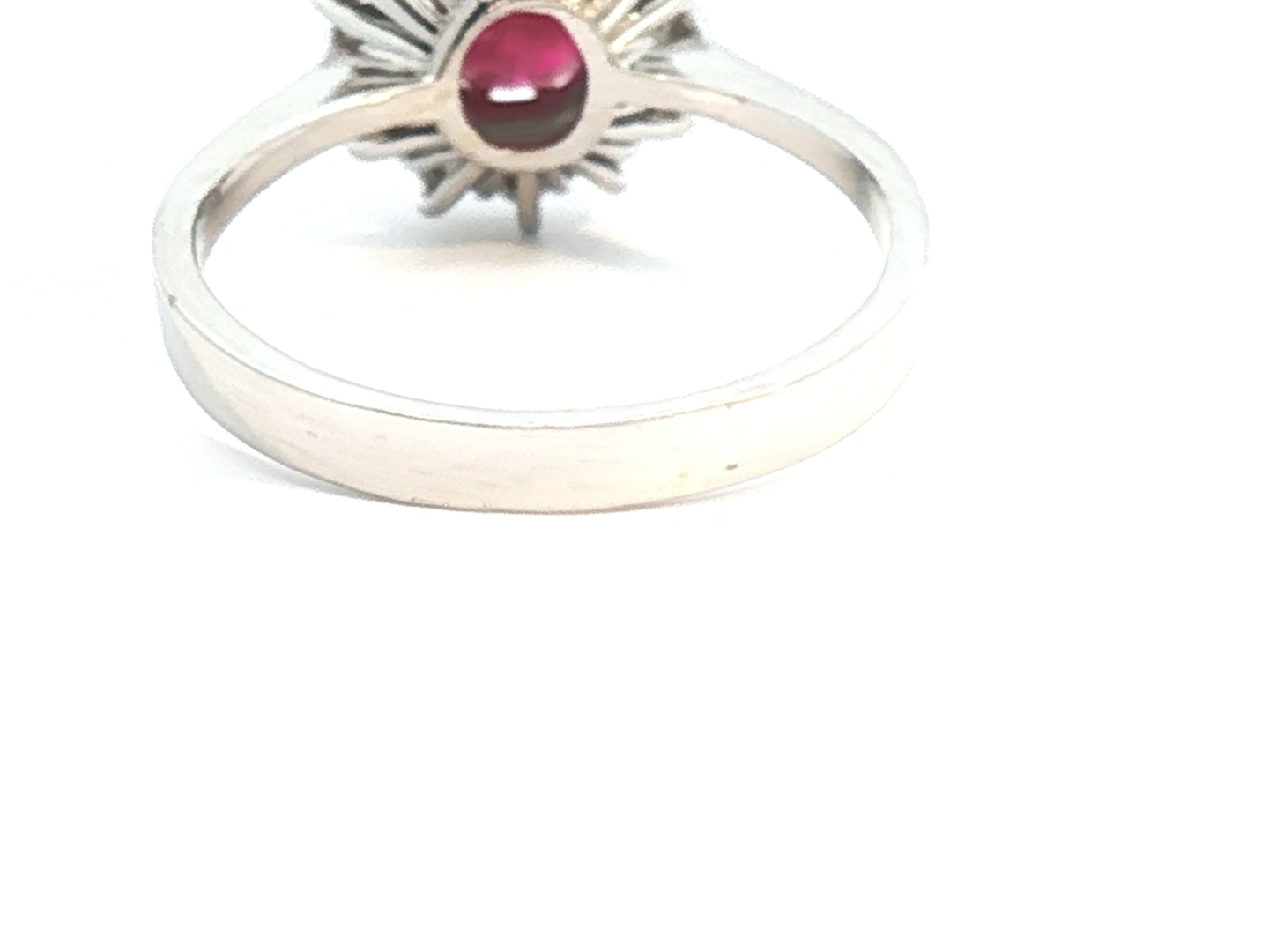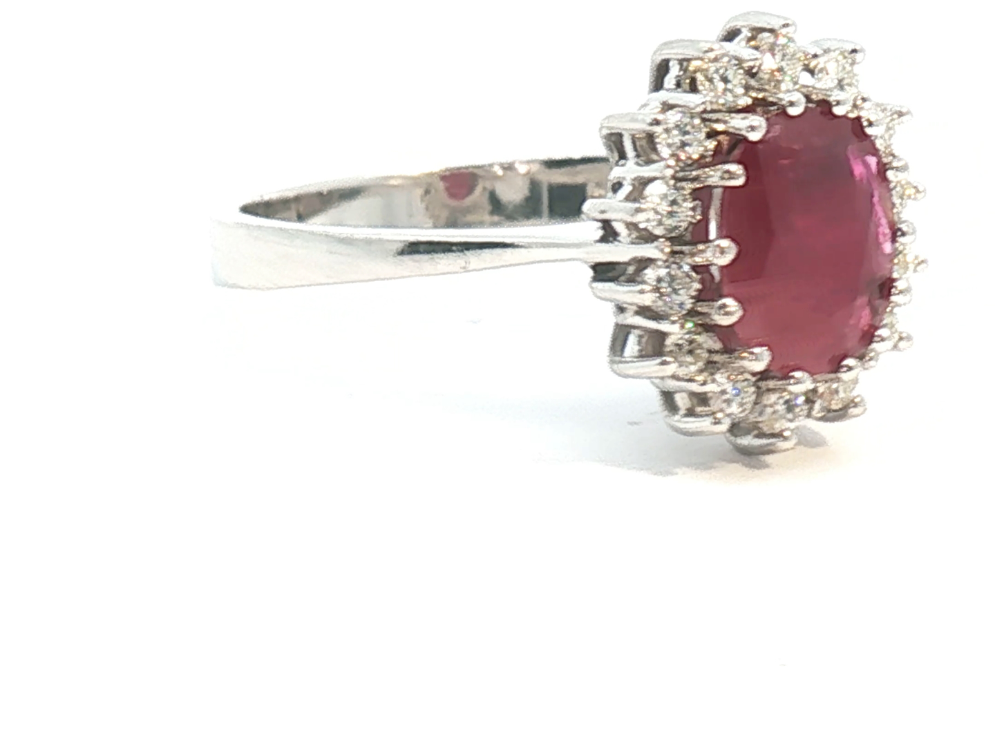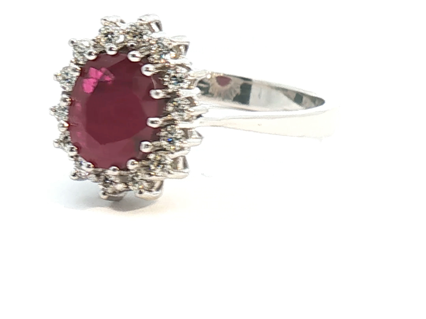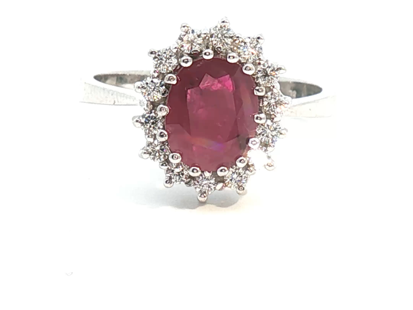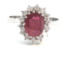 Ring in 14kt white gold (marked 585) set with 1 ruby of +- 2.50cts. surrounded by 14 brilliant-cut diamonds +- 0.42ct. Color: I and clarity: VS Ring size: 53-55 Ring +- 12 mm by 10 mm.