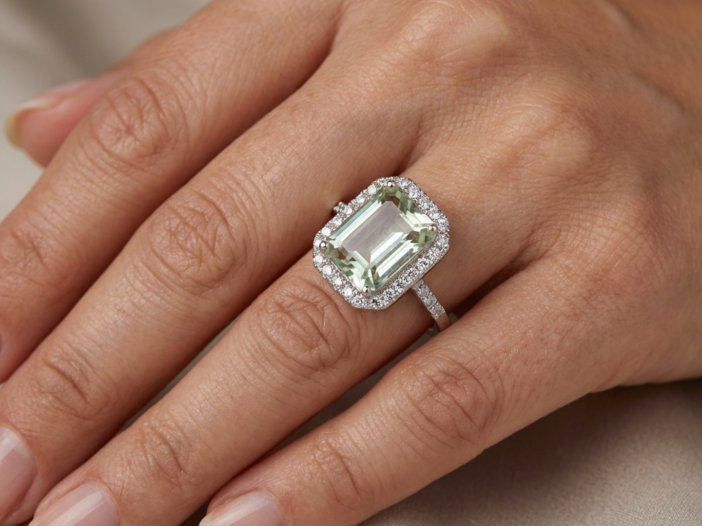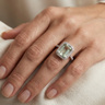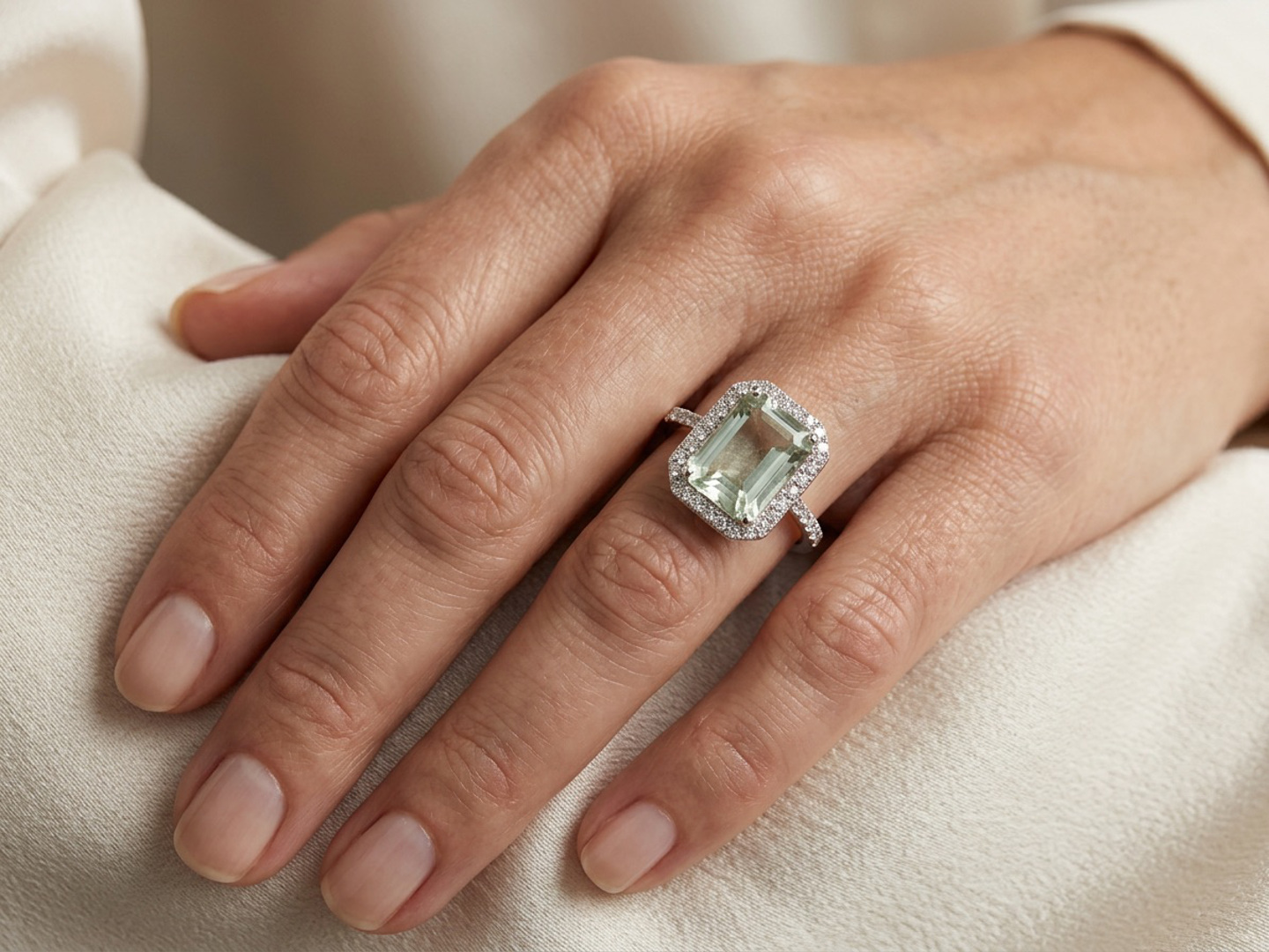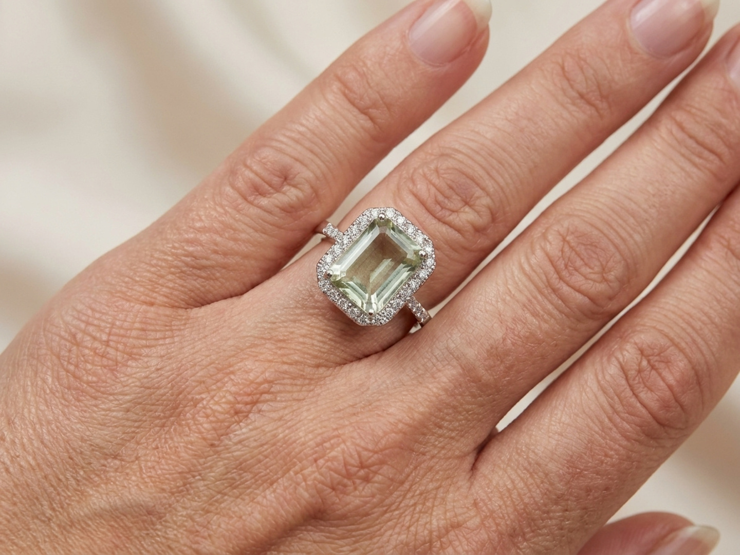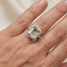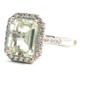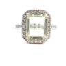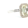 Exclusive ring with 1 light green tourmaline of +-4.00ct, surrounded by 32 small diamonds