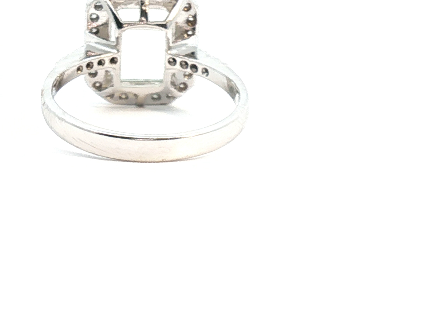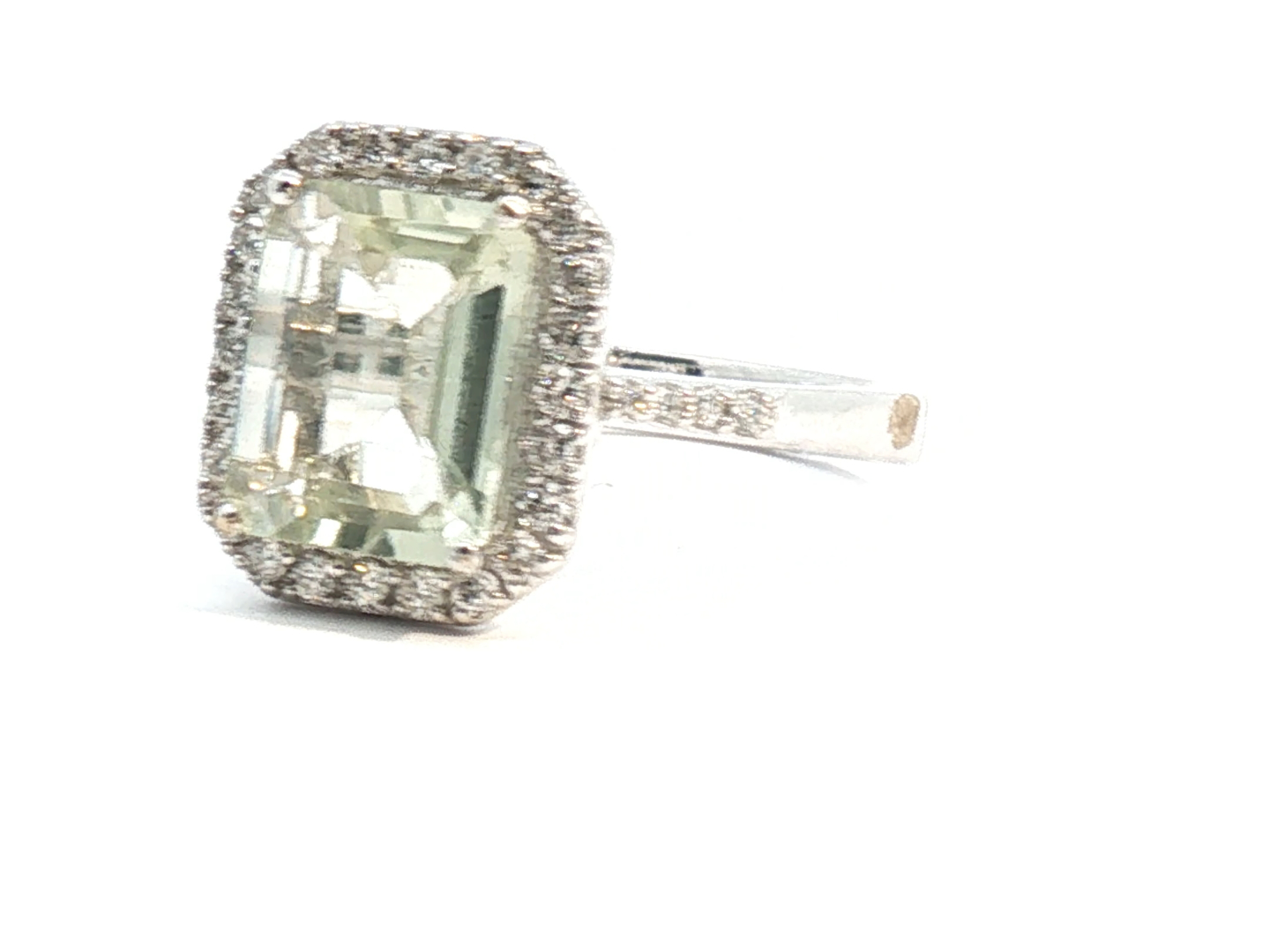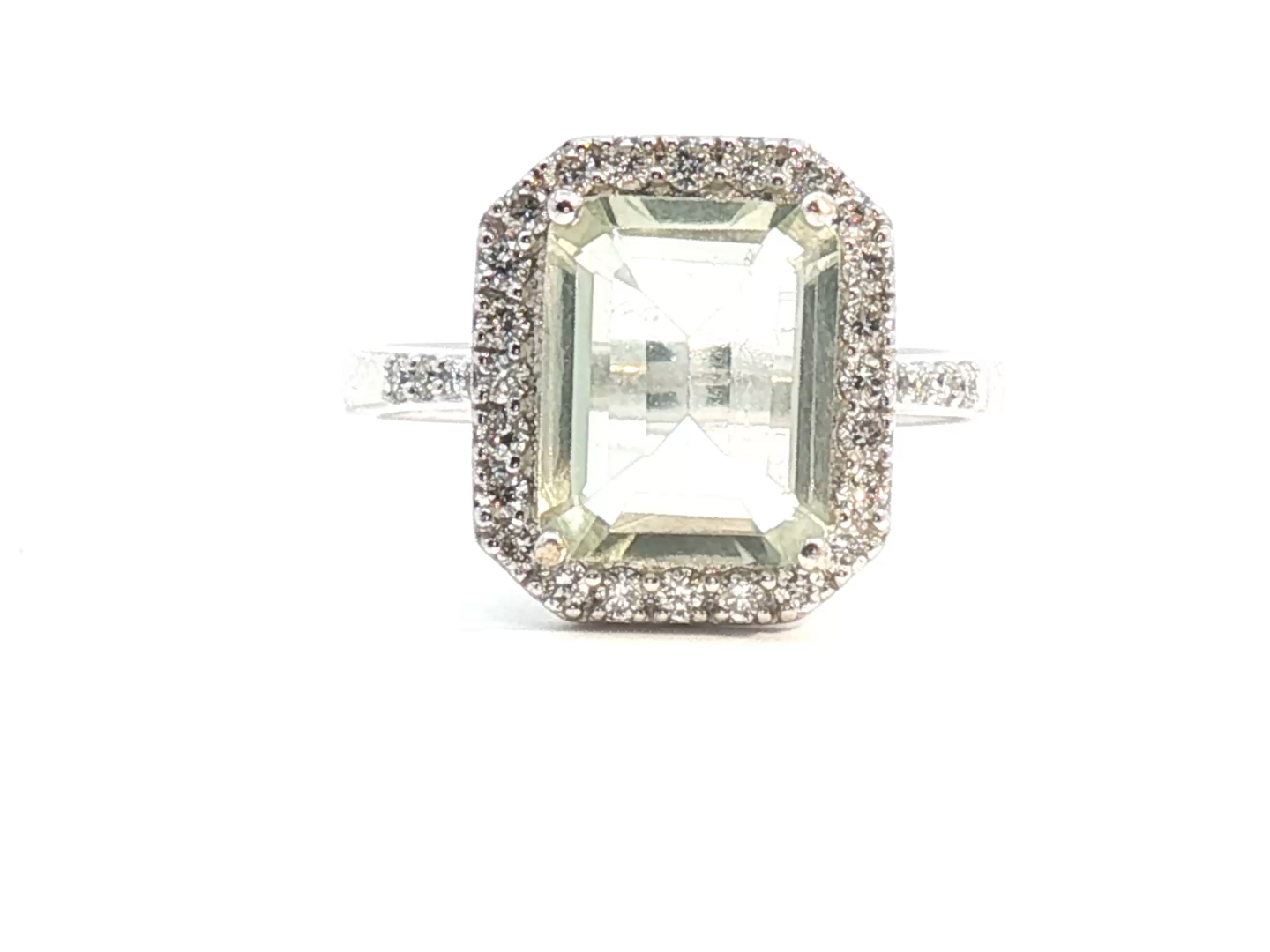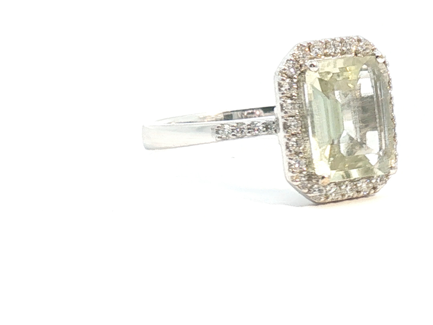 Exclusive ring with 1 light green tourmaline of +-4.00ct, surrounded by 32 small diamonds: +-0.34ct, color: G-H and clarity: VS. Set in 18kt white gold (marked 750). Ring size: 52-54 and ring dimensions: +-14mm by 12mm