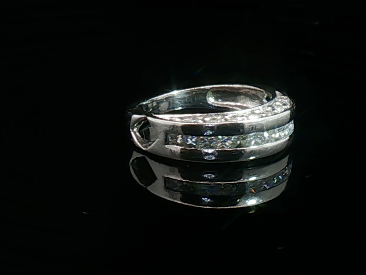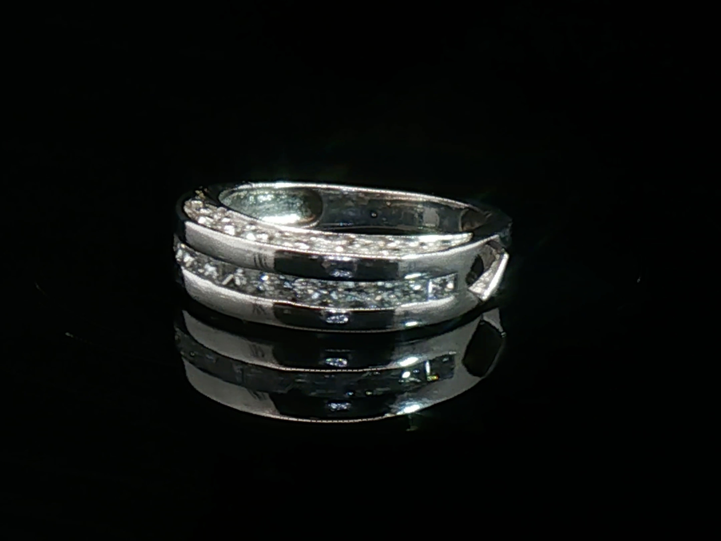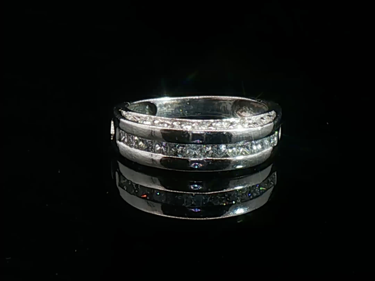 Beautiful ring set with 12 white princess-cut diamonds + 14 brilliant-cut diamonds, total: 1.50ct, color: I and clarity: VS-SI. Mounted in 18kt white gold. Ring size: 48-50 and weight: 4.5 grams