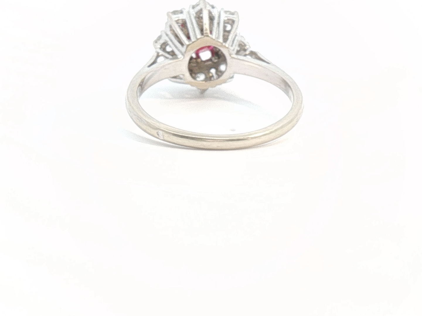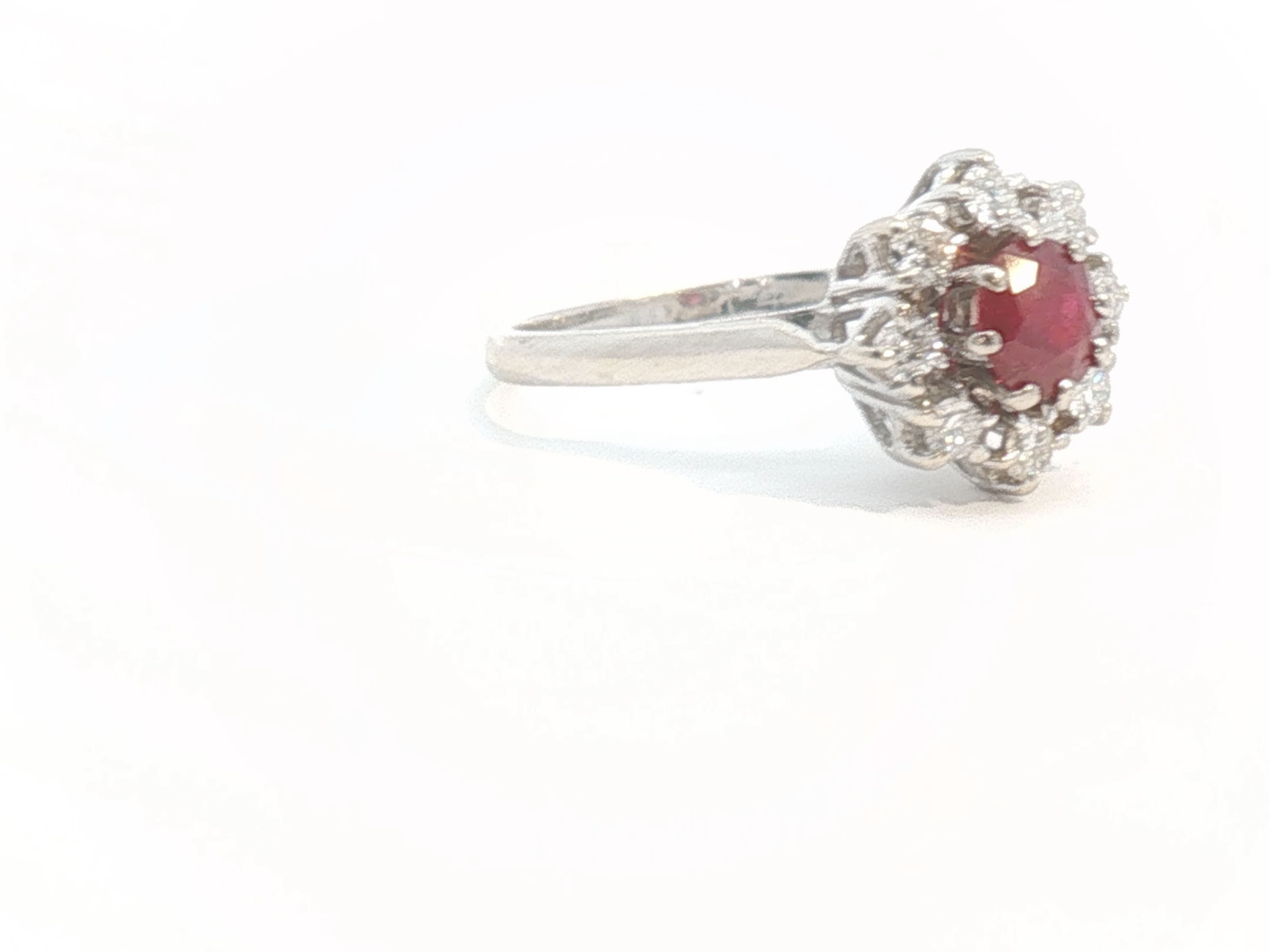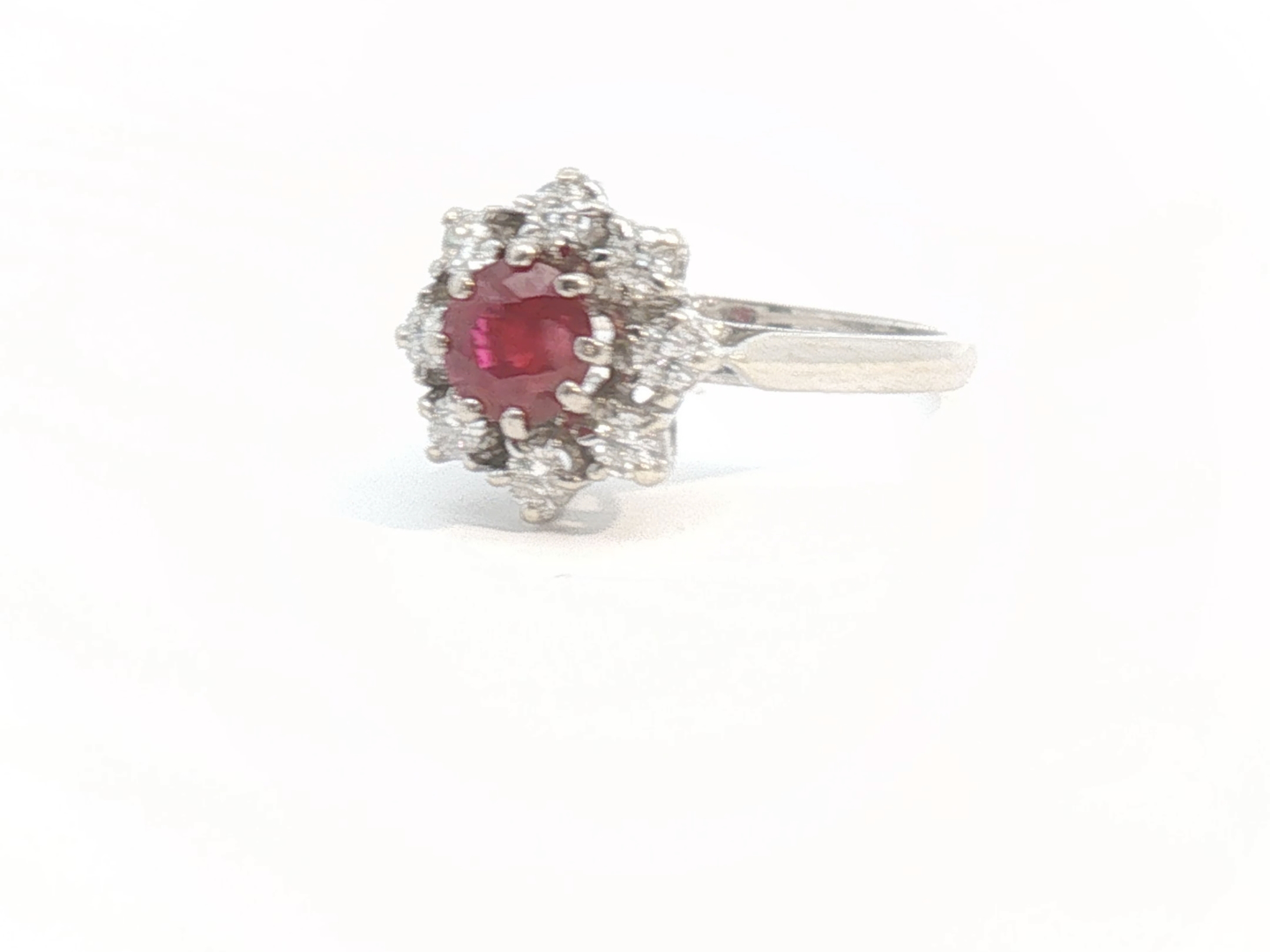 Ring with 1 ruby of +- 0.70ct, vivid red, surrounded by 8 diamonds: +- 1.20ct, color: E-F-G-exceptional white and clarity: VS. Set in 18kt white gold. Ring size: 51-53 and ring diameter: +- 11mm. Weight: 4.2 grams
