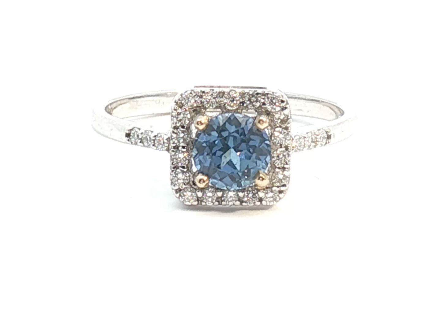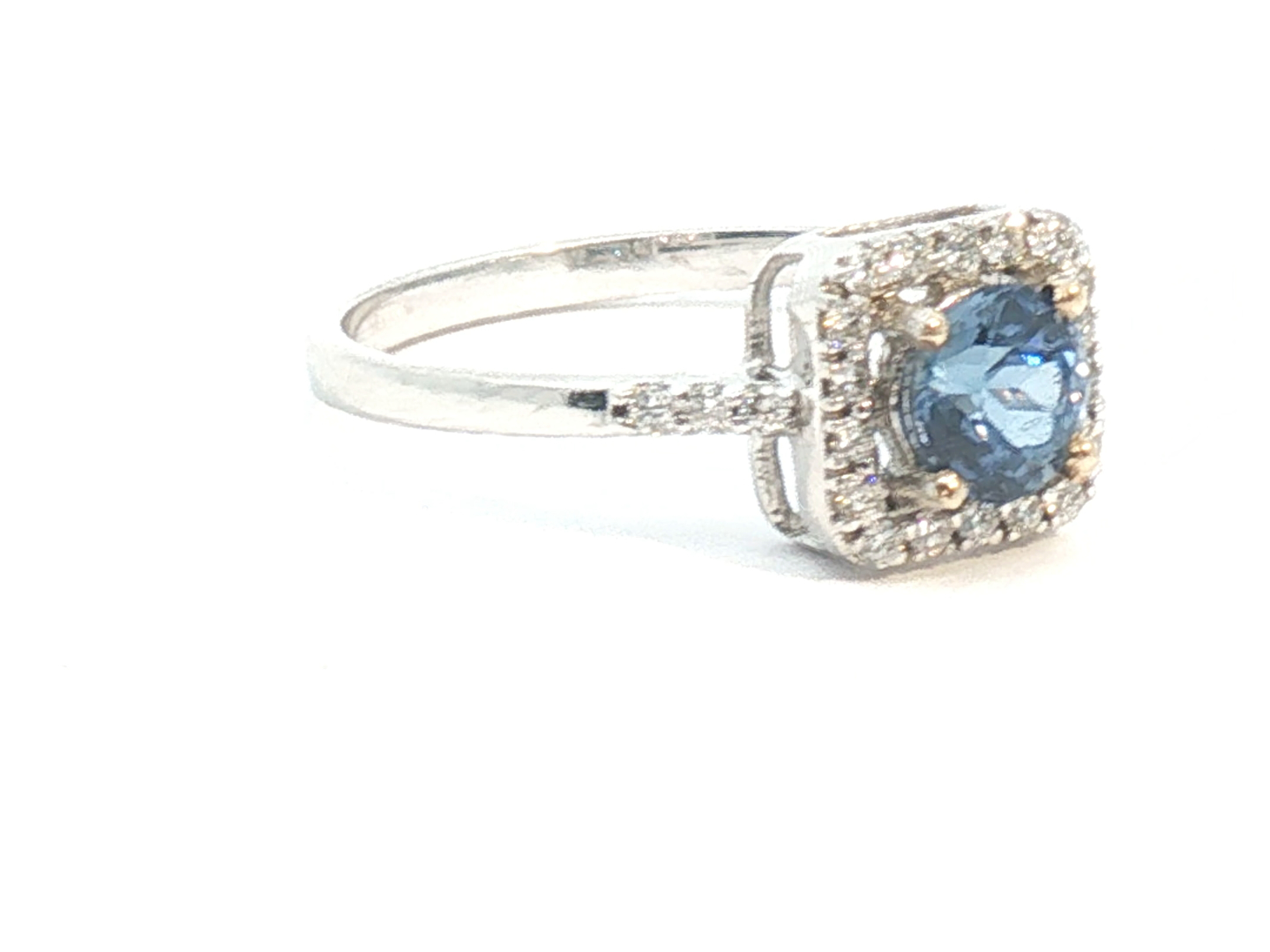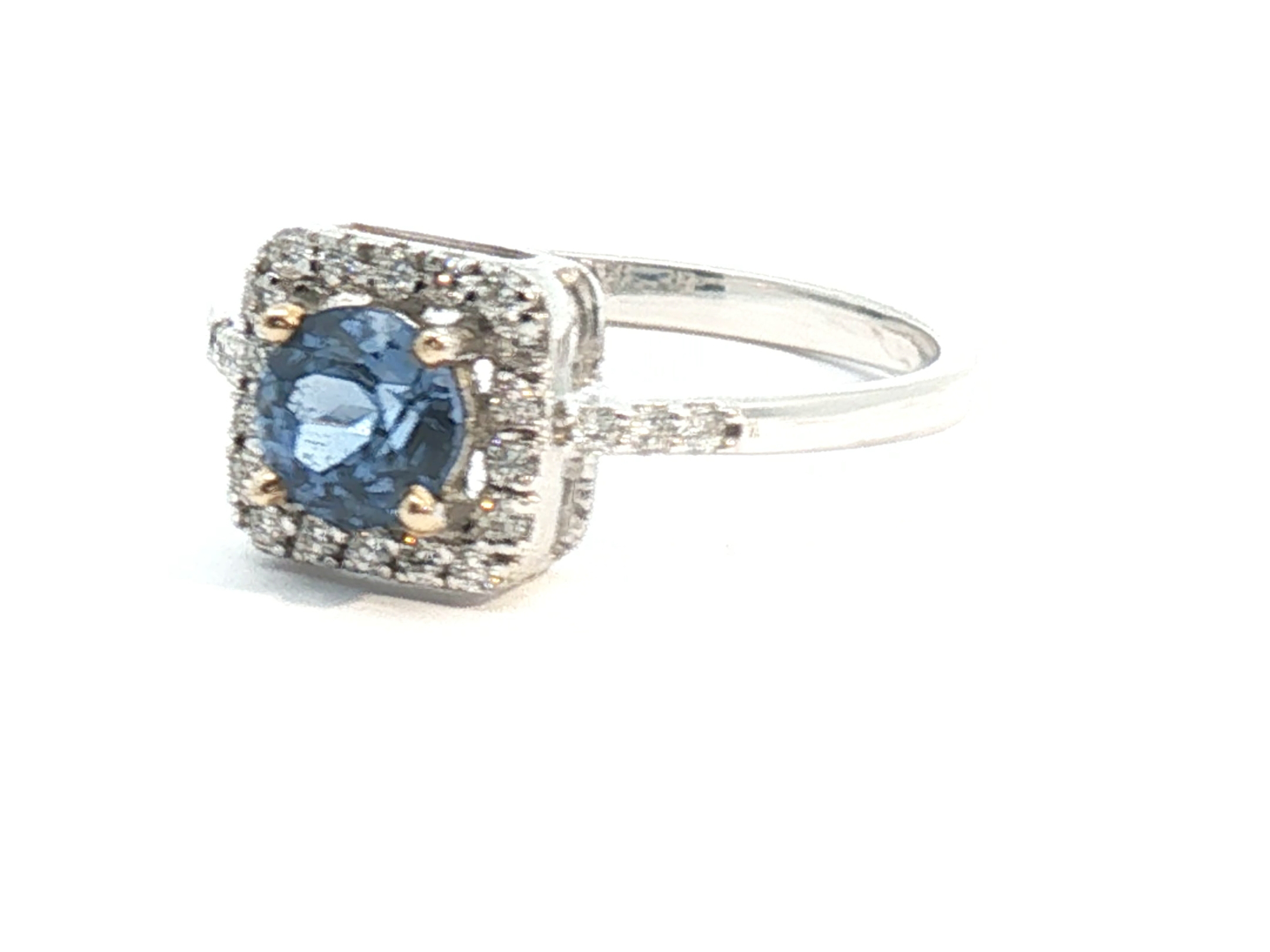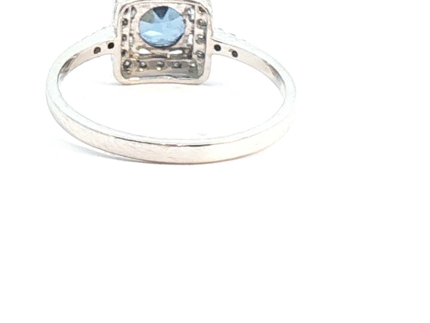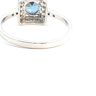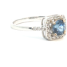 Elegant ring with a single Ceylon sapphire of 0.75 carat surrounded by 24 brilliant-cut diamonds 0.24 carat Color: I and clarity: VS set in 18-carat white gold (marked 750). Ring size: 51-53. Weight: 2.2 grams.