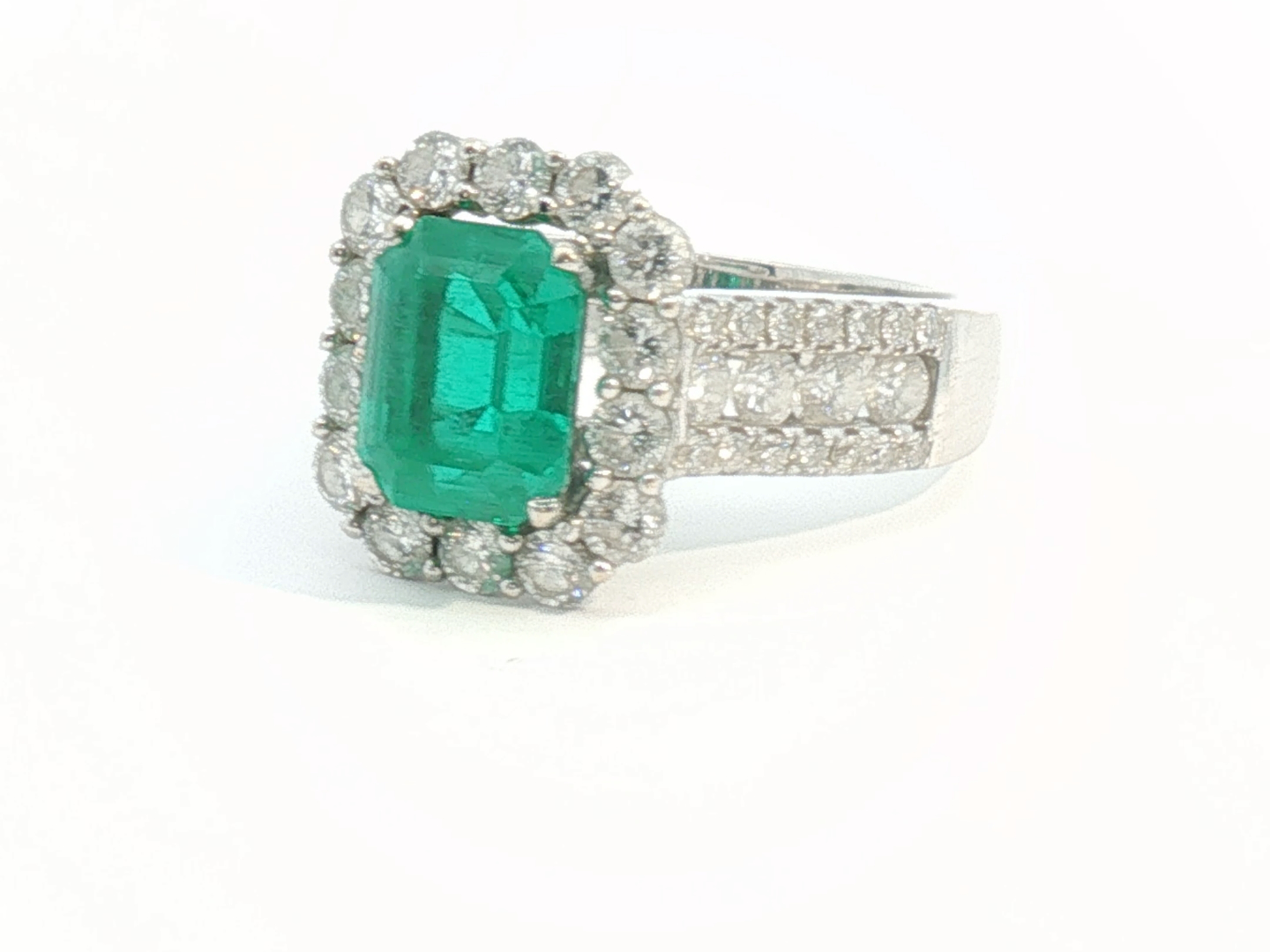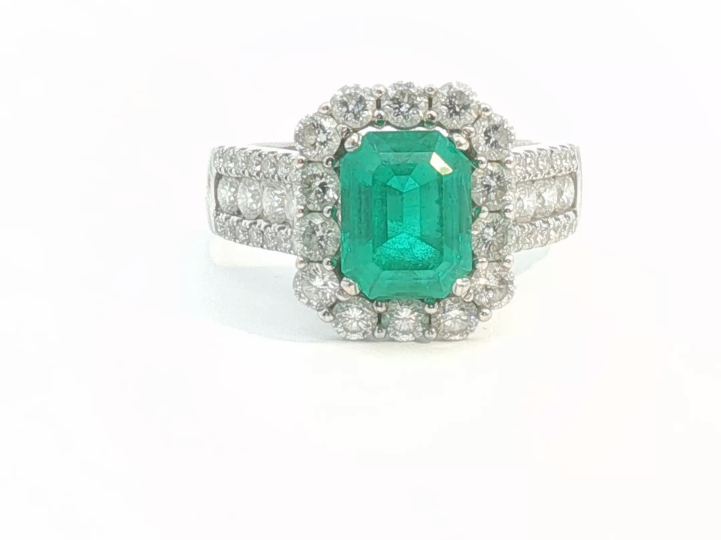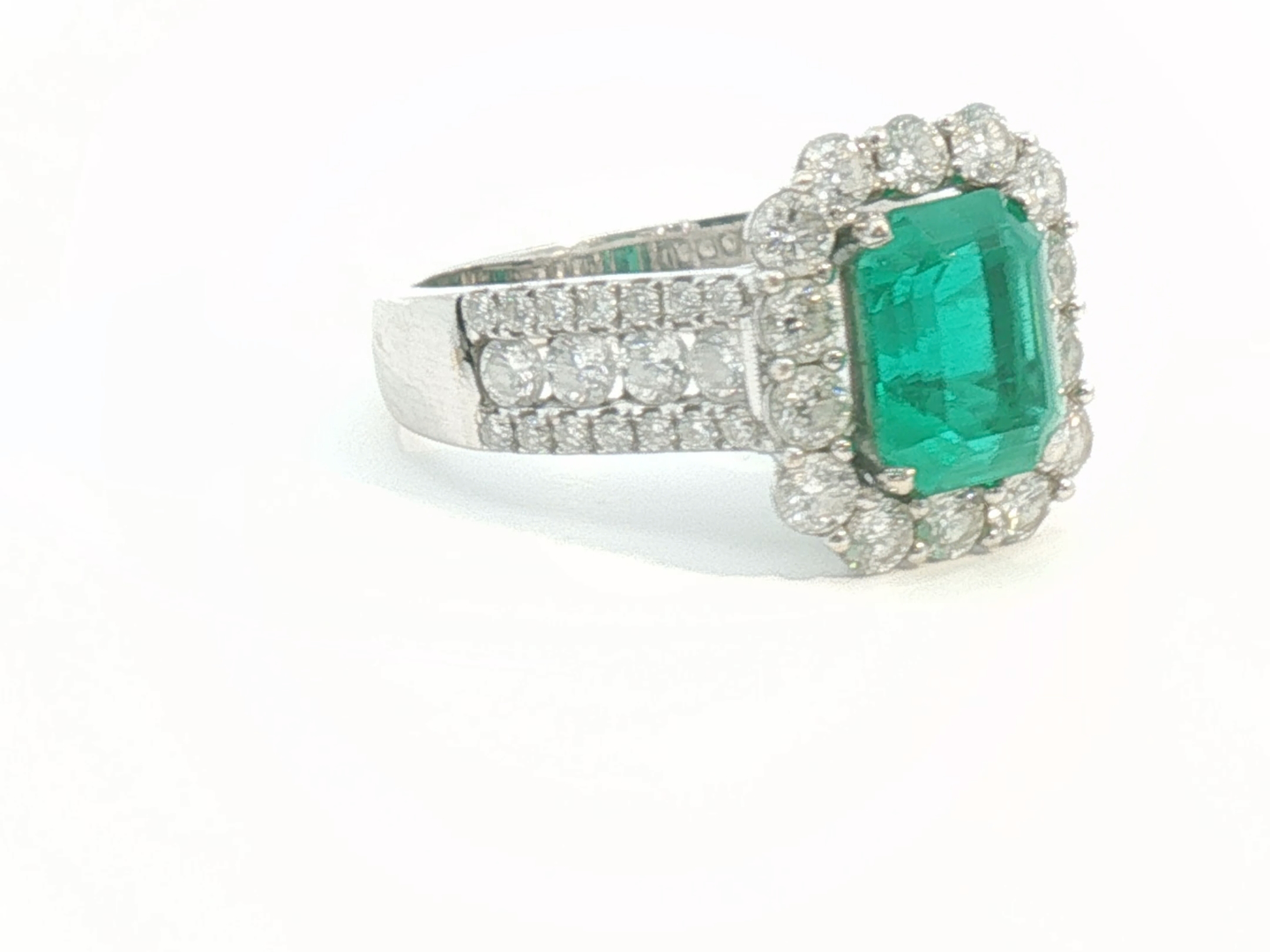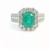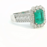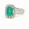 Unique ring set with 1 Colombian emerald of +-3.00ct, surrounded by 24 large diamonds and 28 small diamonds