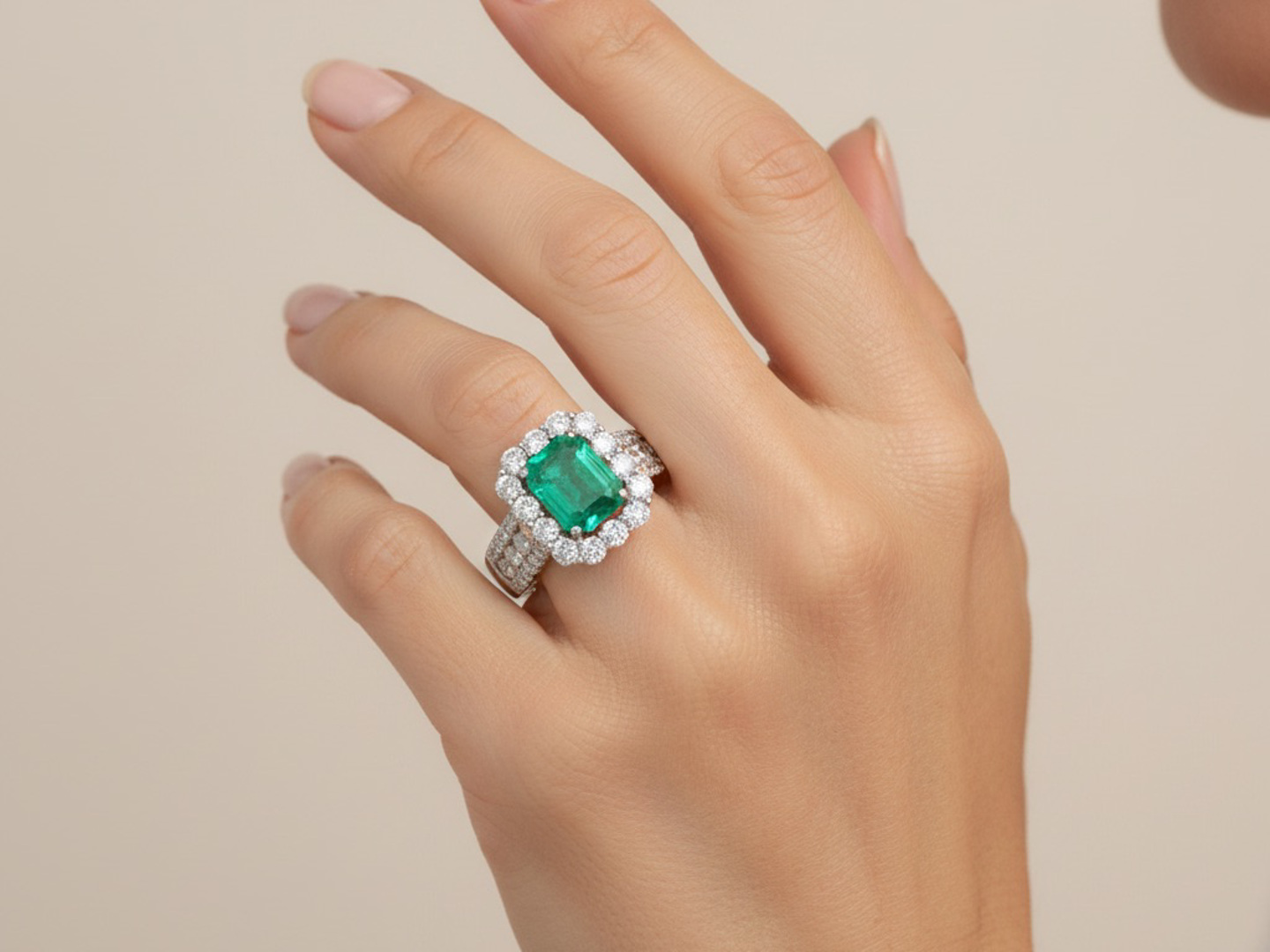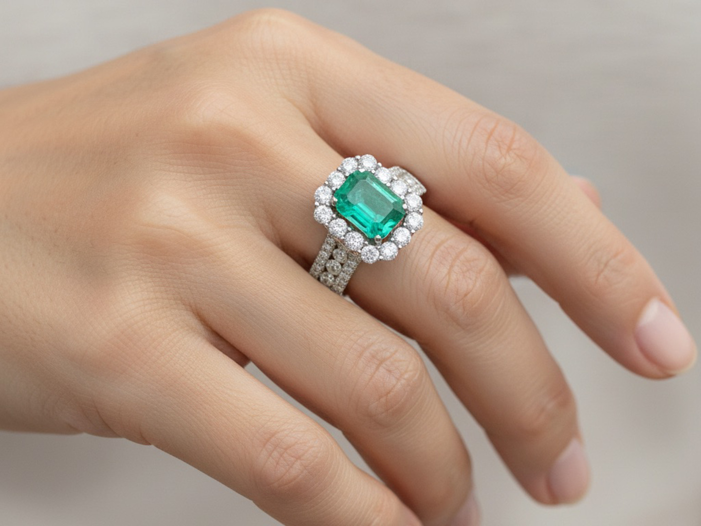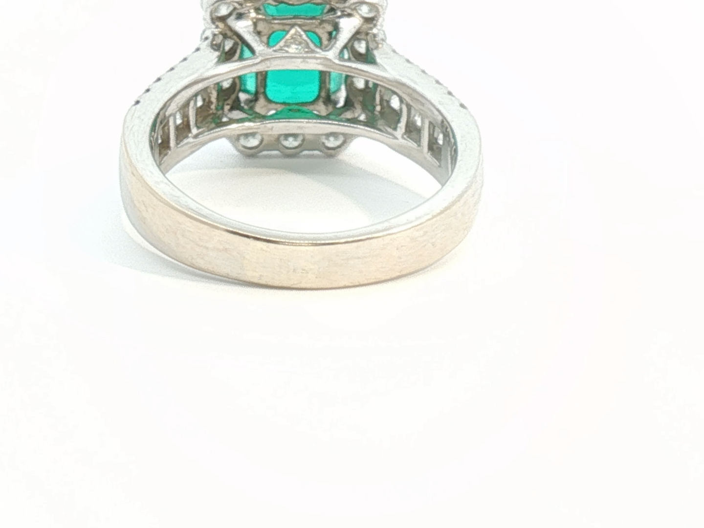 Unique ring set with 1 Colombian emerald of +-3.00ct, surrounded by 24 large diamonds and 28 small diamonds