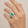 Unique ring set with 1 Colombian emerald of +-3.00ct, surrounded by 24 large diamonds + 28 small diamonds, total: +-3.00ct, color: F-G exceptional white and clarity: VS. Ring dimensions: +-14mm by 12mm