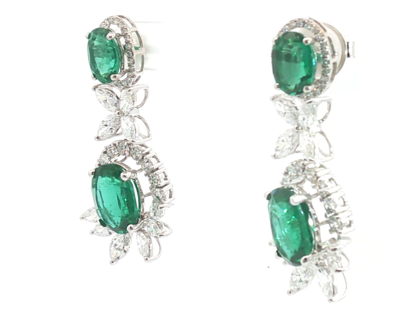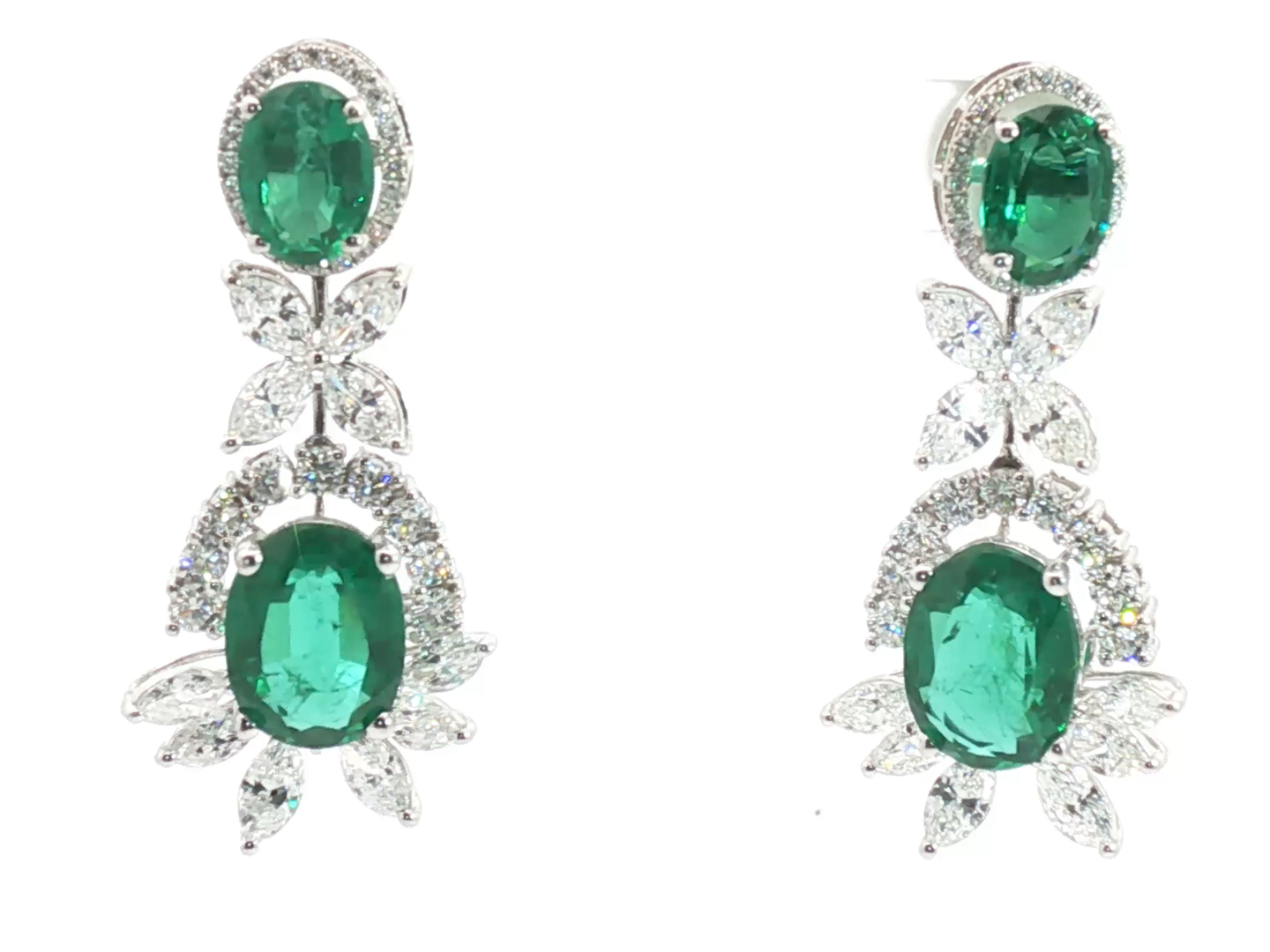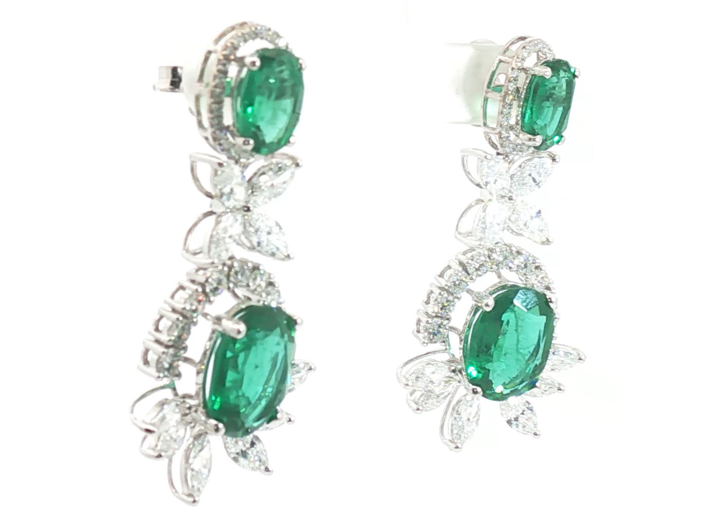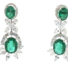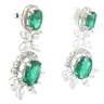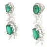 Pair of exclusive earrings set with 4 green tsavorite stones: +-14.00ct, surrounded by 20 large white marquise-cut diamonds + 66 brilliant-cut diamonds, total: +-8.00ct, color: F-G-Exceptional white and clarity: VS. Set in 18kt white gold. Earring length: 42 mm