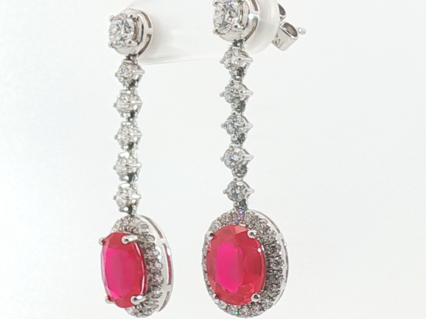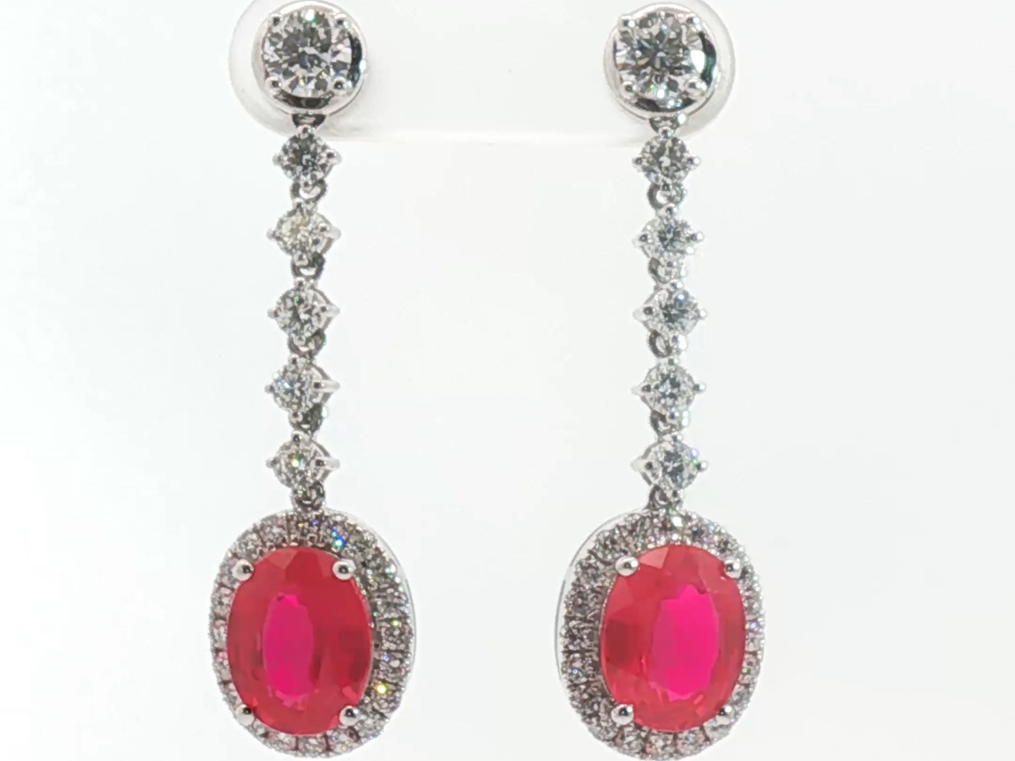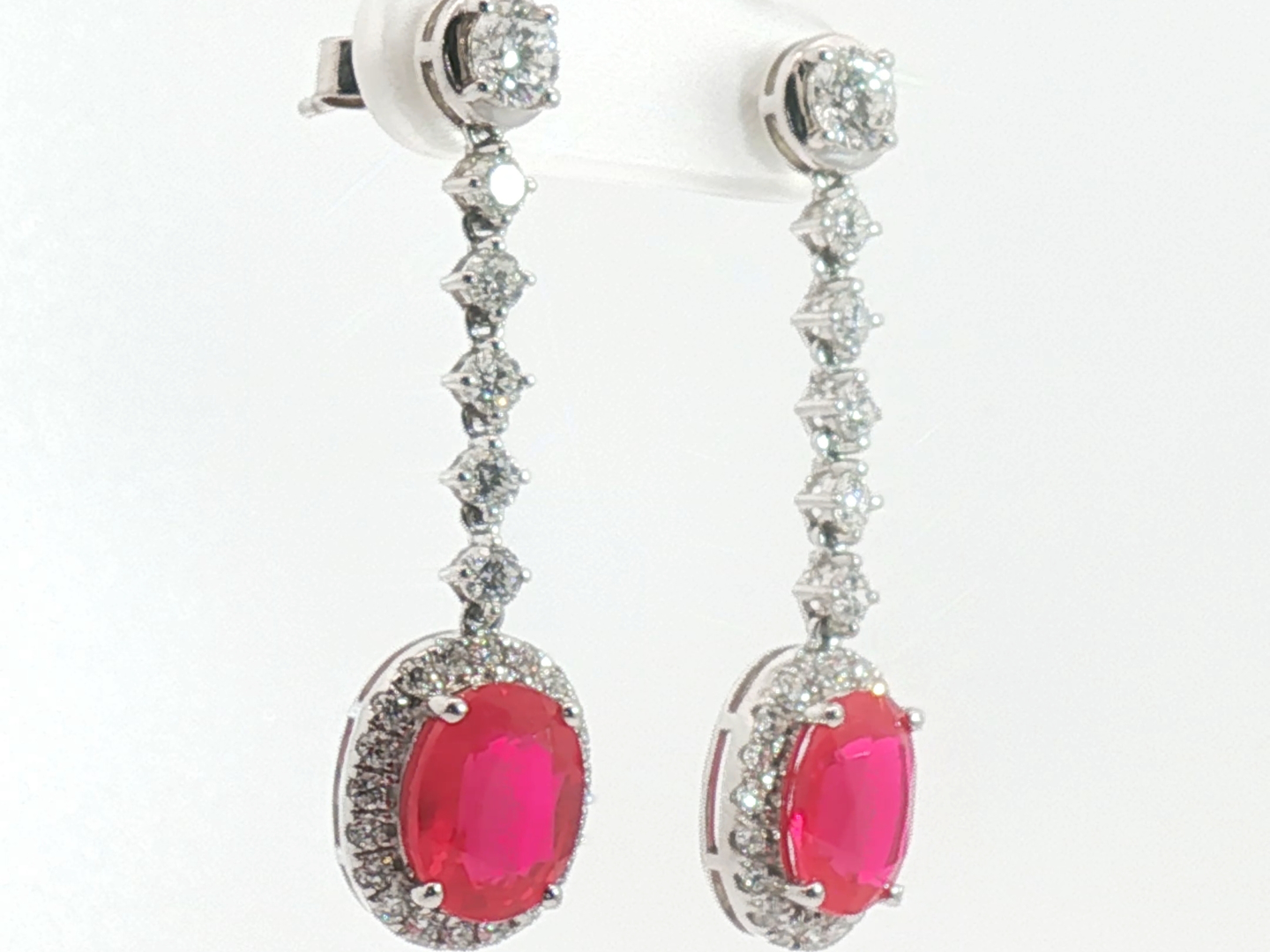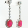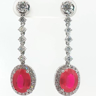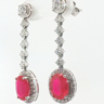 Pair of earrings set with 2 vivid red rubies, surrounded by 52 white brilliant-cut diamonds
