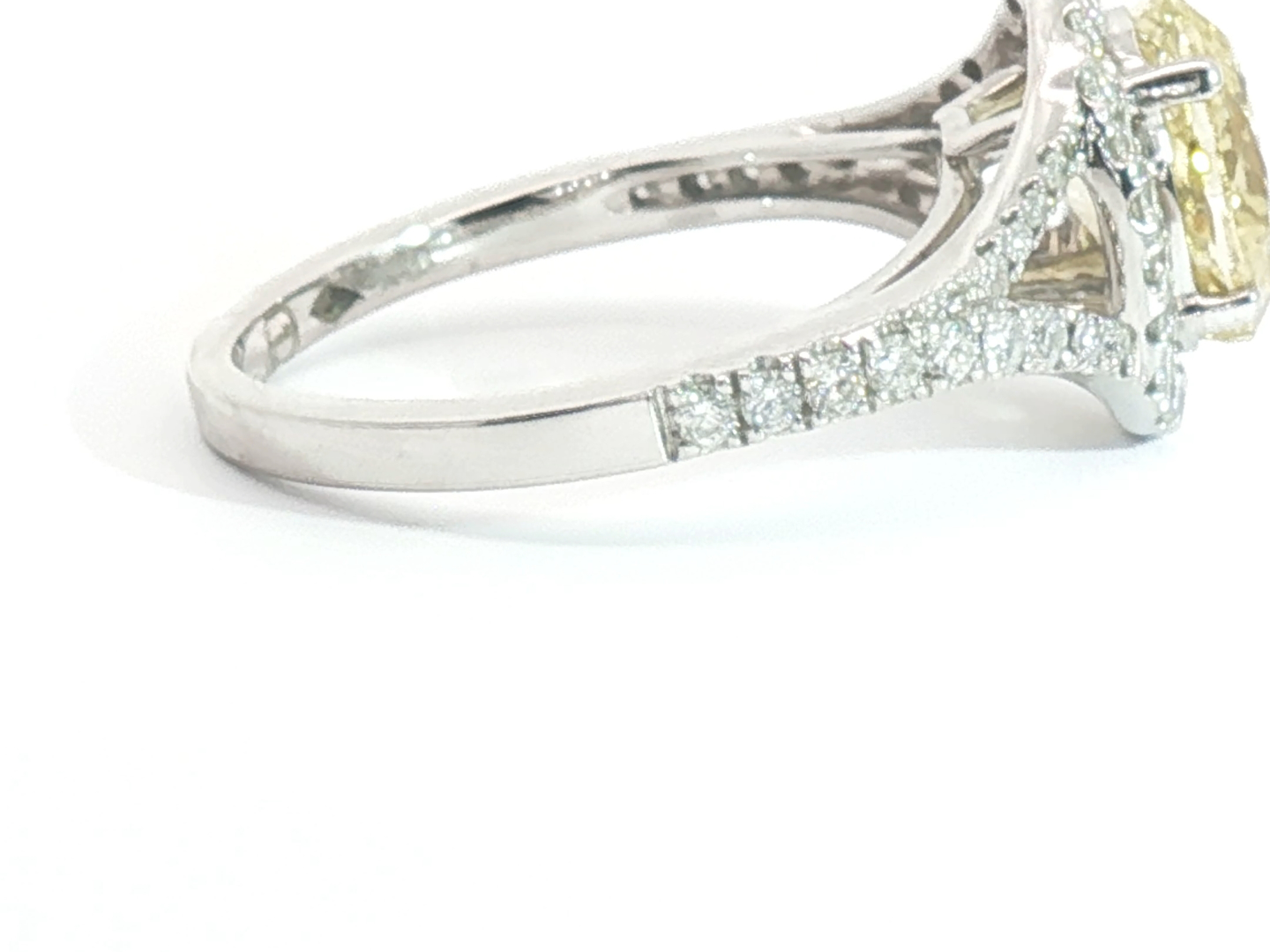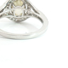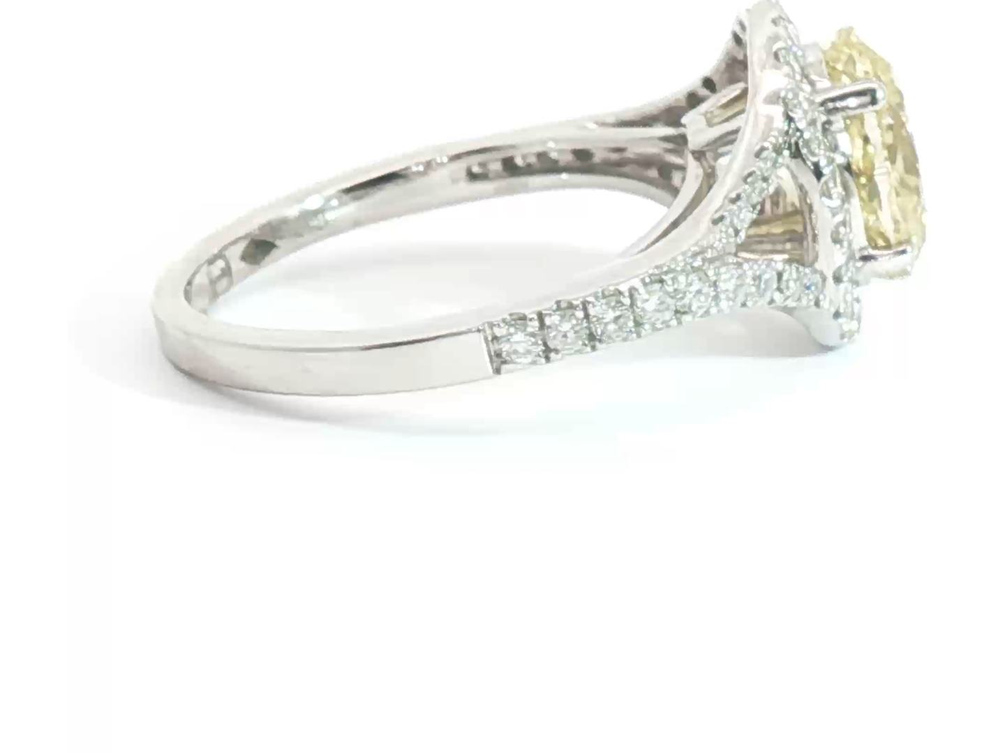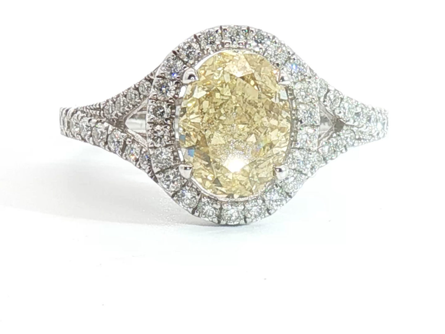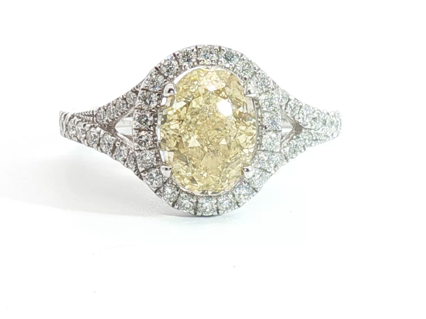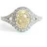 Ring with GIA certificate set with 1 diamond - oval cut, fancy light yellow: 2.15ct, color: VS1. Surrounded by 48 small brilliant-cut diamonds, total: +-0.76ct, color: D-E-F and clarity: VS. Set in 18kt white gold (marked 750). Ring size: 51-54