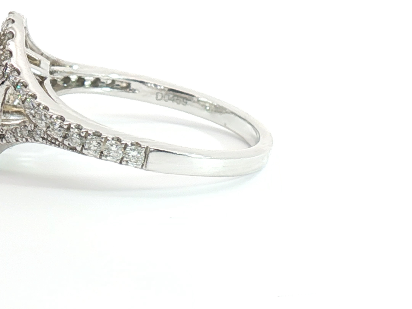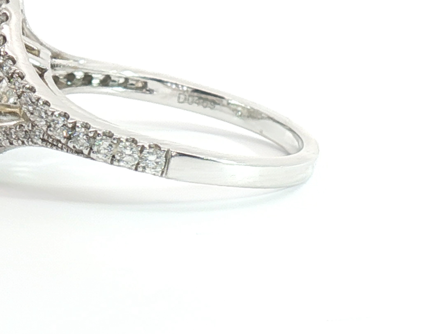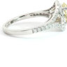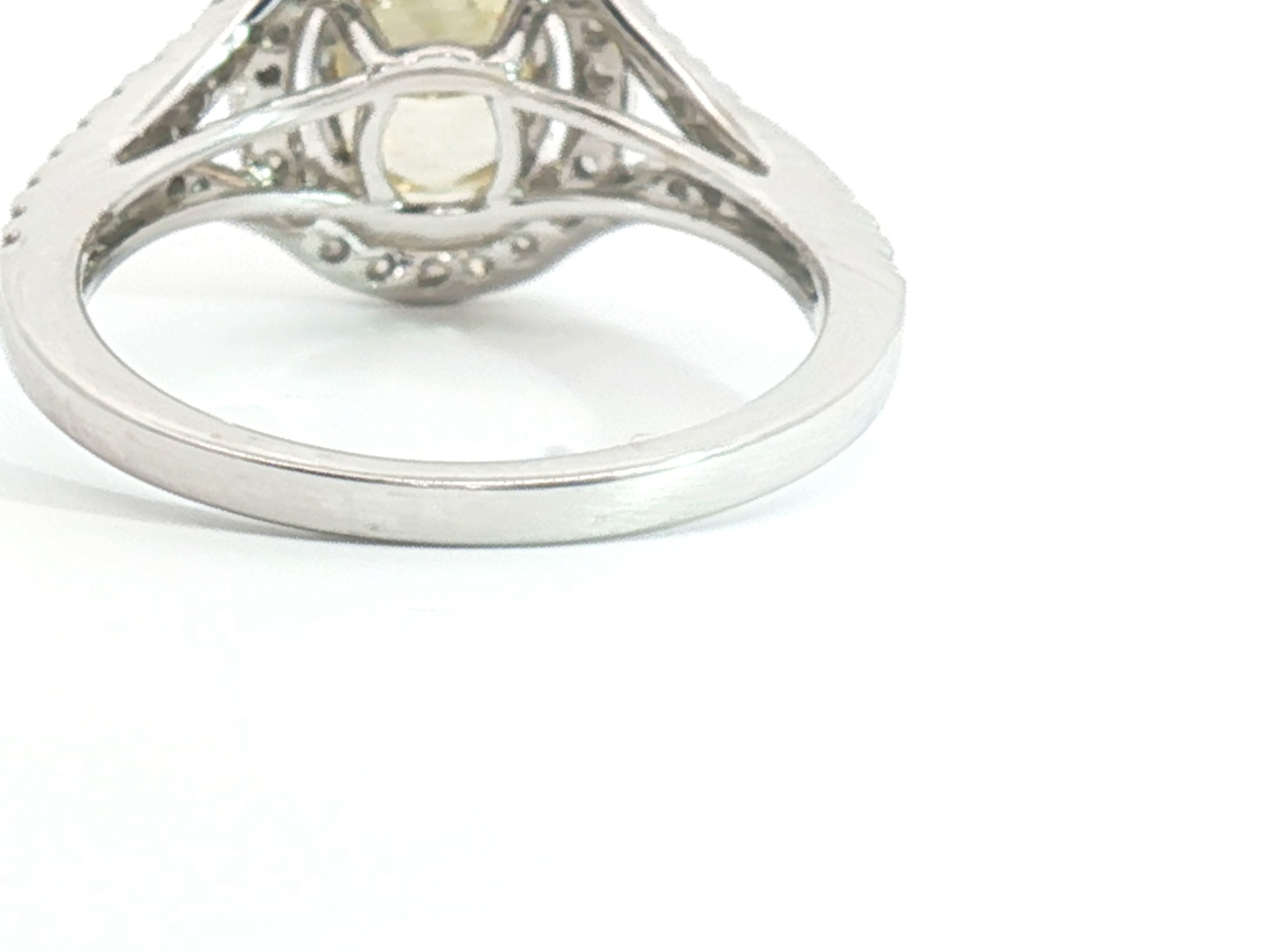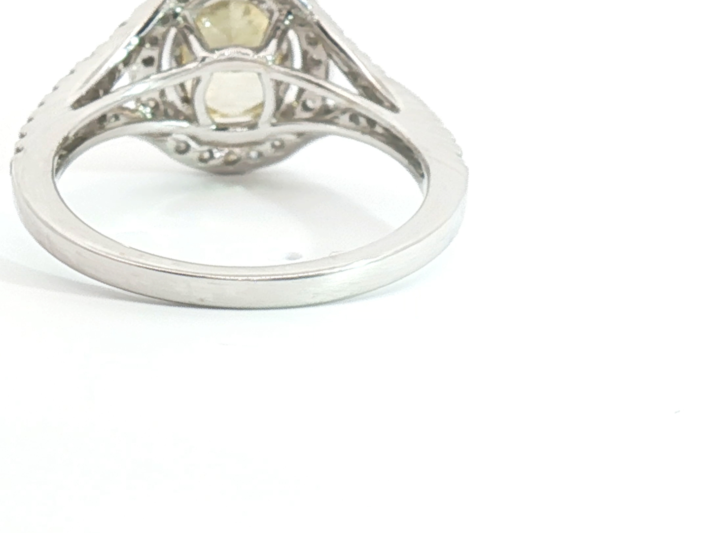 Ring with GIA certificate set with 1 diamond - oval cut, fancy light yellow: 2.15ct, color: VS1. Surrounded by 48 small brilliant-cut diamonds, total: +-0.76ct, color: D-E-F and clarity: VS. Set in 18kt white gold (marked 750). Ring size: 51-54