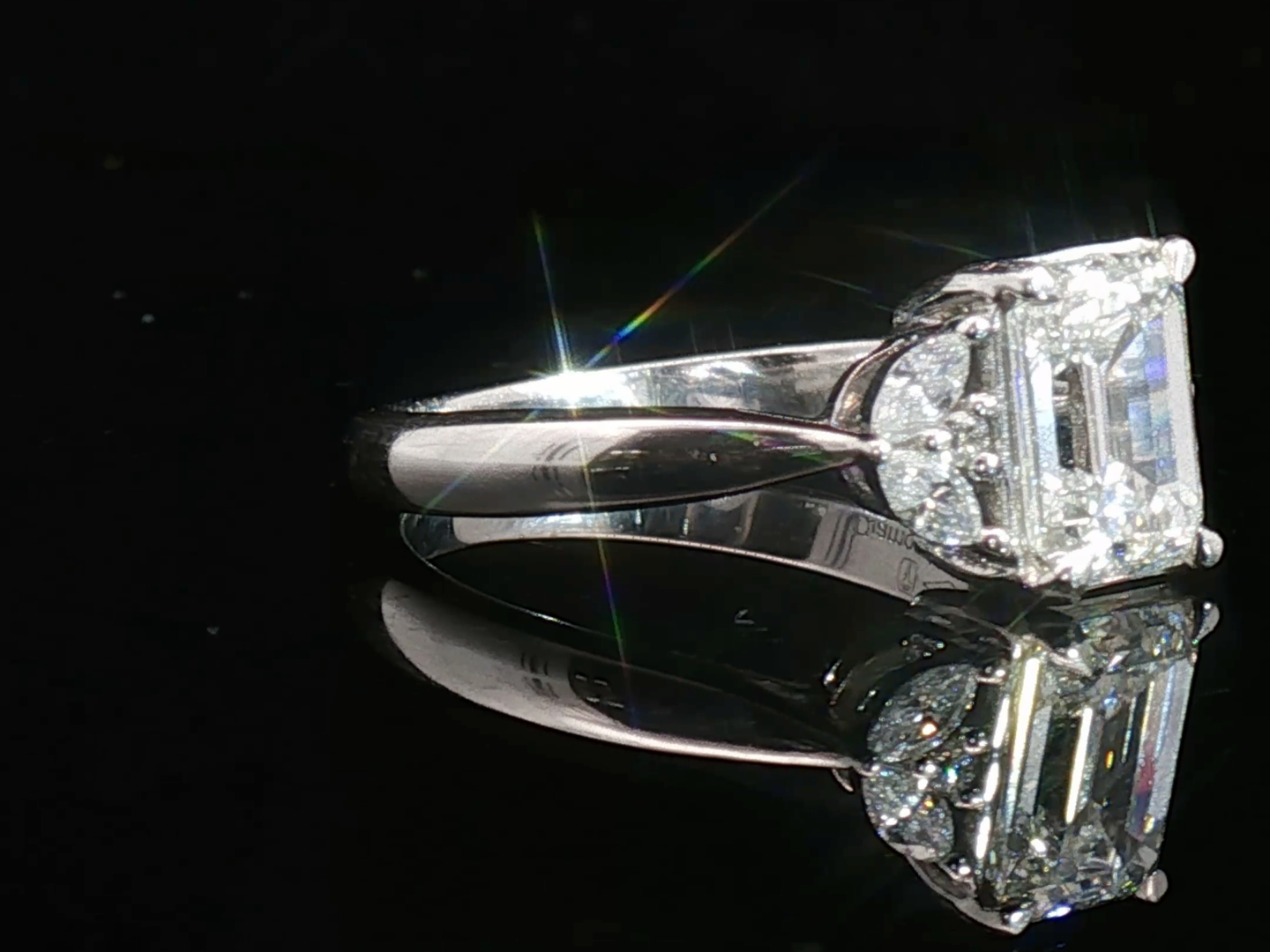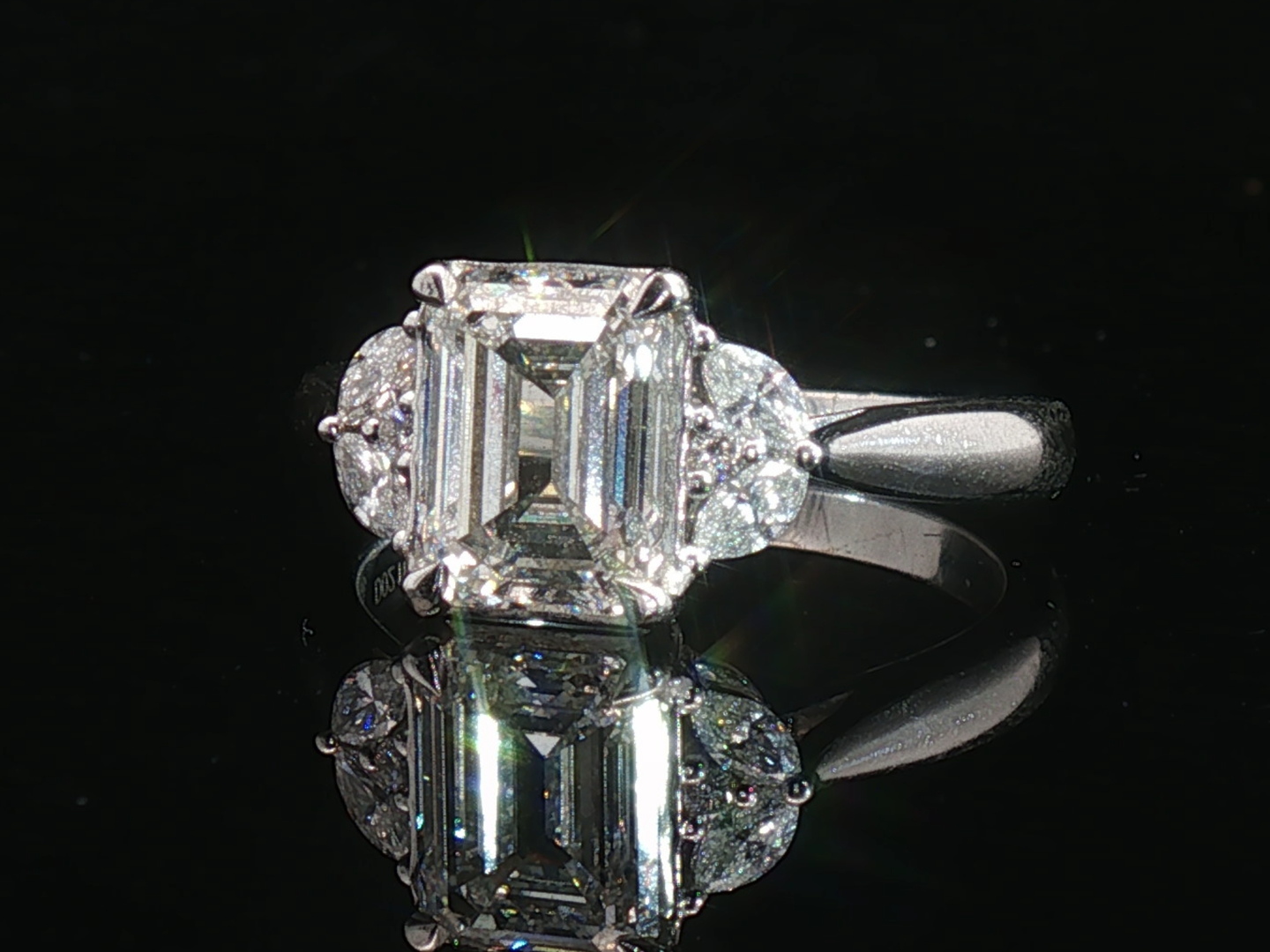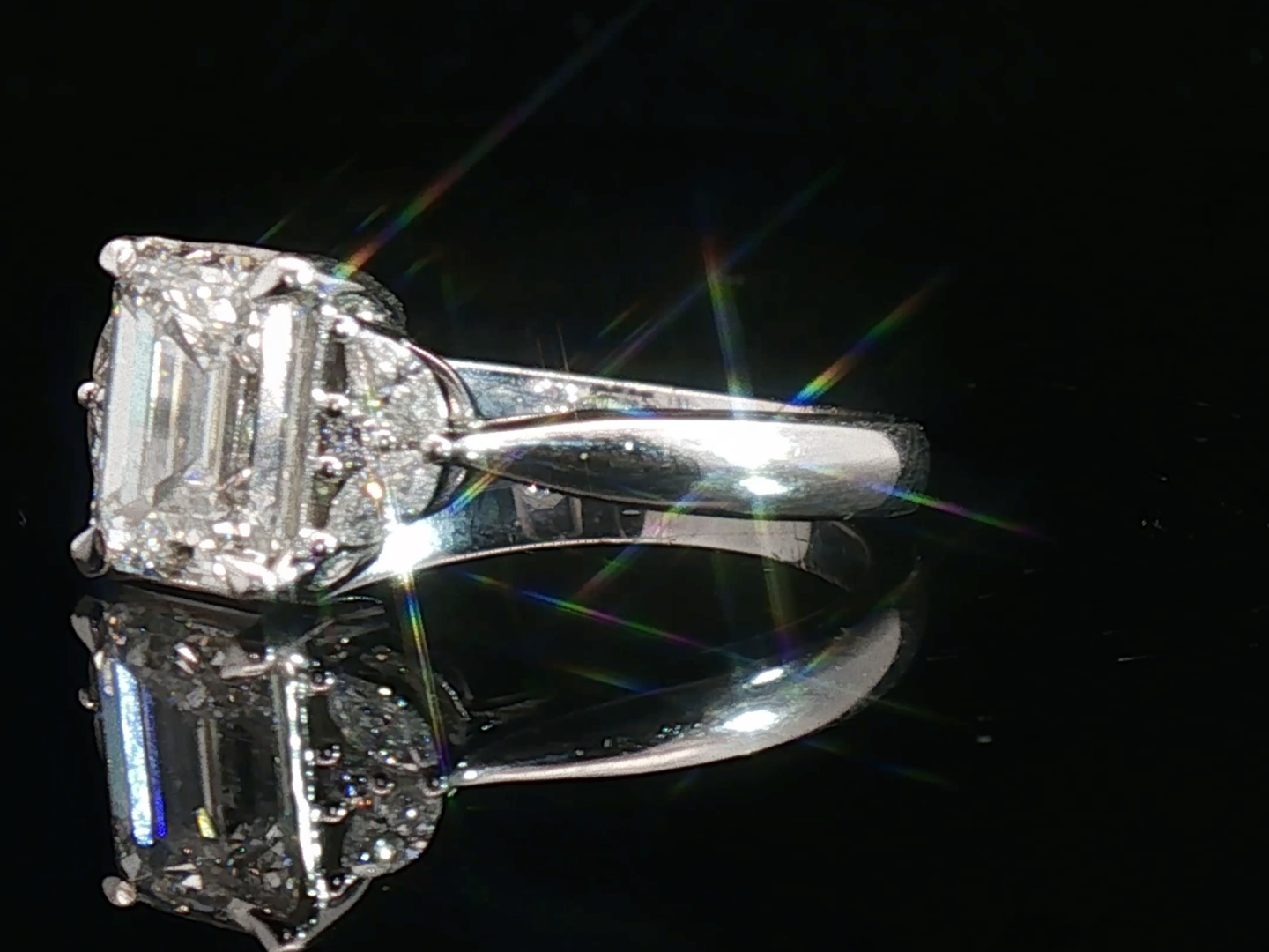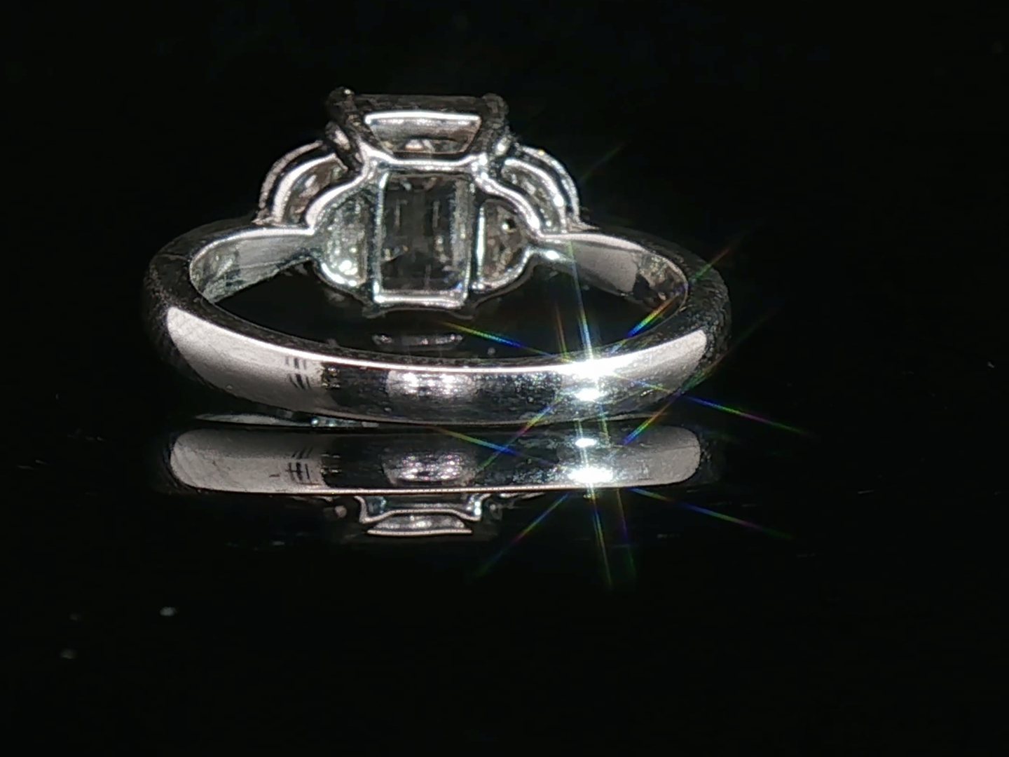 Quality ring set with 1 white emerald-cut diamond of +-2.00ct, color: F-G and clarity: VS. Surrounded by 4 marquise-cut diamonds + 2 brilliant-cut diamonds, total: 0.60ct, color: F-G and clarity: VS. Set in 18kt white gold (stamped 750). Ring size: 51-53