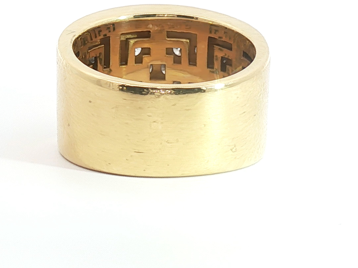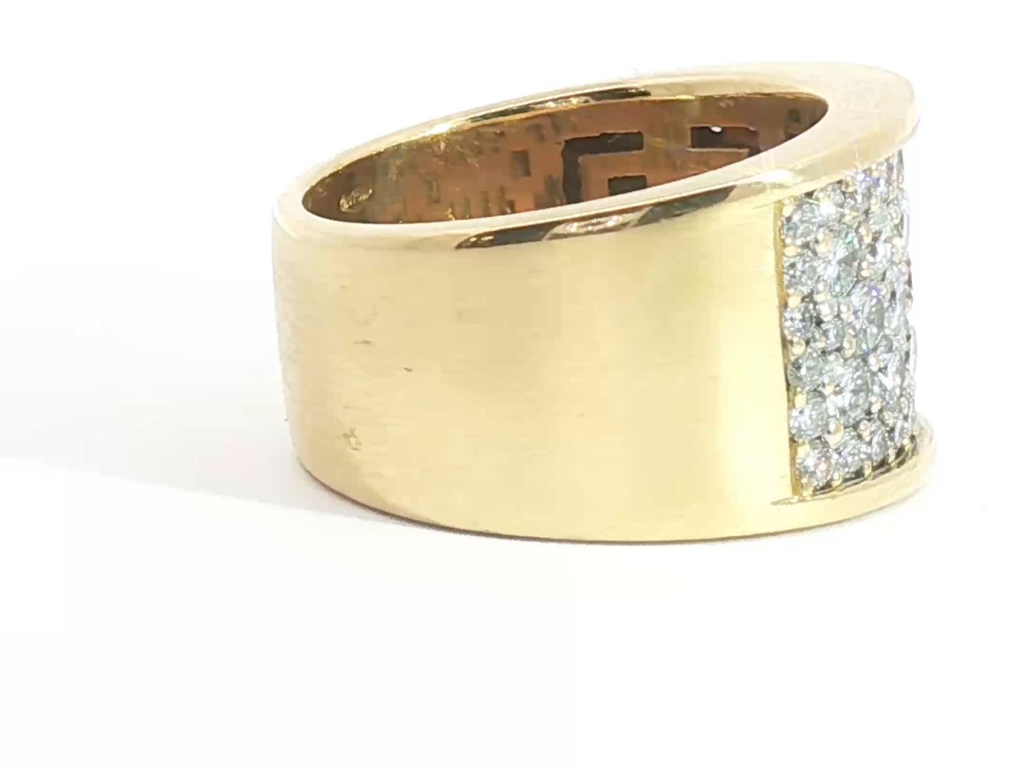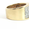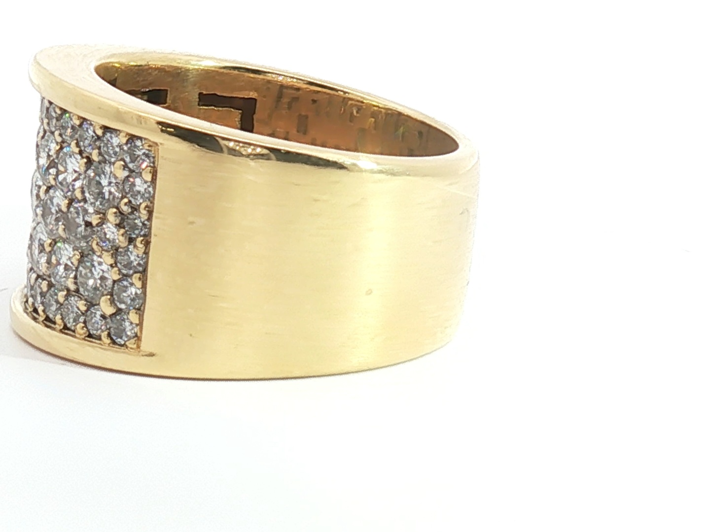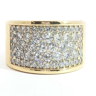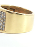 Solid ring set with 5 rows of white diamonds - 56 brilliant cut, total: +-3.00ct, color: I and clarity: VS. Set in 18kt yellow gold (marked 750). Ring size: 55-58 and weight: 17.50 grams