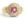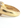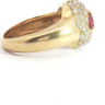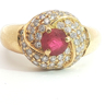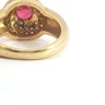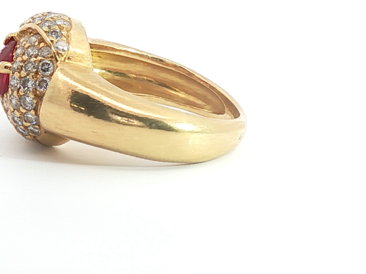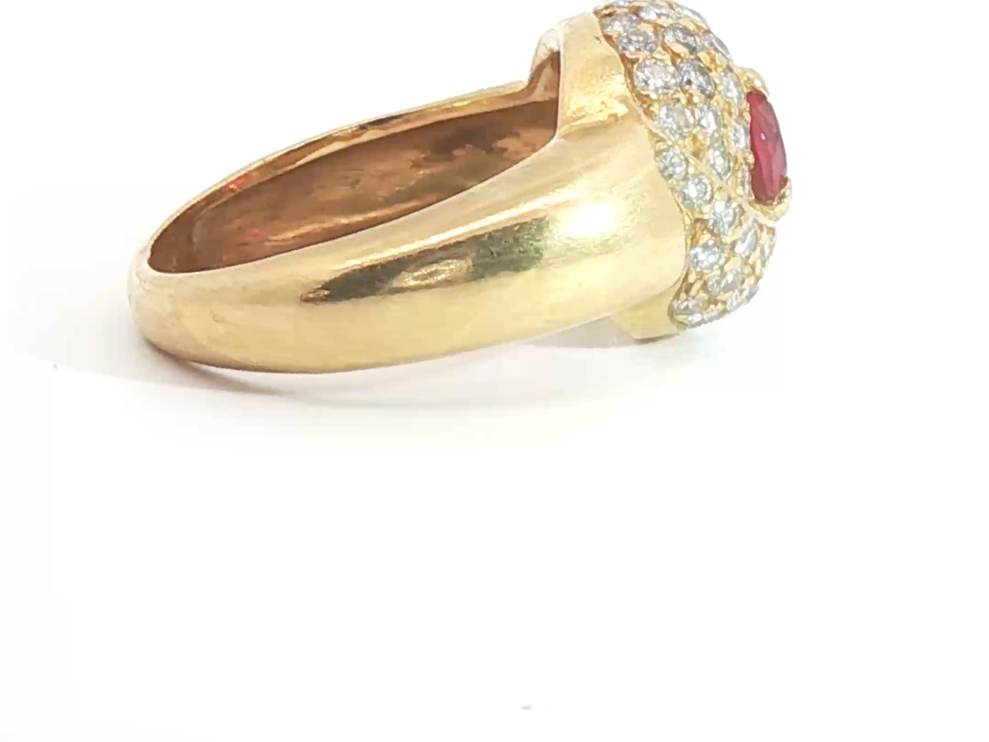 Ring in 18kt yellow gold, set with 1 vivid red ruby, surrounded by 60 brilliant diamonds