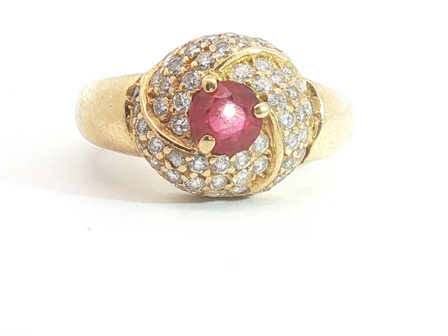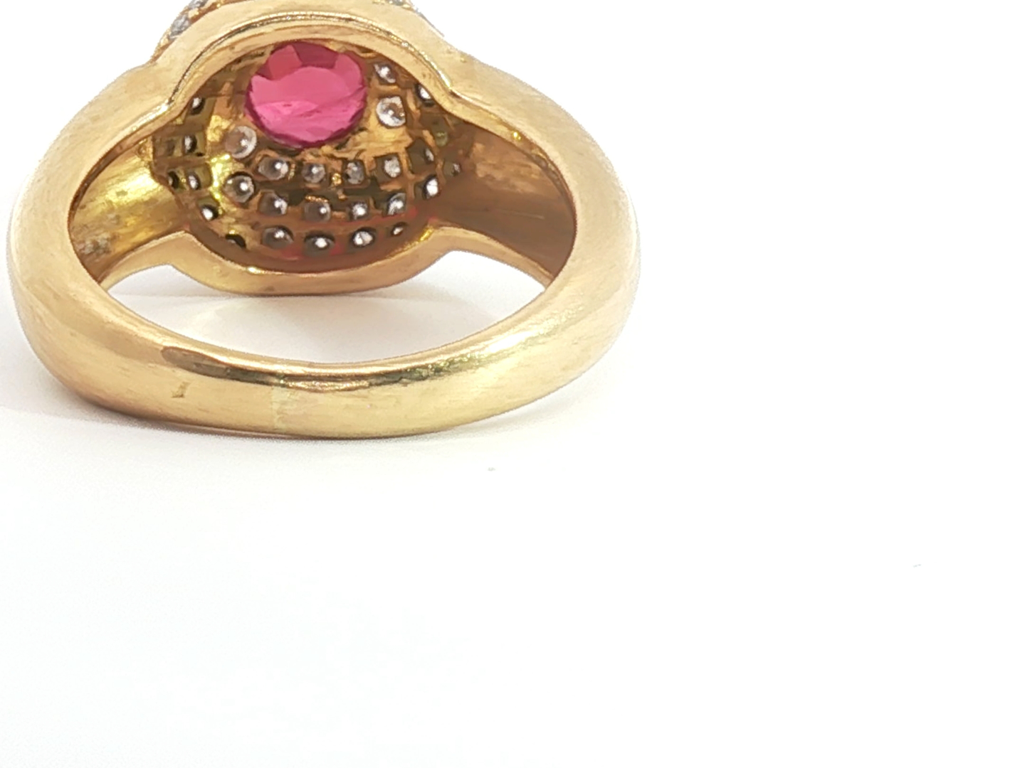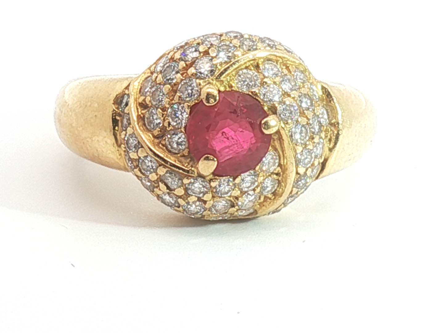 Ring in 18kt yellow gold, set with 1 vivid red ruby of +-0.50ct, surrounded by 60 brilliant-cut diamonds: +-0.60ct, color: I and clarity: VS. Ring size: 50-51 and weight: 7.1 grams