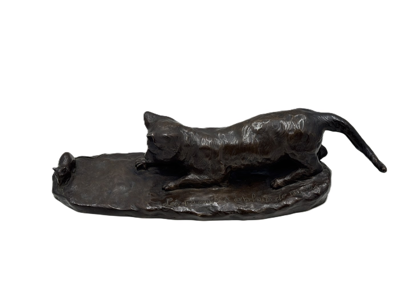 The first heroic deeds of Minet: bronze figurine of cat and mouse, drawn. Dimensions: 11 x 40 cm