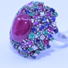 Large unique colorfull ring with ruby natural cabochon shape + emeralds + rubies + sapphires + brilliants