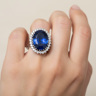 Ring in white gold 18ct. with 1 treated sapphire of 12cts. and surrounded by 28 brilliants