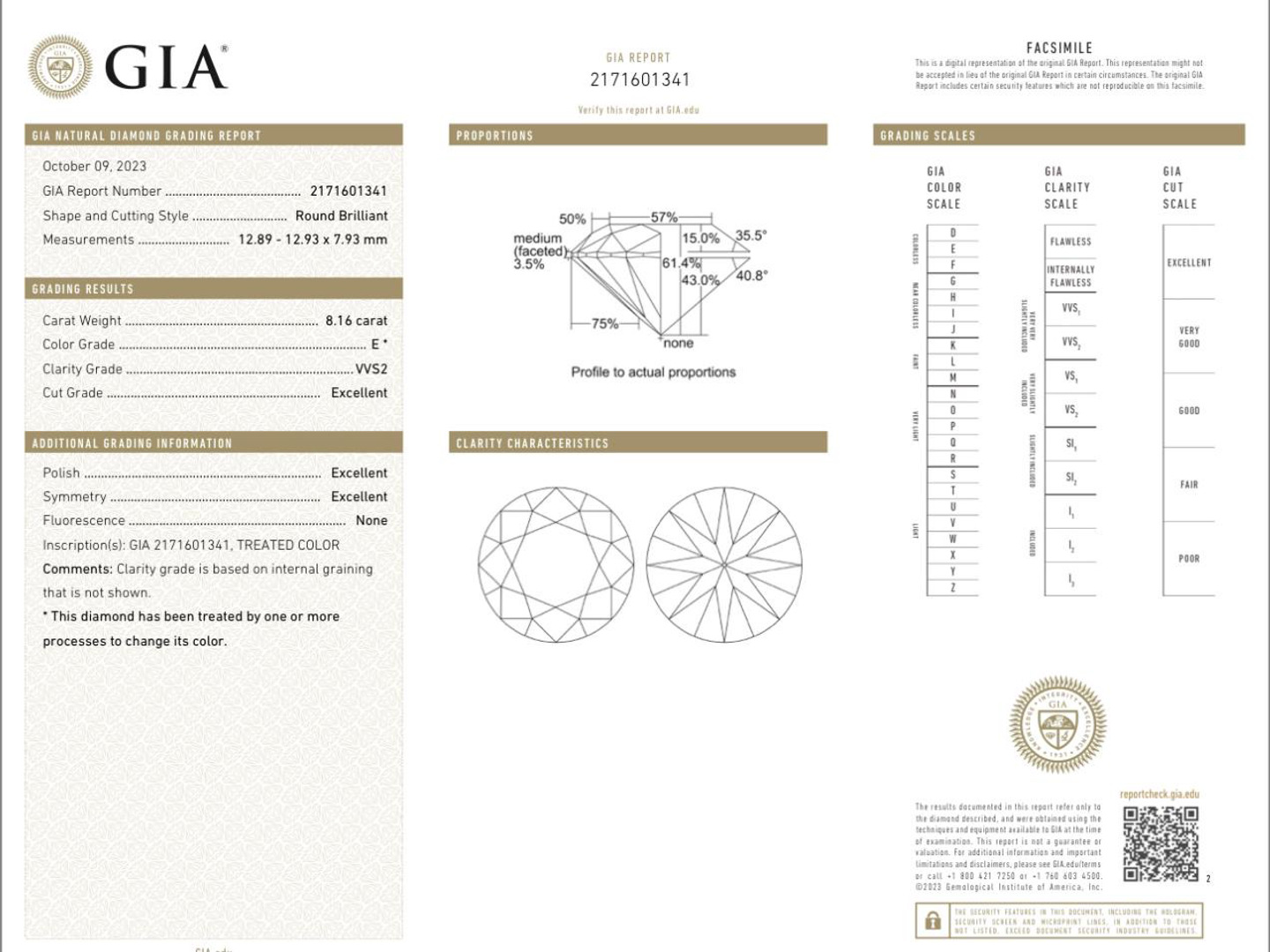 Ring with top quality solitair brilliant of 8,16cts. color: E and clarity: VVS2 with GIA certificat set in white gold 18ct. (hallmark 750)