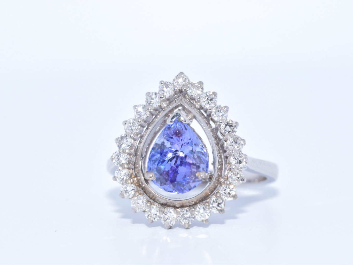 Exclusive ring set with 1 tanzanite pear cut of +- 1.60ct. surrounded by 23 brilliants 0.46ct.