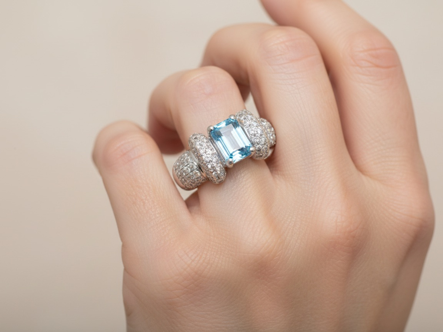Exclusive ring set with 1 intensive light blue diamond +- 1.40ct. surrounded by 128 brilliants +- 1.30ct.