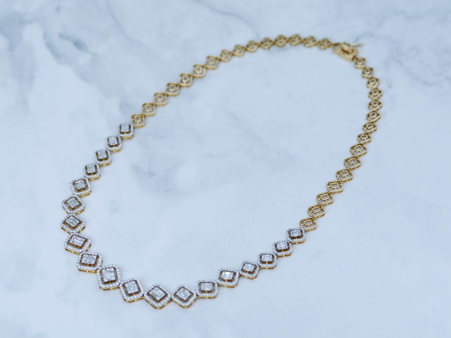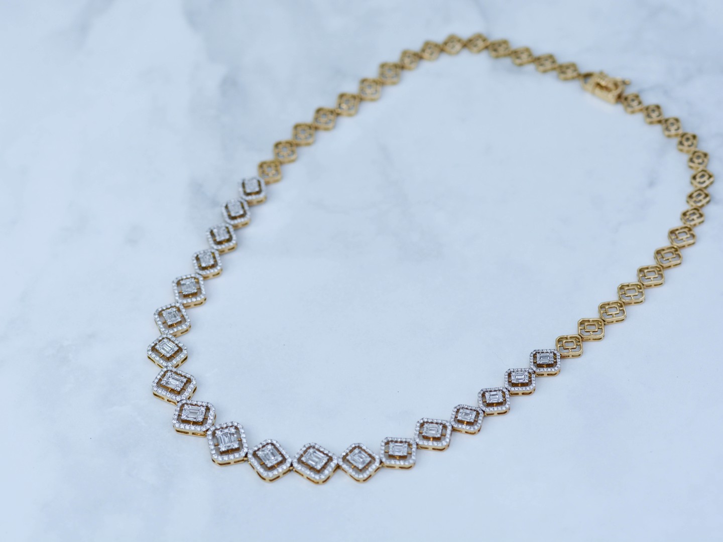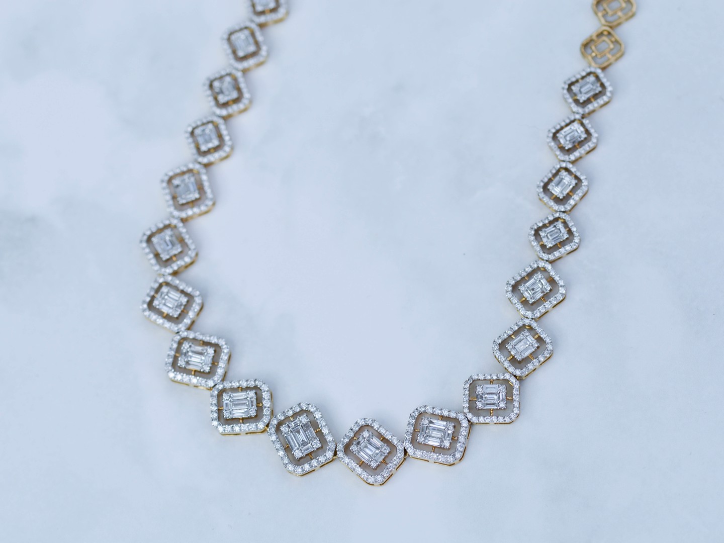 Sublime necklace illusion setting in yellow and white gold 18kt set with 502 brilliants + 95 diamonds emerald cut total: +-7.00CT, color: D-F-G and clarity: VS. weight: 31 grams