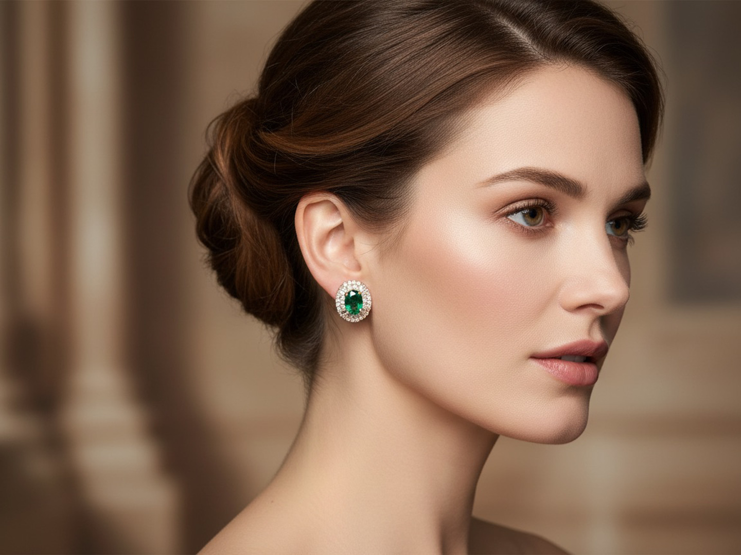 A pair of quality earrings set with 2 Colombian emeralds: about 2.00CT, surrounded by 52 diamonds + 16 tapered diamonds, totaling: about 0.80CT