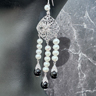A pair of beautiful earrings set with 6 onyx stones + 20 white pearls set with 108 small diamonds.