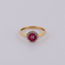 Elegant ring set with 4 vivid red rubies: approximately 0.50CT, surrounded by 18 small brilliant diamonds + 4 princess cut diamonds.