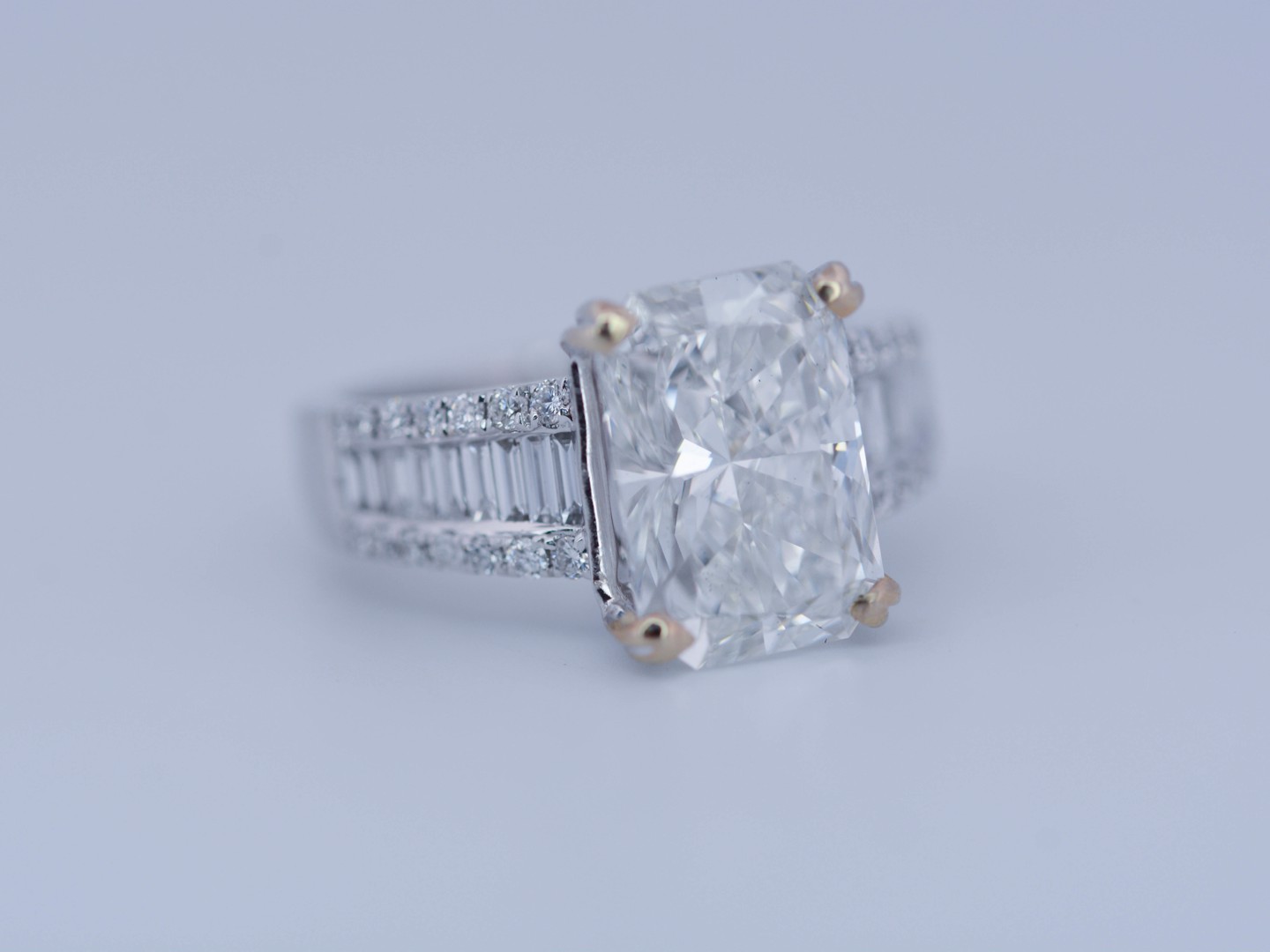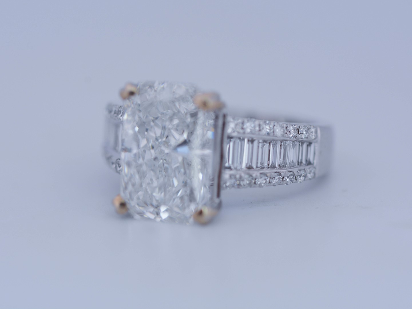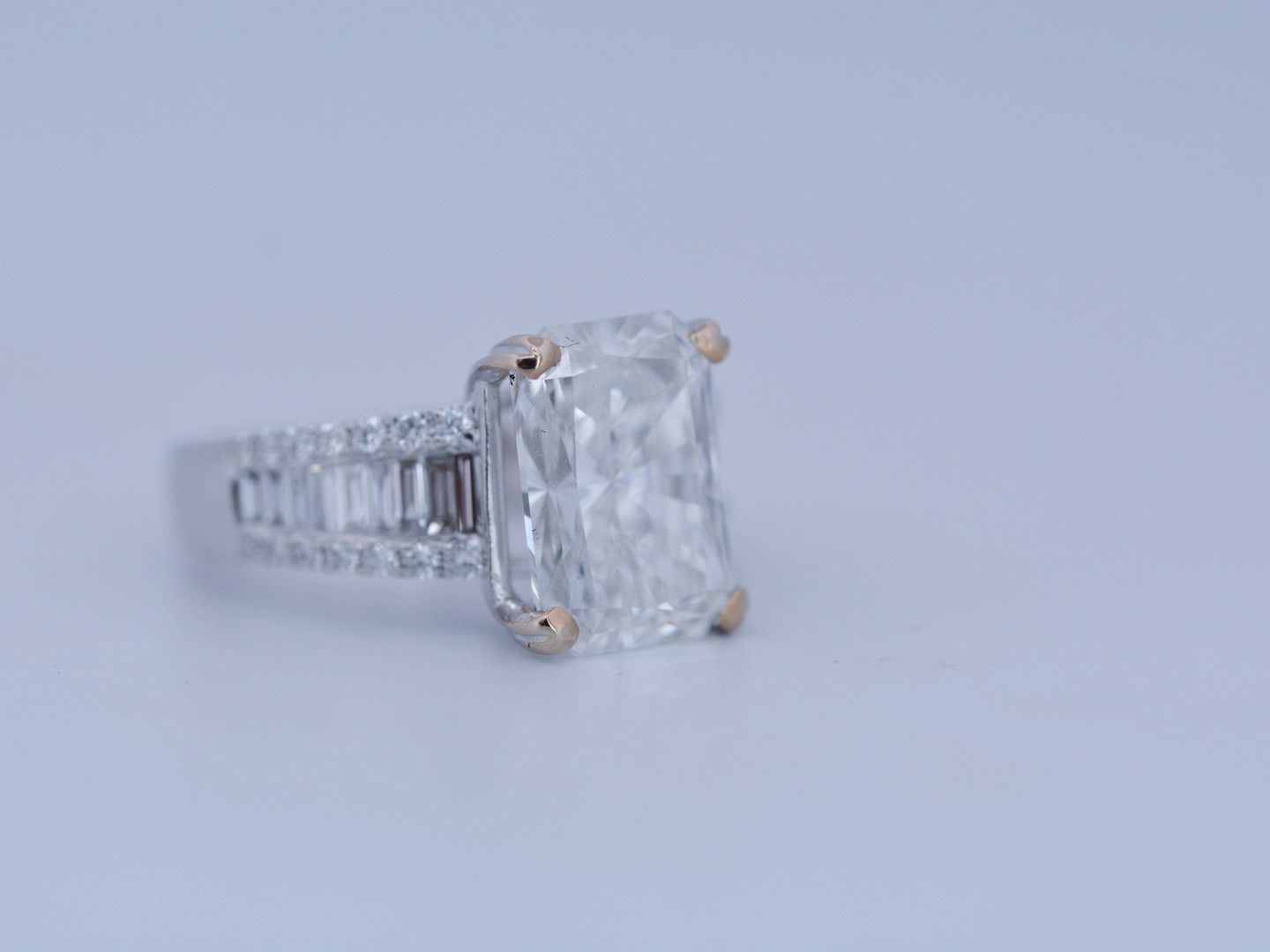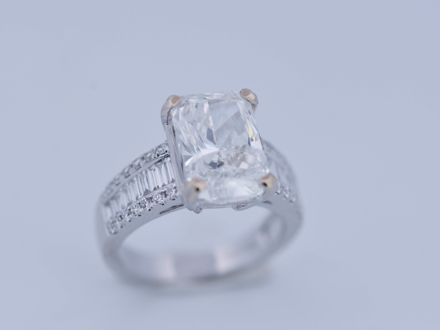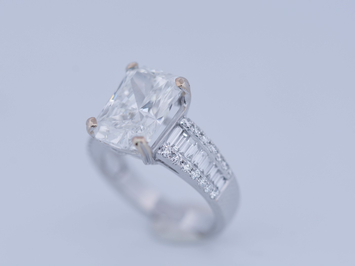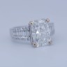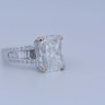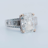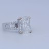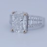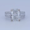 Exclusive ring featuring a white diamond with a radiant cut of: 5.00CT, and rectangular brilliant cut diamonds, color: F and clarity: VS2. Surrounded by brilliant + baguette cut diamonds, total: 1.00CT, color: D-F-G and clarity: VS. Set in 18kt white gold (marked 750). Ring size: 53-55.