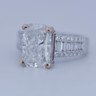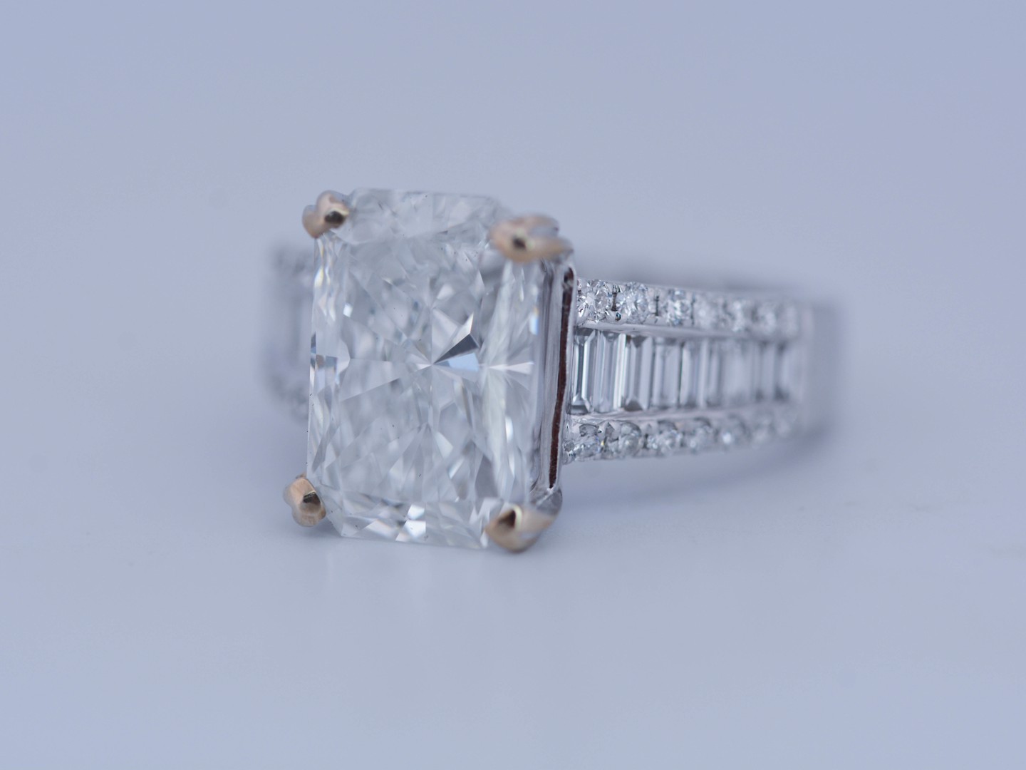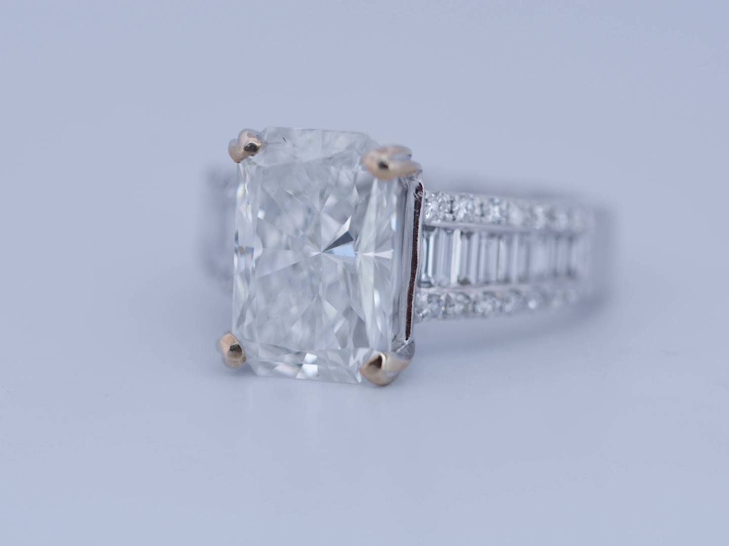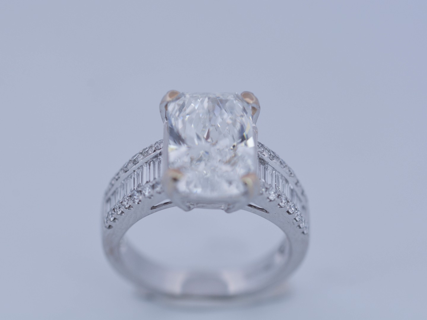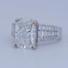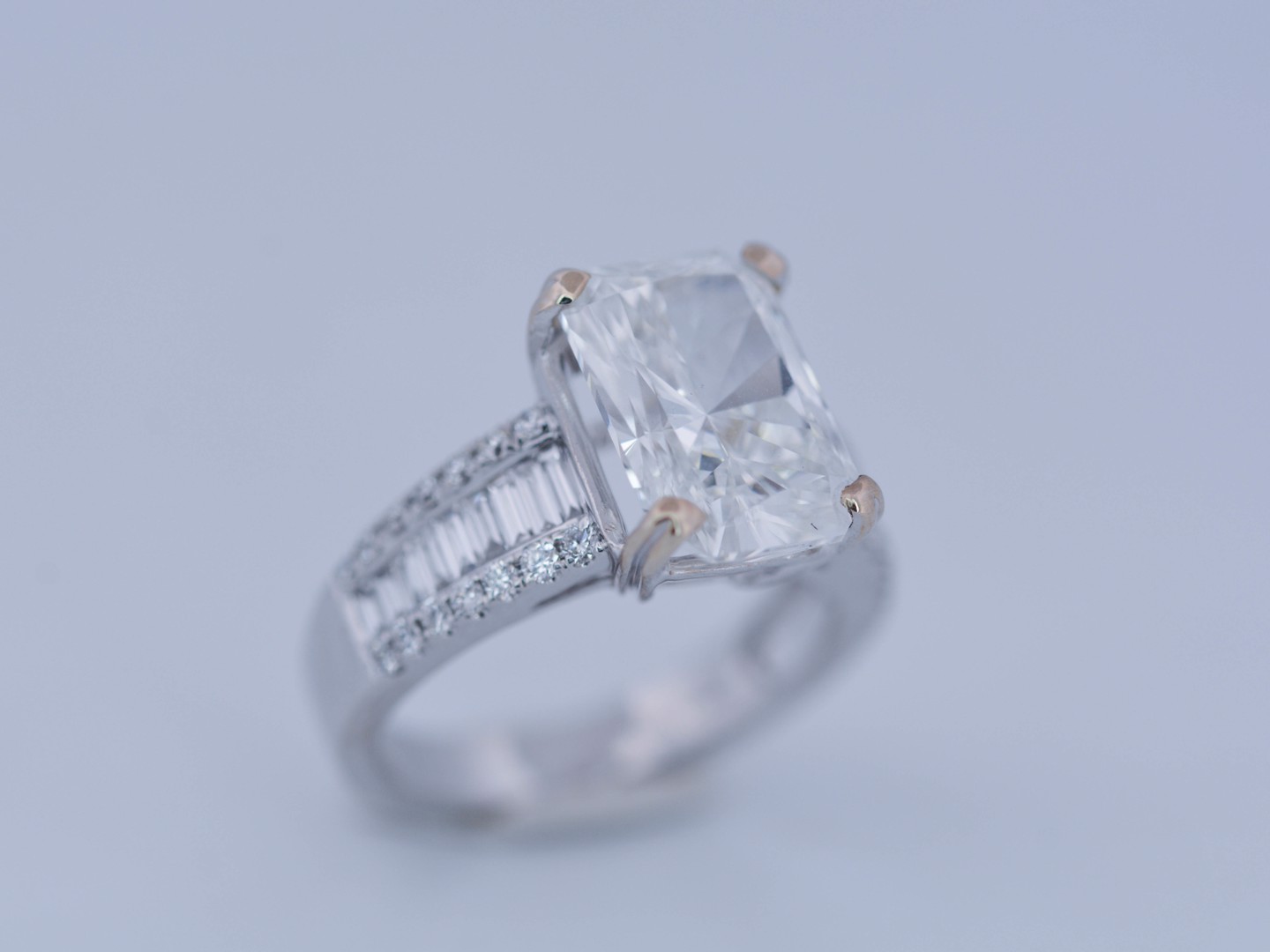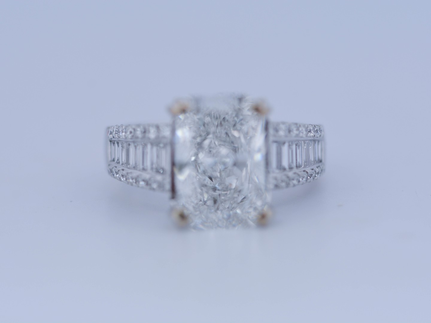 Exclusive ring featuring a white diamond with a radiant cut of: 5.00CT, and rectangular brilliant cut diamonds, color: F and clarity: VS2. Surrounded by brilliant + baguette cut diamonds, total: 1.00CT, color: D-F-G and clarity: VS. Set in 18kt white gold (marked 750). Ring size: 53-55.