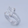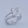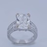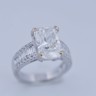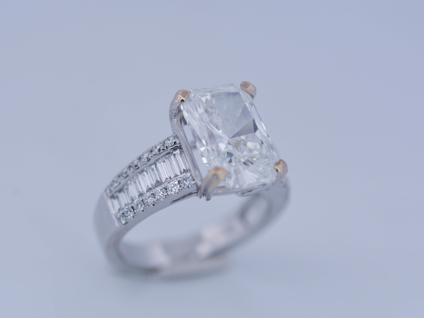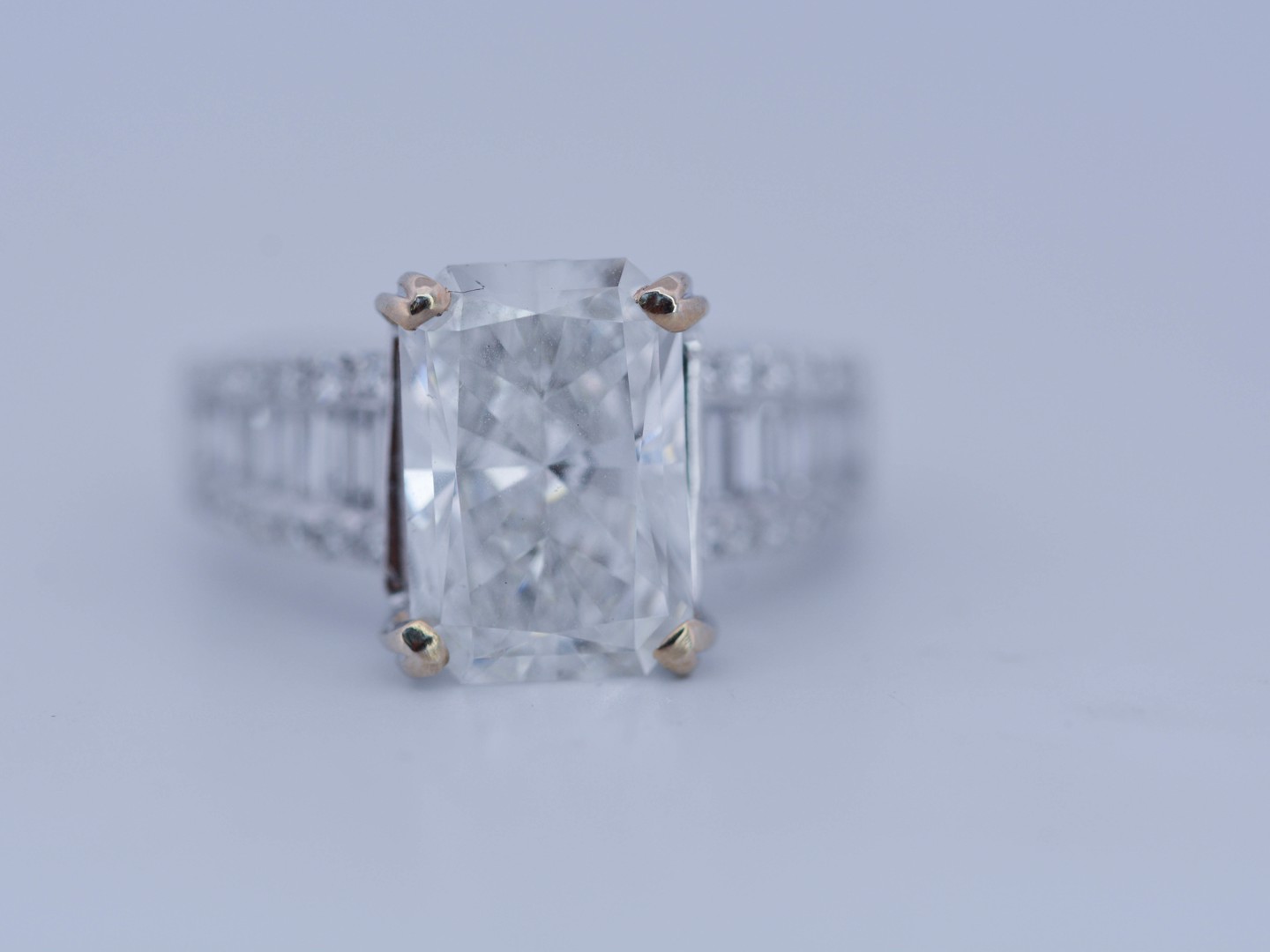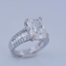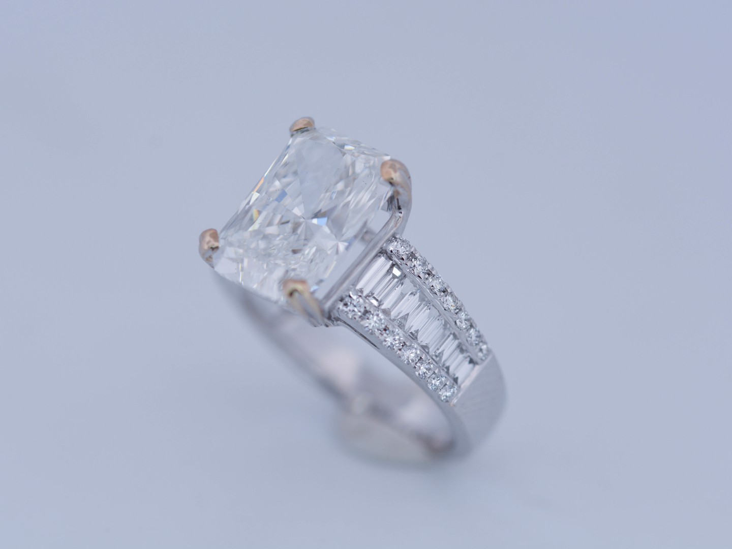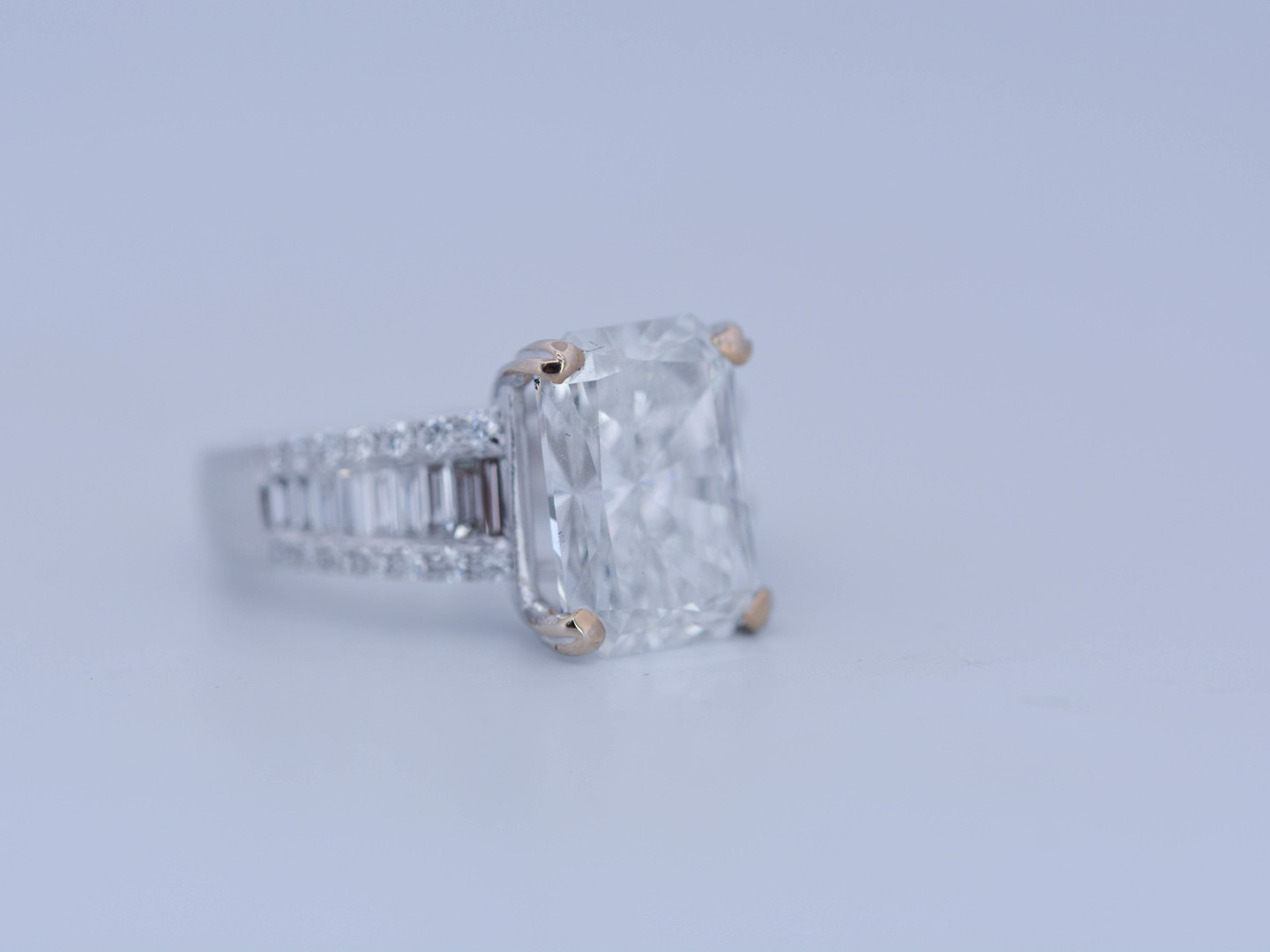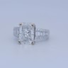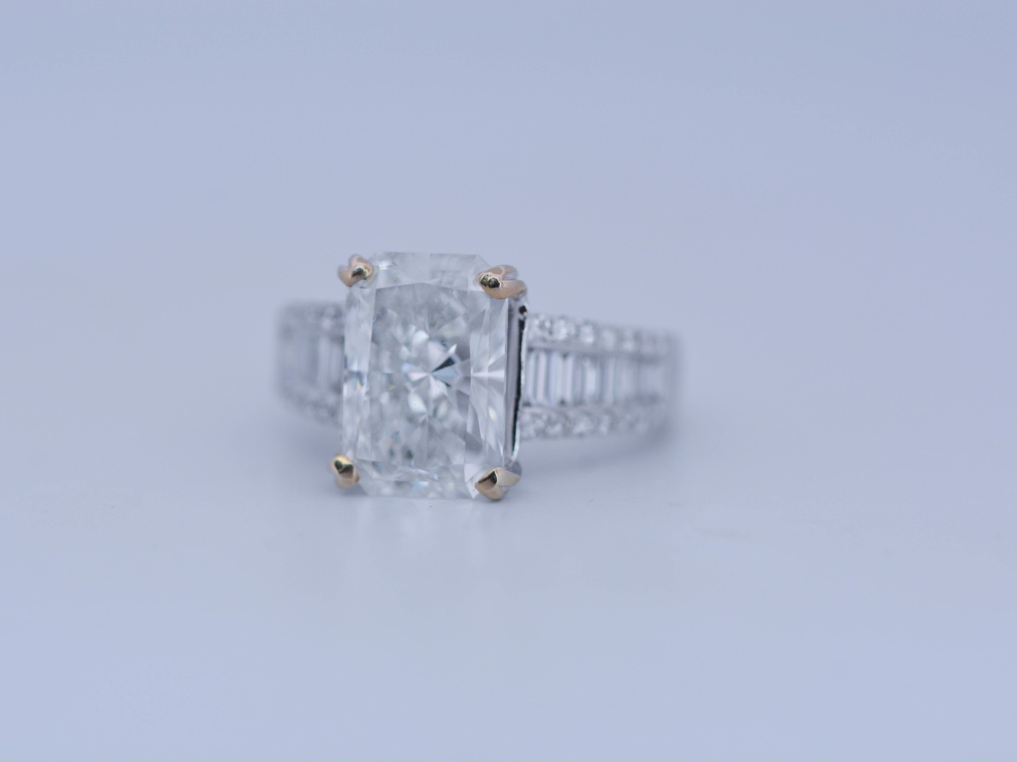 Exclusive ring featuring a white diamond with a radiant cut of: 5.00CT, and rectangular brilliant cut diamonds, color: F and clarity: VS2. Surrounded by brilliant + baguette cut diamonds, total: 1.00CT, color: D-F-G and clarity: VS. Set in 18kt white gold (marked 750). Ring size: 53-55.