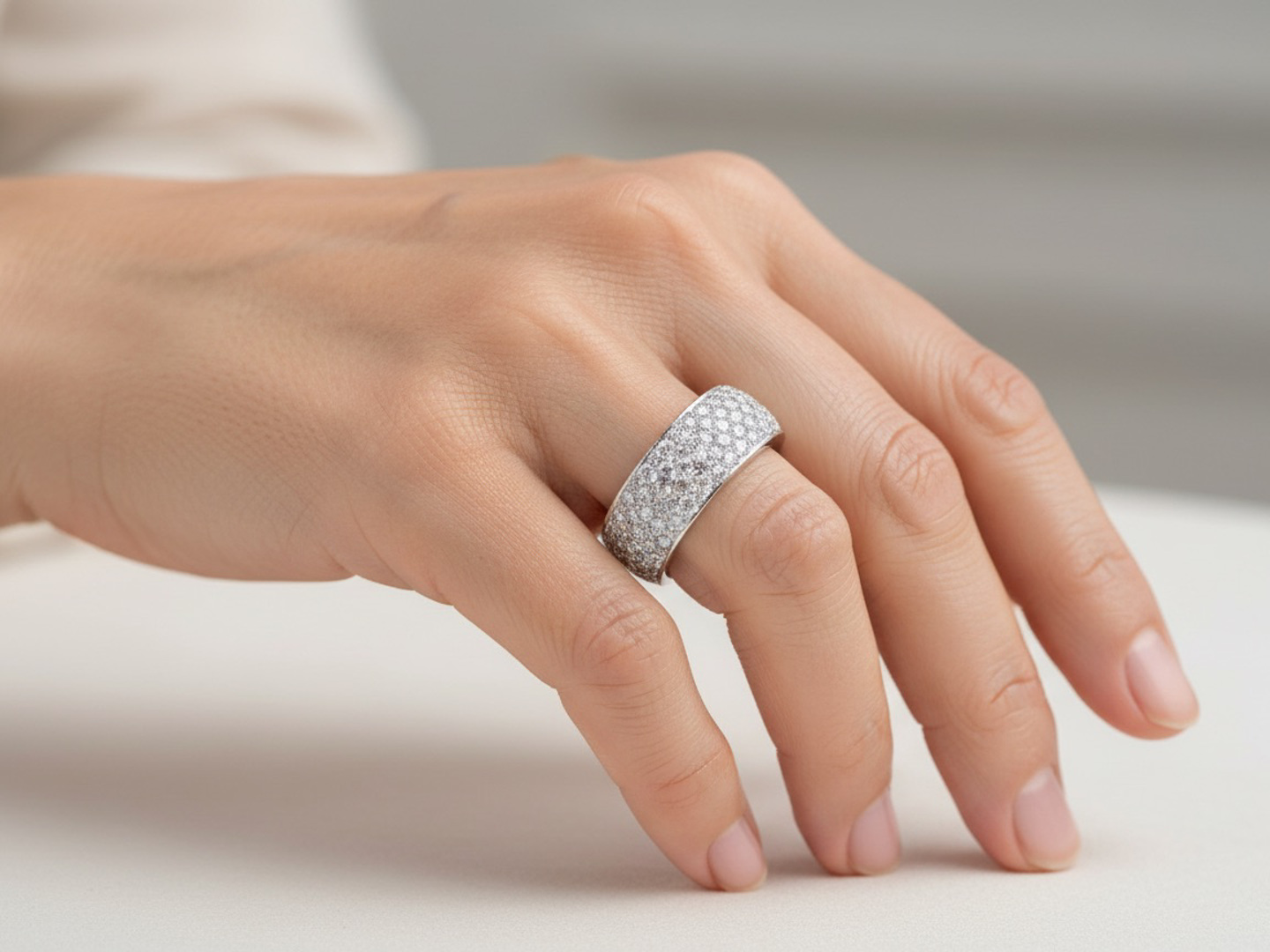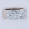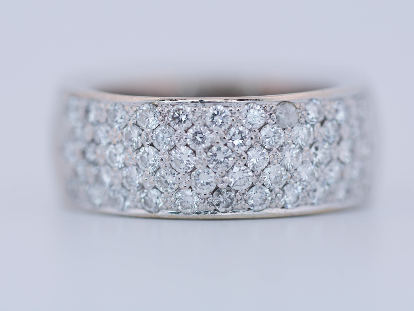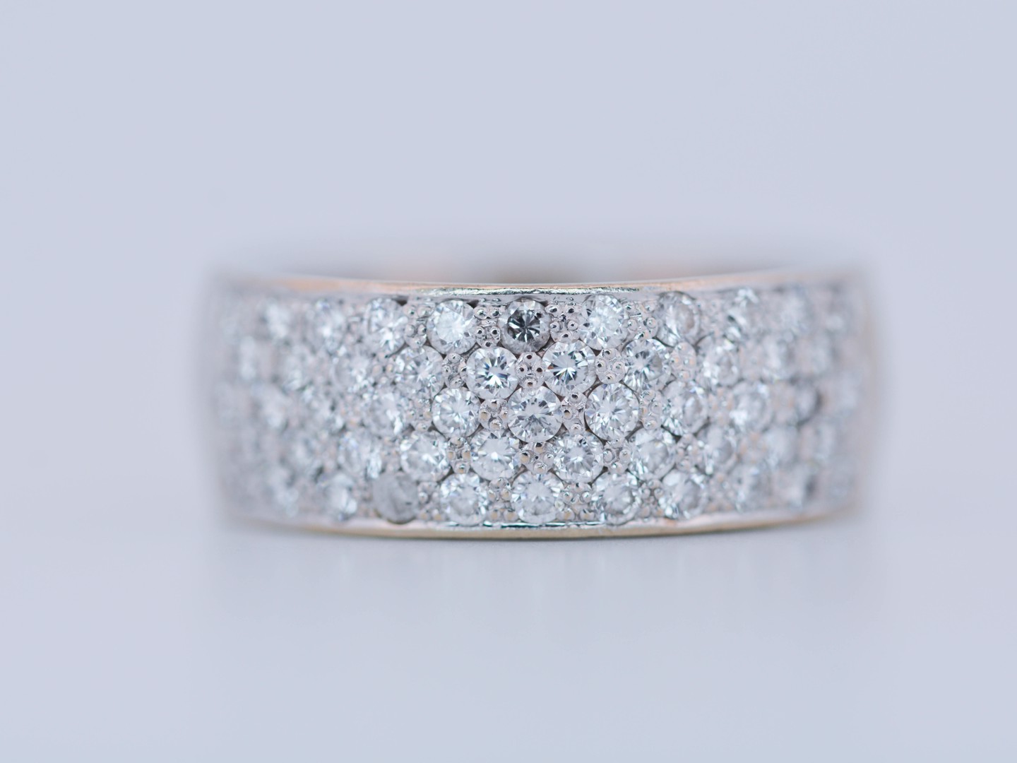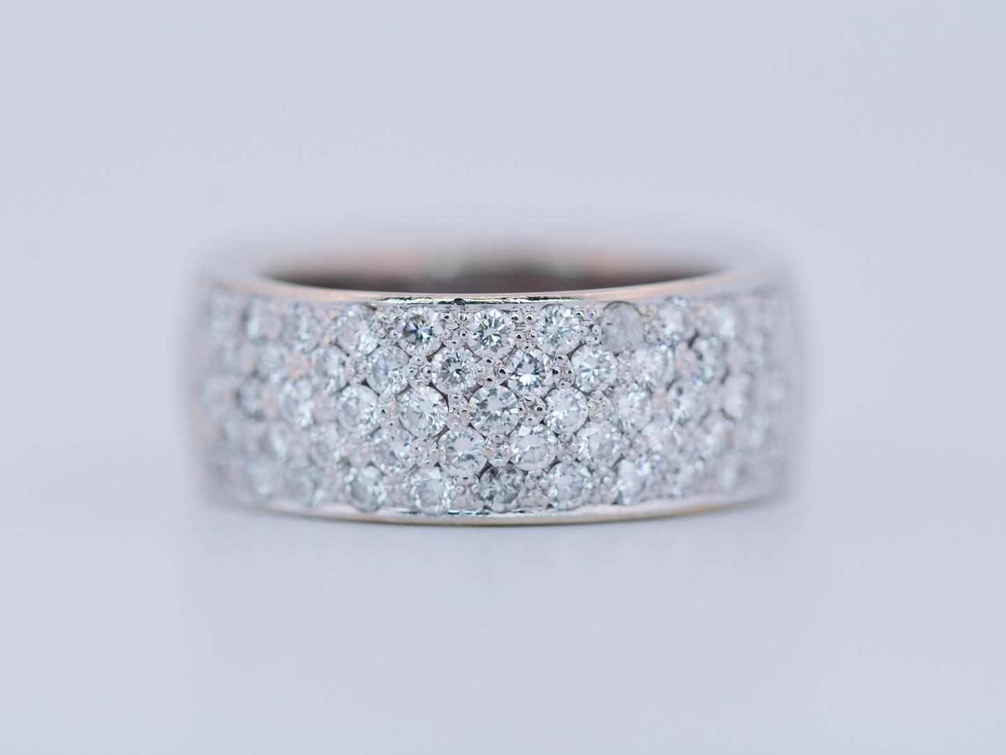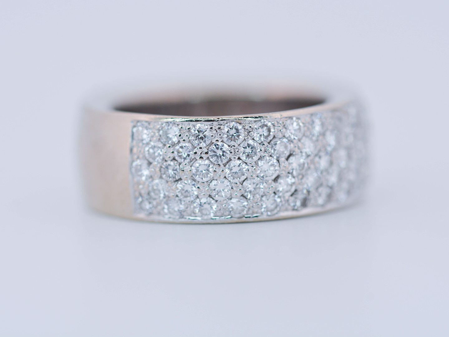 An elegant massive ring in 18 karat white gold (hallmark 750), set with 53 brilliant-cut white diamonds totaling approx. 1.06 ct (F color, VS clarity). Ring size: 52–54. Weight: 12.55 g. A bold yet refined creation where strength and sparkle are perfectly balanced.