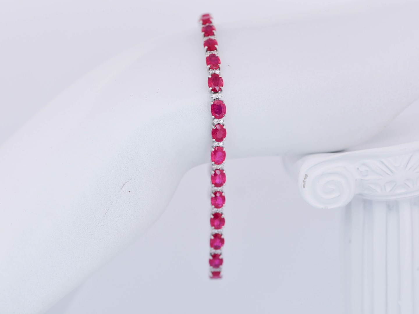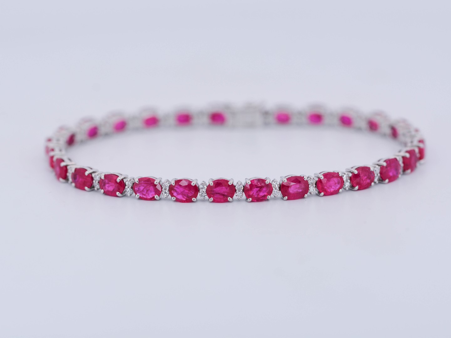 River bracelet set with 28 rubies: +-12.30CT (marked) + 56 small white diamonds: +-0.55CT, color: I and clarity: VS. Set in 18kt white gold (marked 750). Length: 18cm.