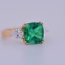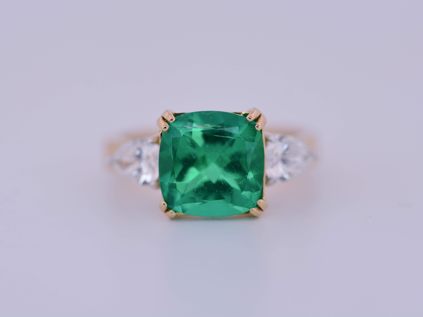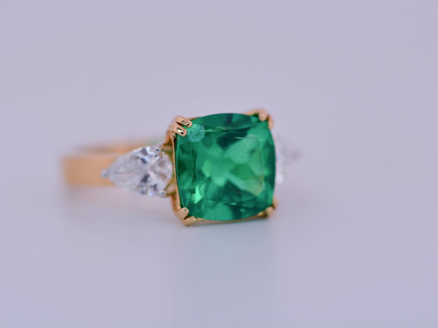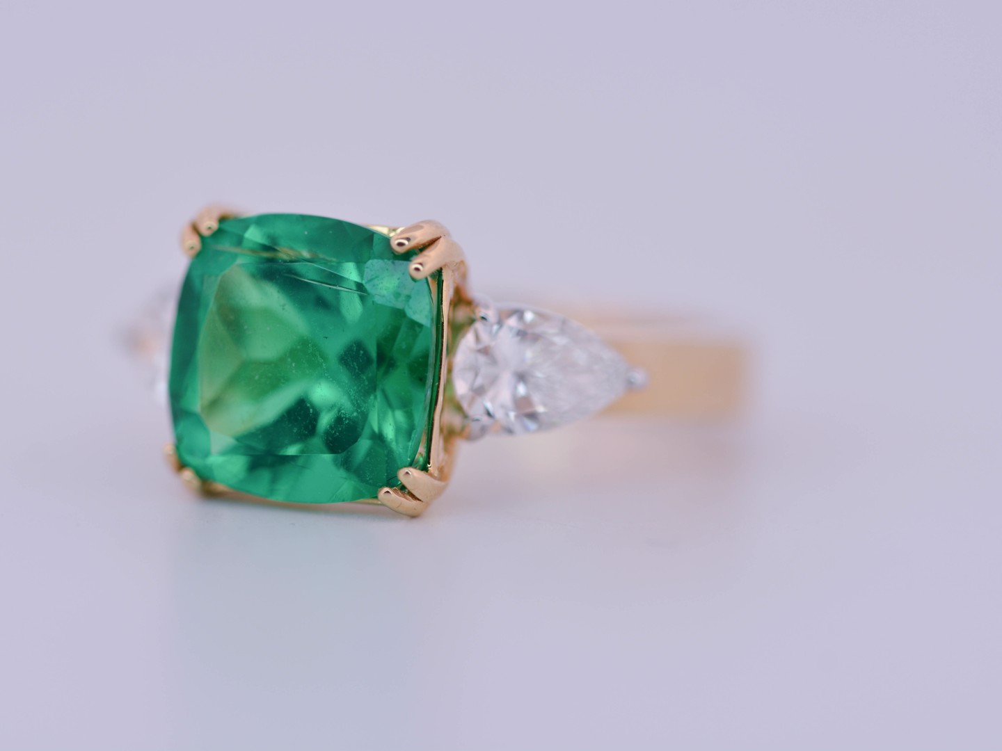Quality ring with 1 emerald + 2 diamonds pear cut