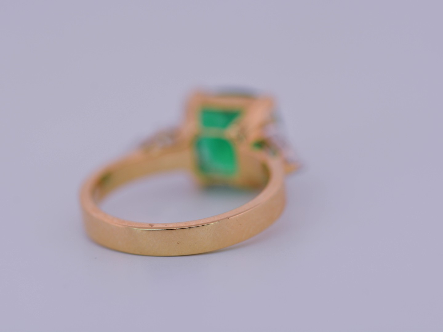 Quality ring with 1 emerald of +-3.00CT, vivid green + 2 pear-shaped diamonds of +-1.00CT, color: F-G and clarity: VS. Set in 18kt yellow gold. Ring size: 52-54.