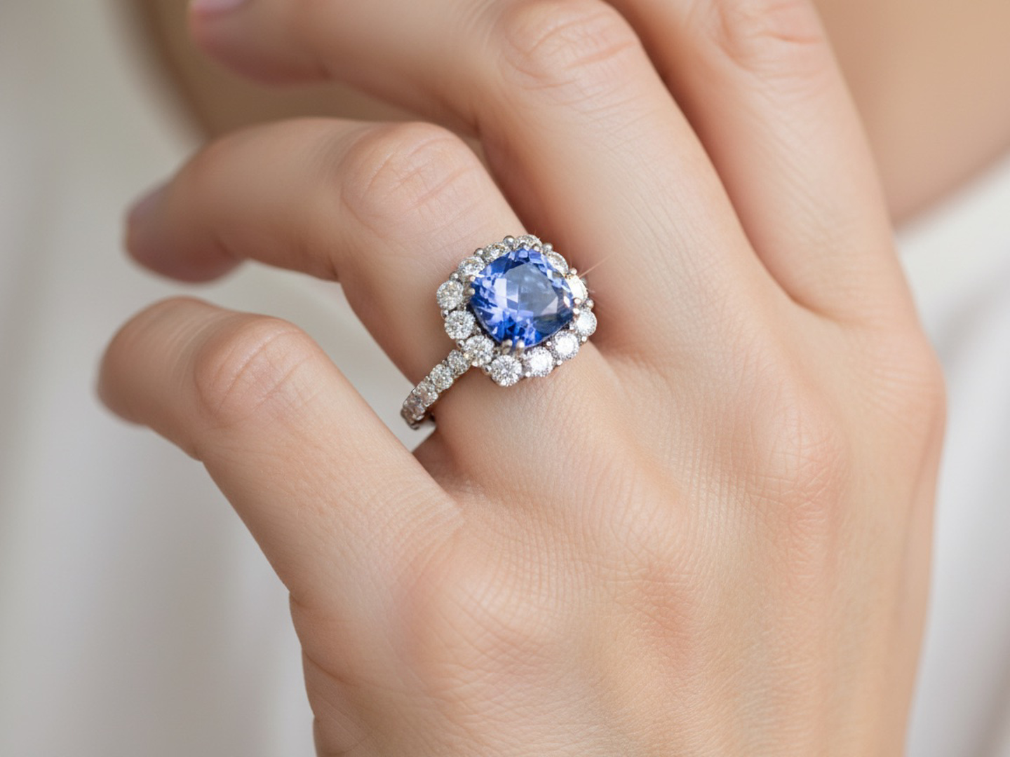 The rare violet-blue brilliance of the tanzanite is magnificently framed by a halo of dazzling, exceptional white diamonds. A timeless jewel radiating elegance and prestige, designed to be a centrepiece in any distinguished collection.