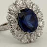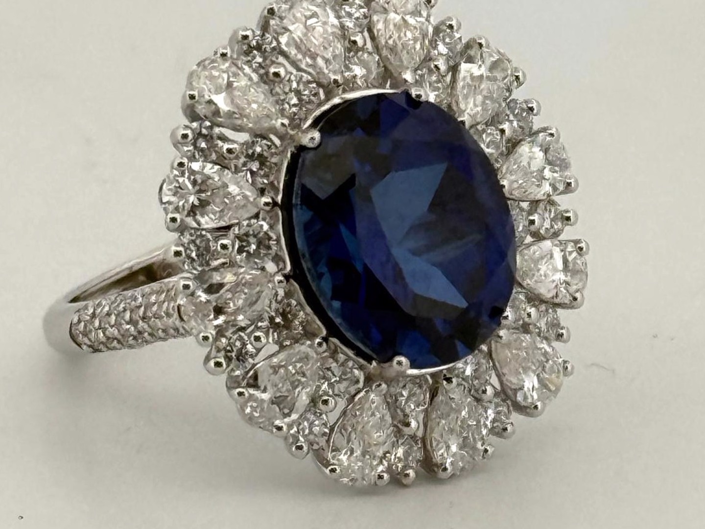 Ring with sapphire: 5.75CT, pear-shaped and brilliant-cut diamond, total: 2.50CT. Color: D-F-G and clarity: VS. Set in 14kt white gold