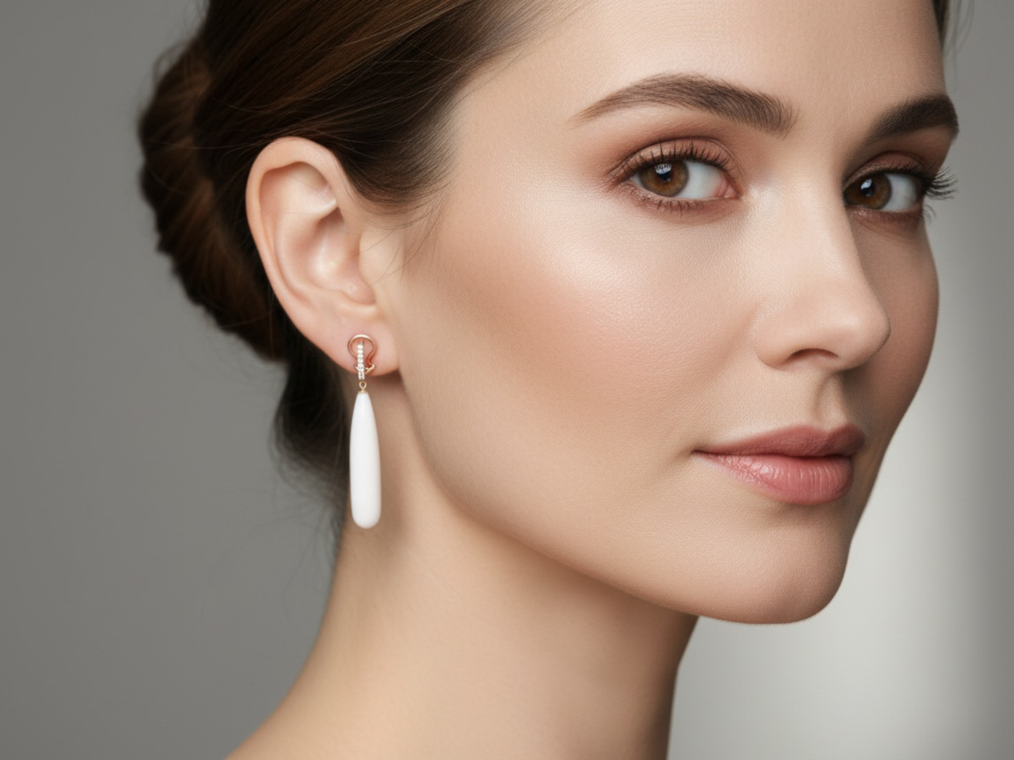 Refined pair of long drop earrings crafted in 18-karat yellow gold, featuring two white agate stones with a soft, milky sheen. The clip fastenings are delicately set with 18 small brilliant-cut diamonds, adding a subtle sparkle to the elegant design.