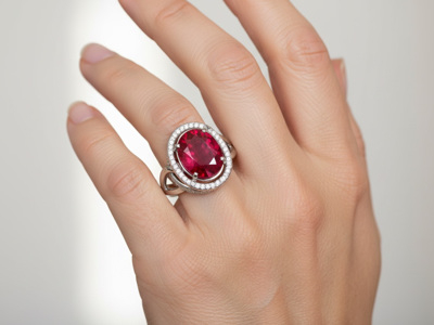 Ring in white gold 18kt. (marked 750) + 1 ruby of 7ct. + 78 diamonds 1.10ct