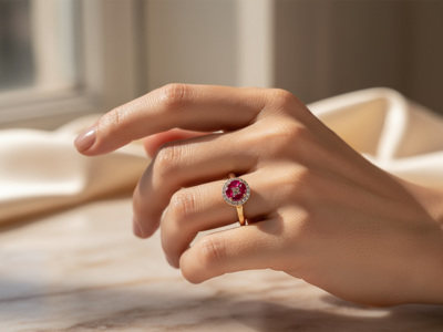 Elegant ring set with 4 vivid red rubies: approximately 0.50CT, surrounded by 18 small brilliant diamonds + 4 princess cut diamonds.